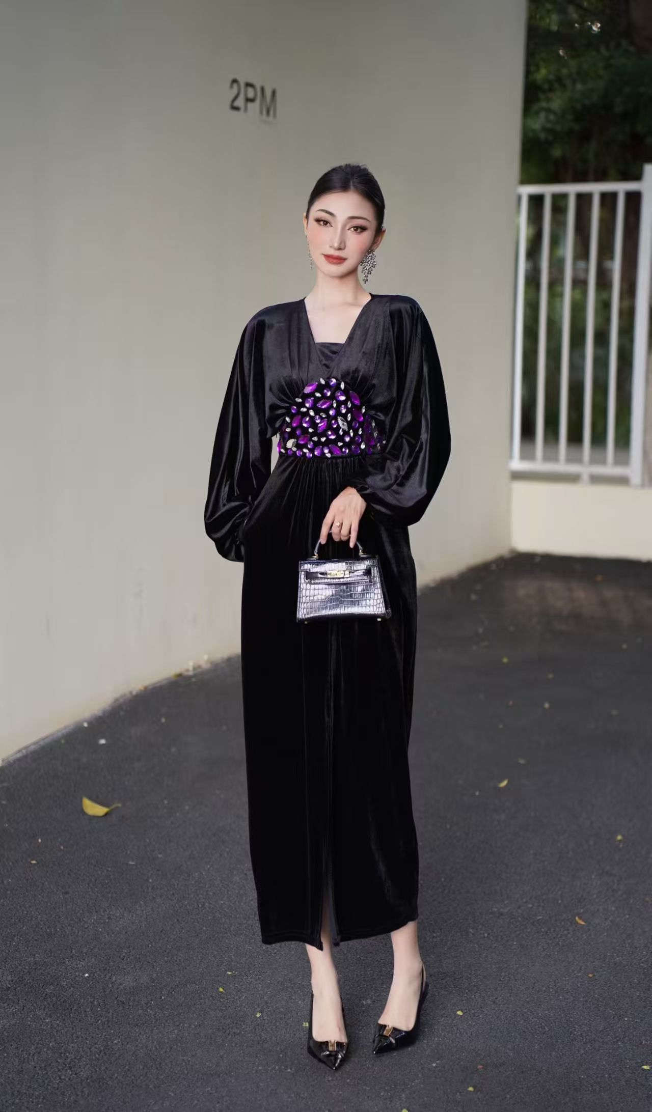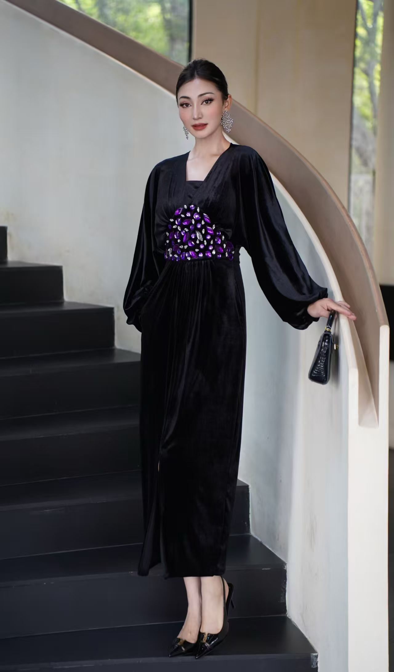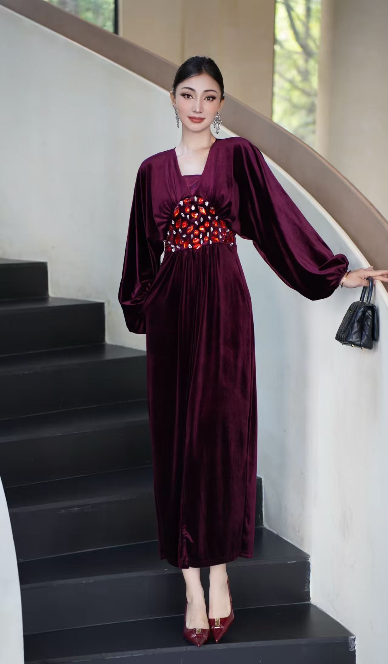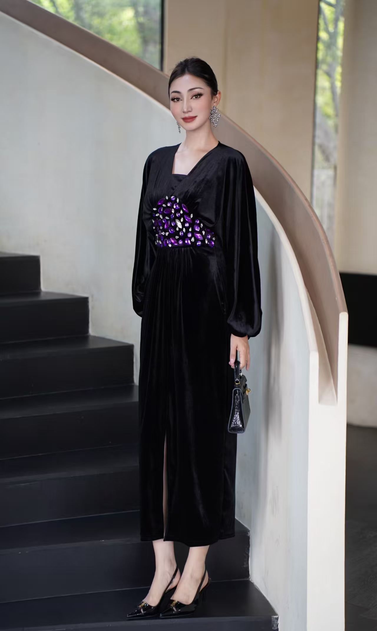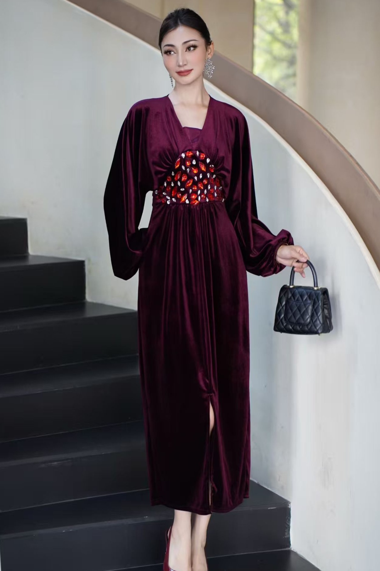 MY15120# 法式轻奢风重工彩钻V领收腰连衣裙高级感气质名媛开叉长裙女裝貨源服裝批發