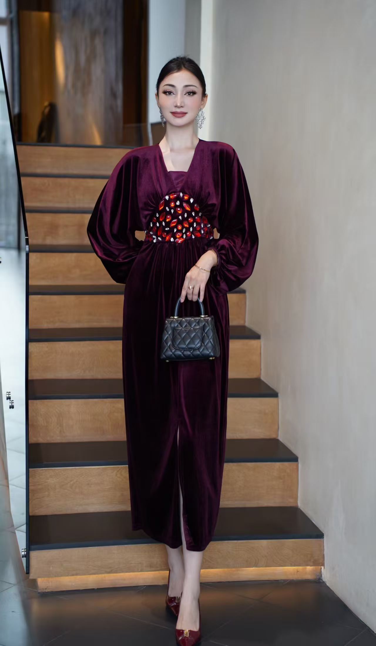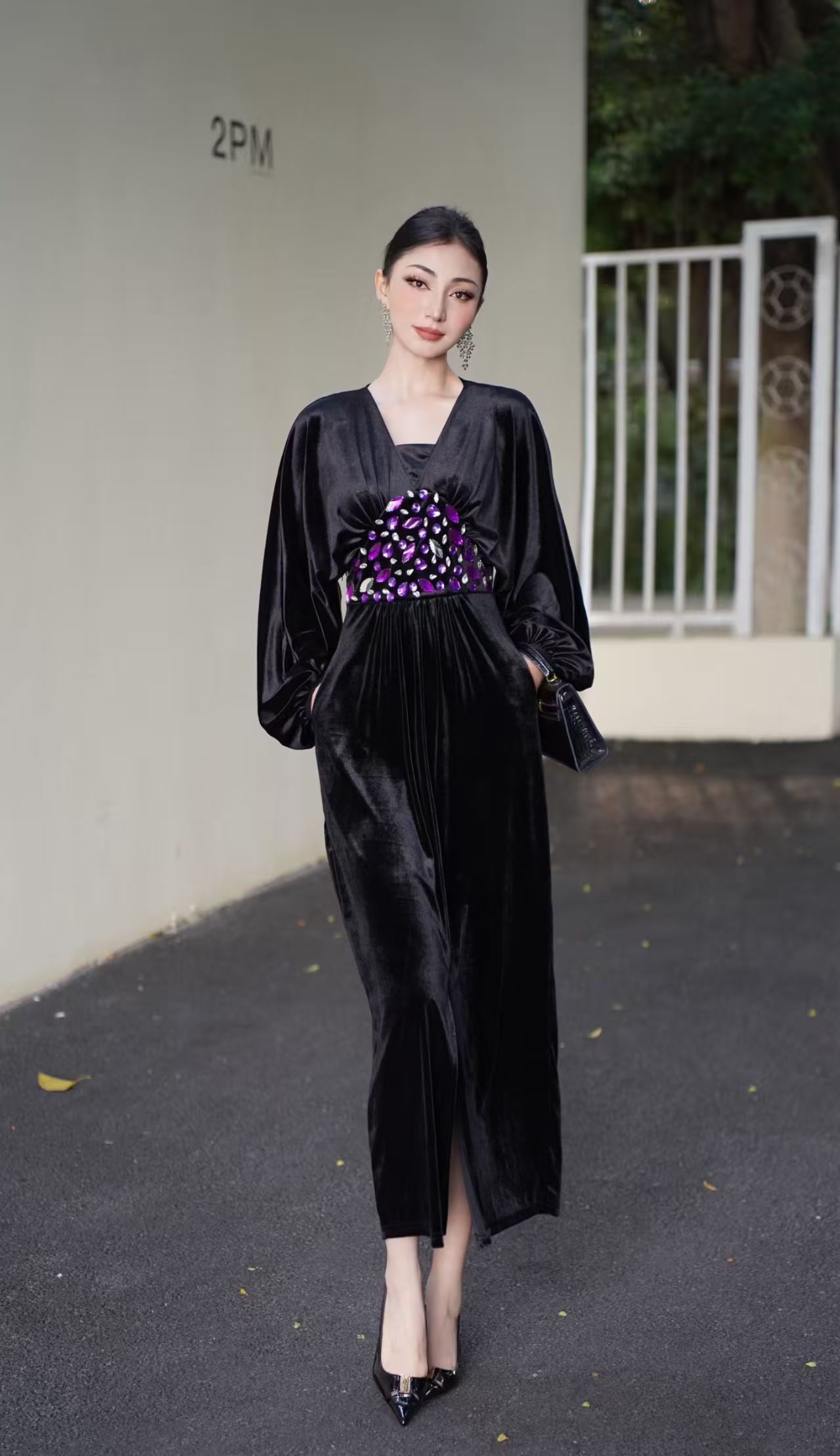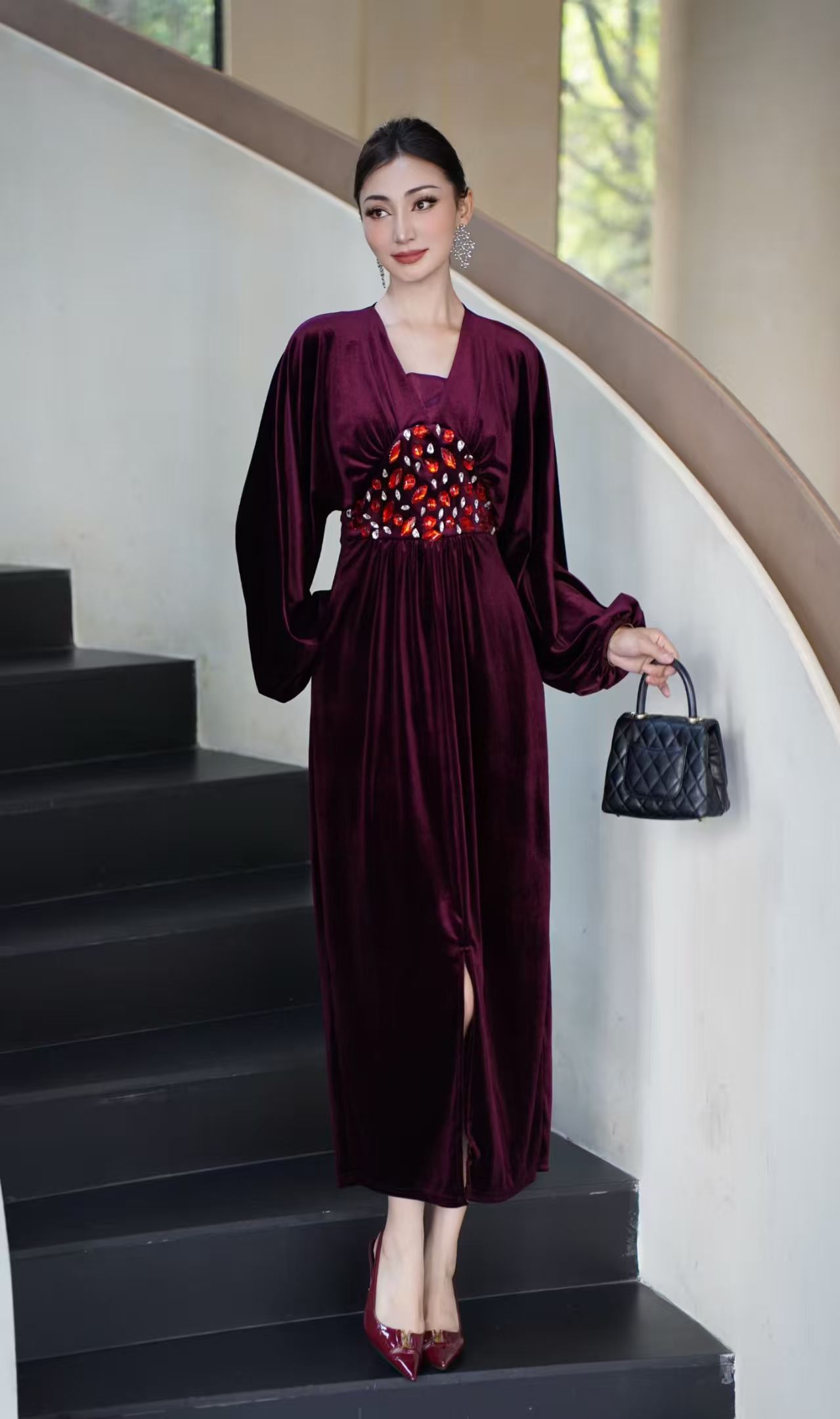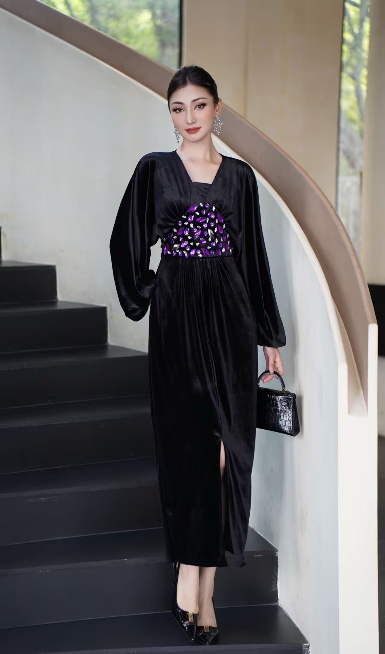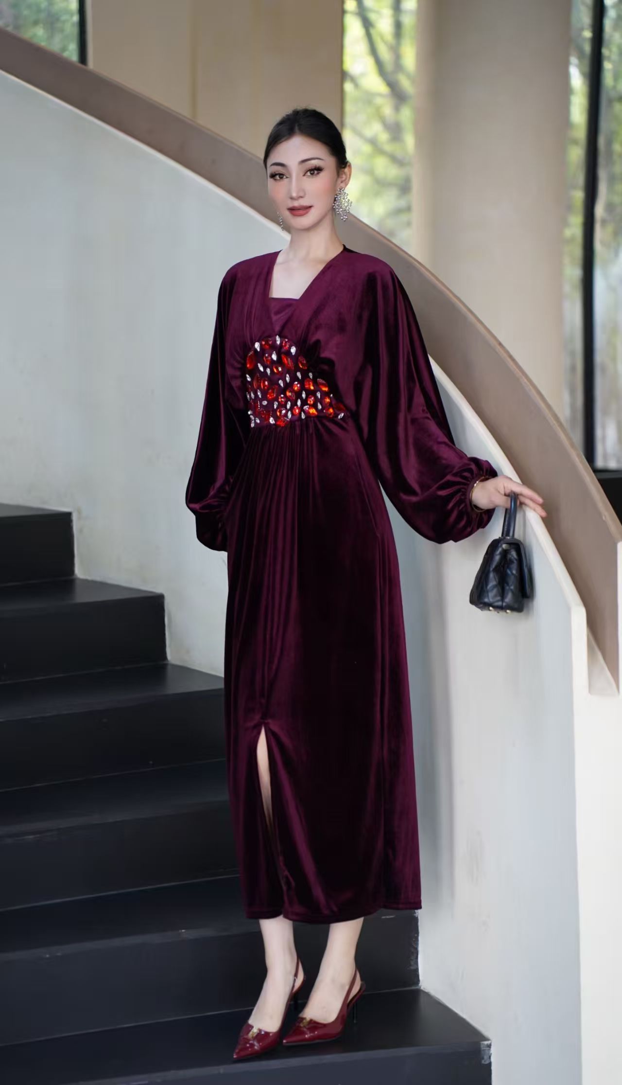 MY15120# 法式轻奢风重工彩钻V领收腰连衣裙高级感气质名媛开叉长裙女裝貨源服裝批發