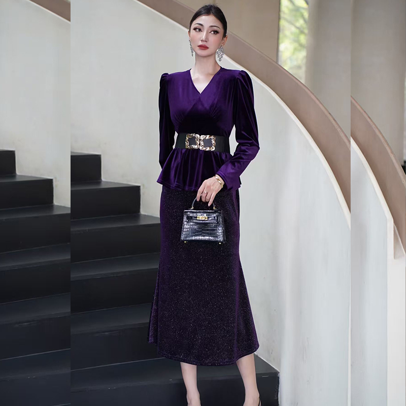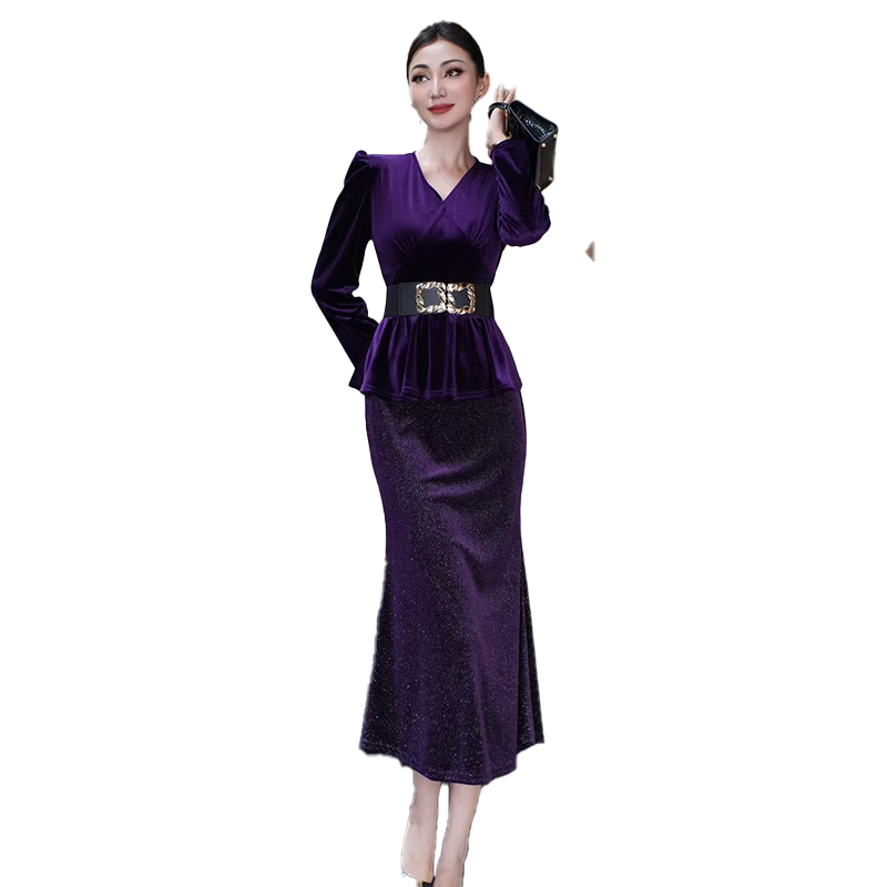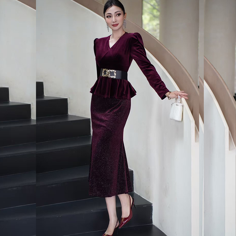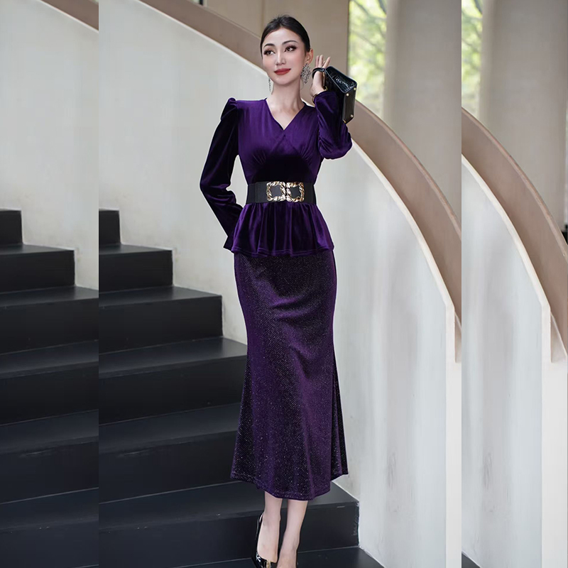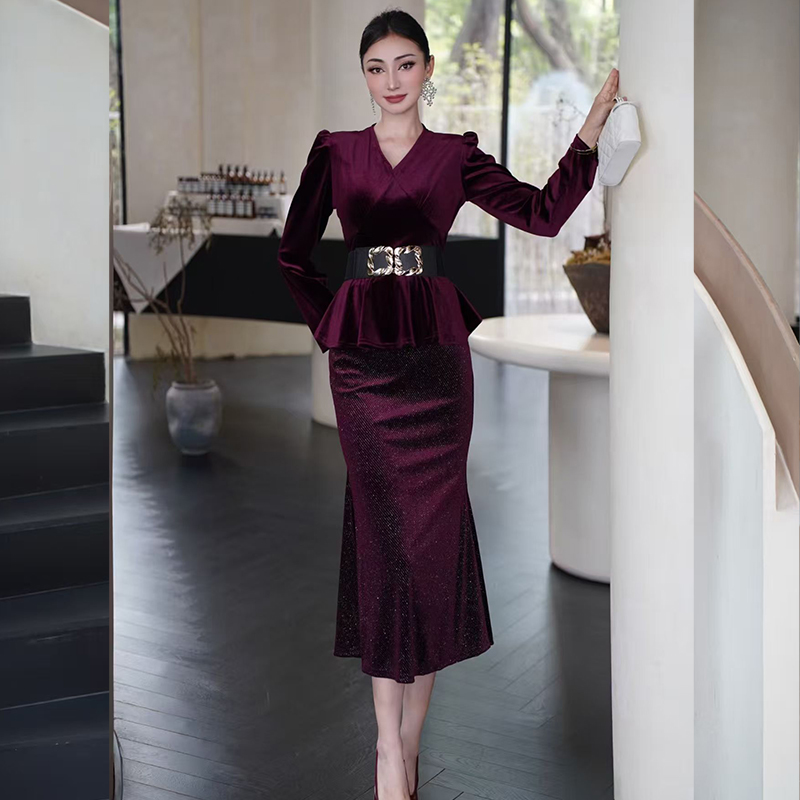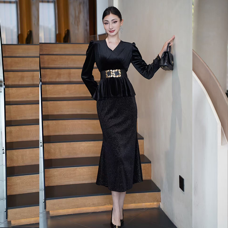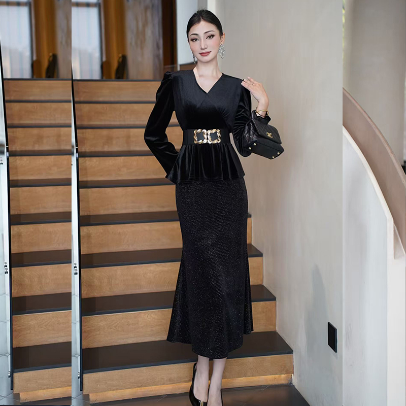 MY15121# 金丝绒连衣裙套装新款高端精致收腰显瘦气质包臀鱼尾裙子女裝貨源服裝批發