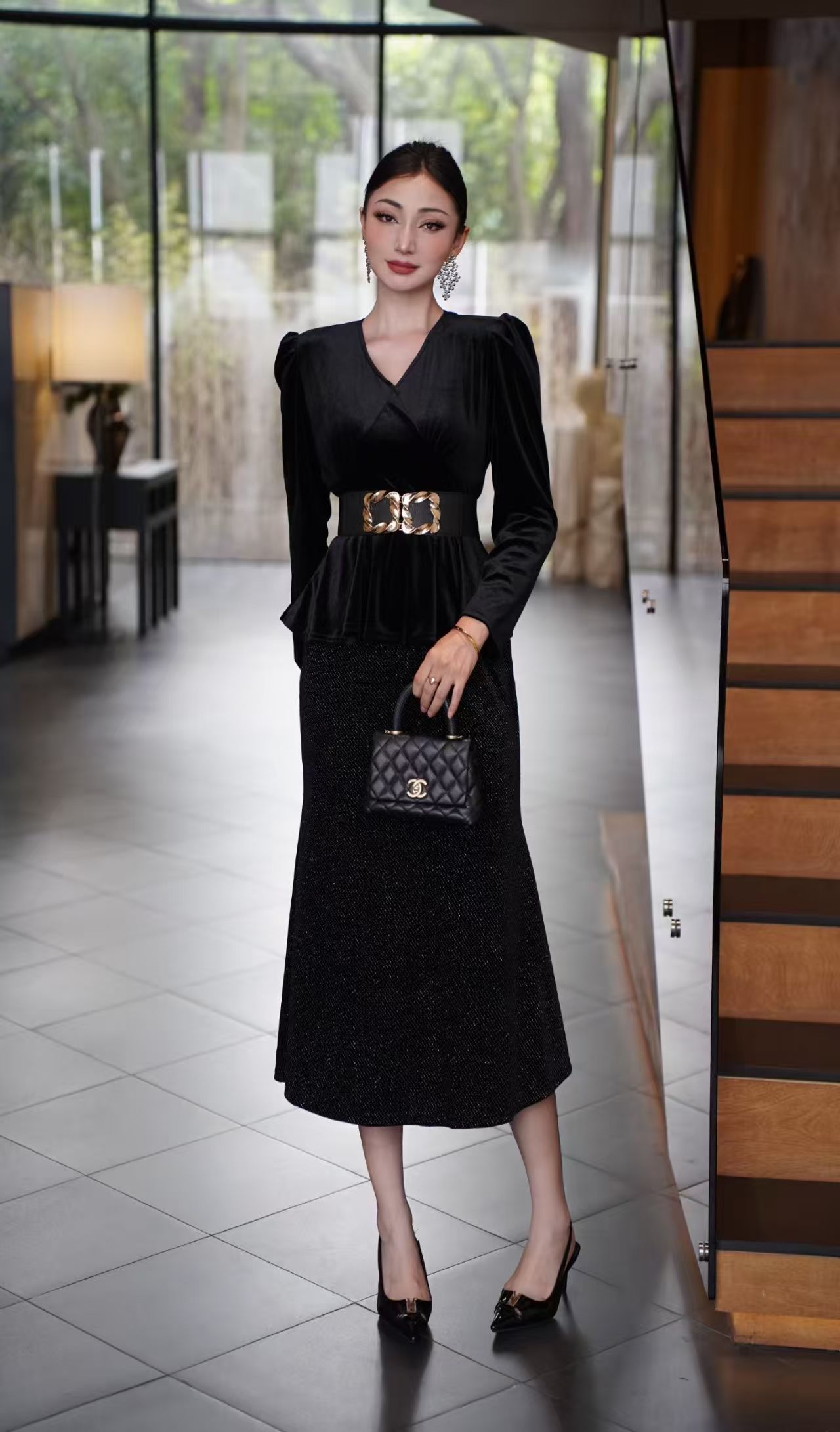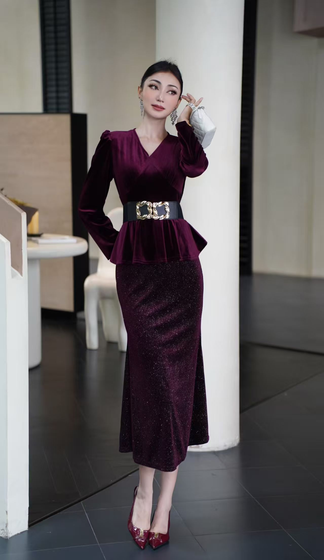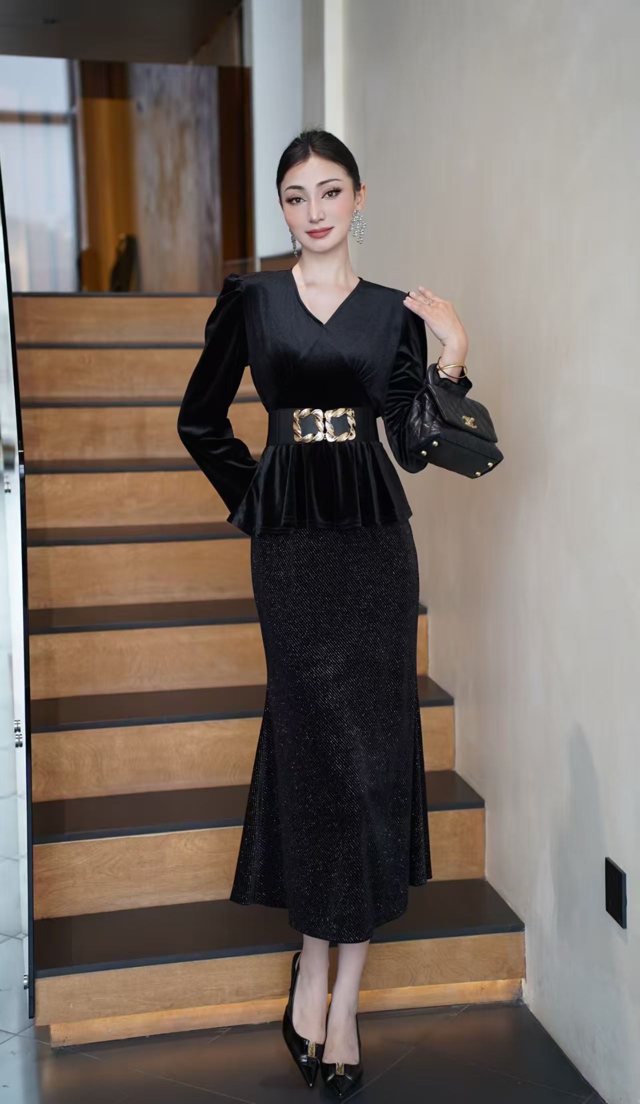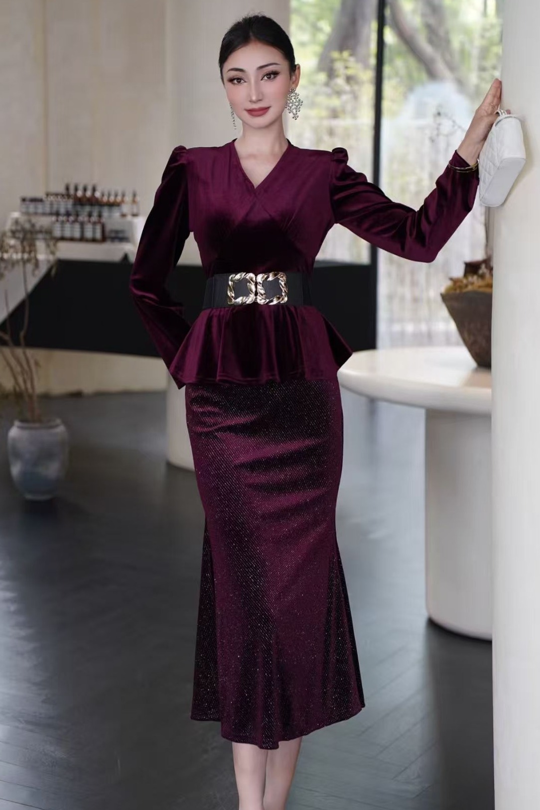 MY15121# 金丝绒连衣裙套装新款高端精致收腰显瘦气质包臀鱼尾裙子女裝貨源服裝批發