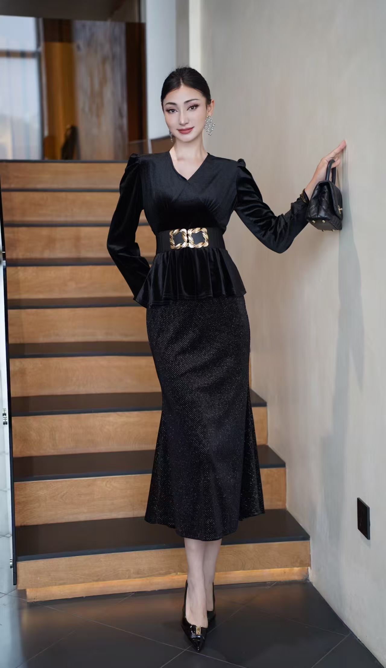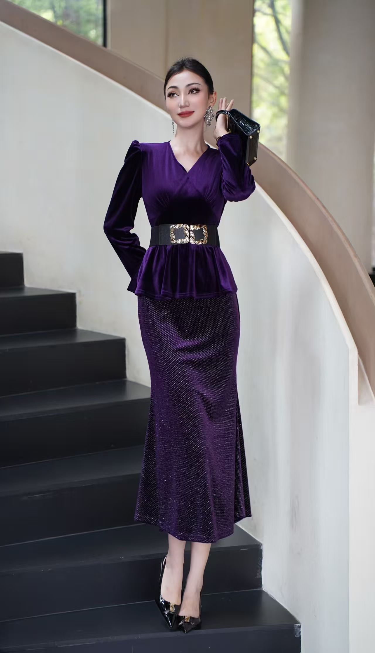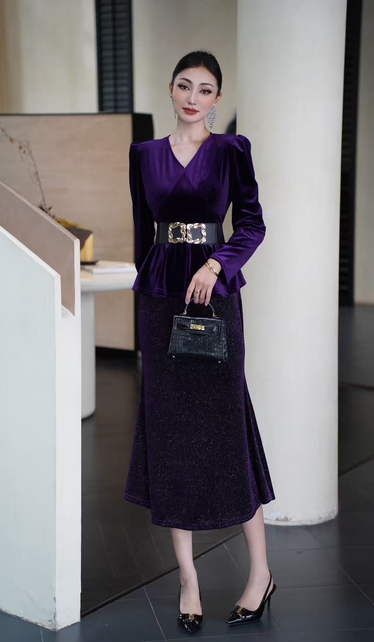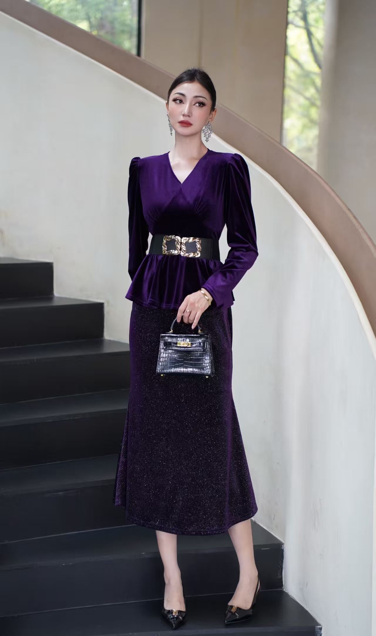MY15121# 金丝绒连衣裙套装新款高端精致收腰显瘦气质包臀鱼尾裙子女裝貨源服裝批發
