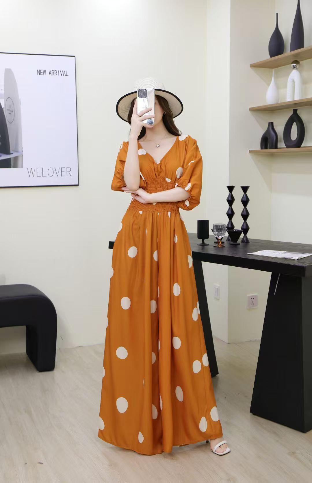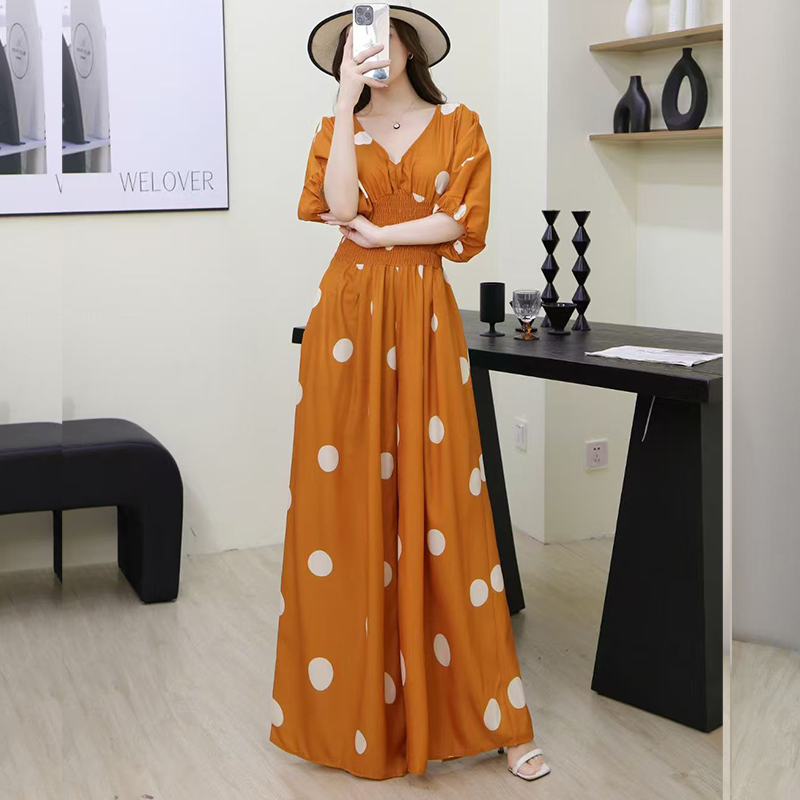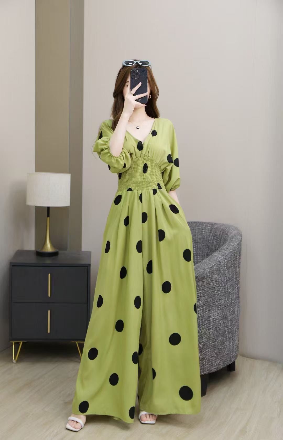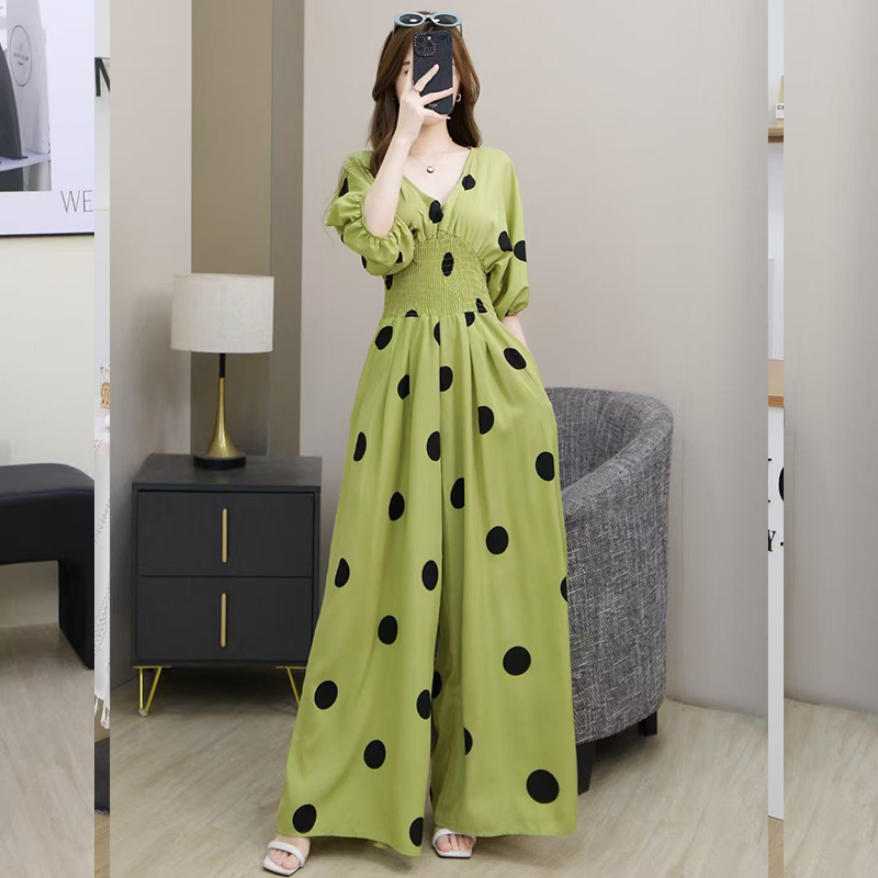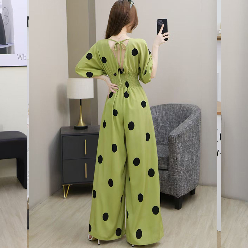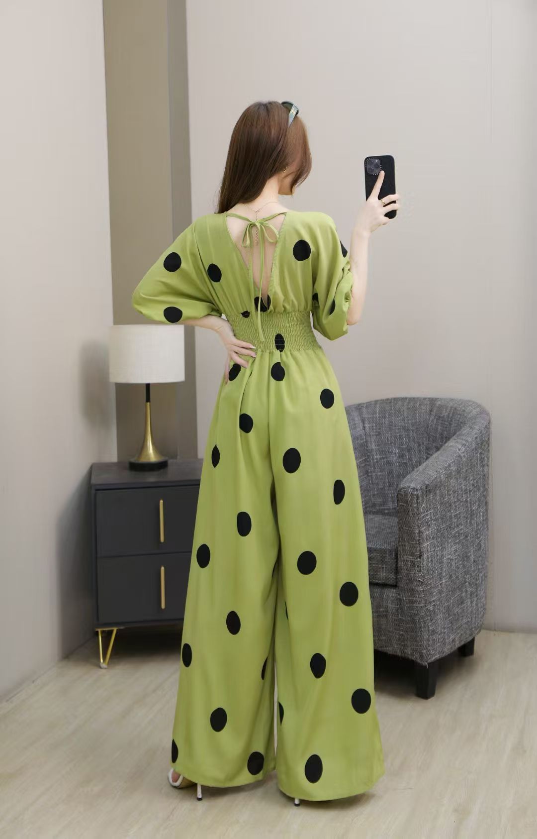 MY15124# 喇叭袖波点印花V领连体裤复古海边度假沙滩宽腿阔腿裤连衣裤夏季女裝貨源服裝批發