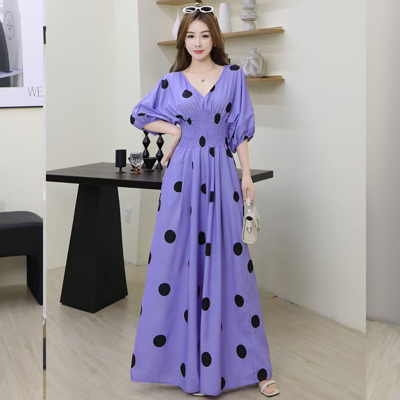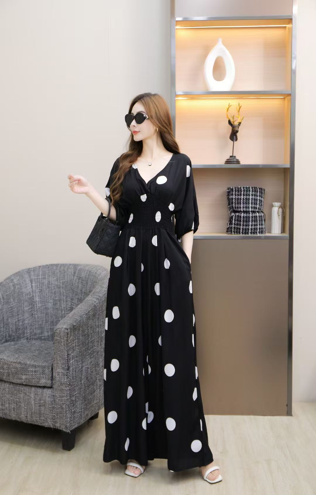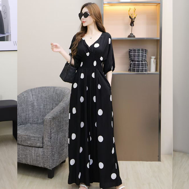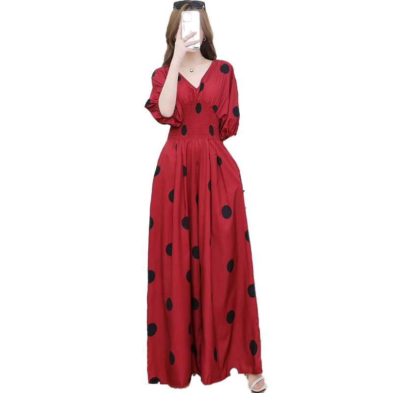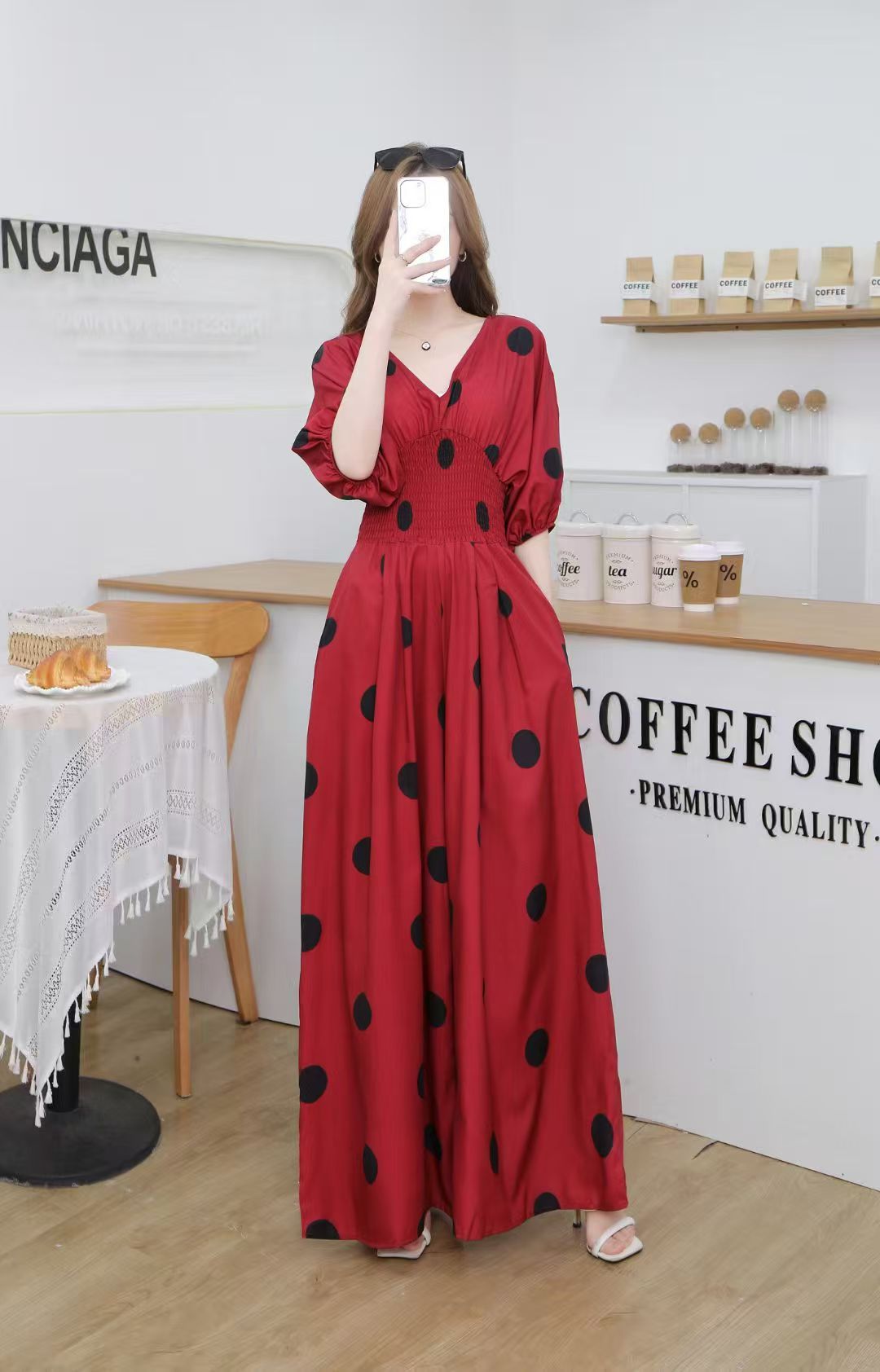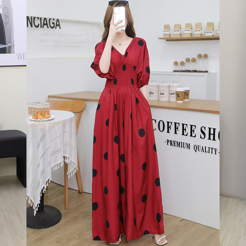 MY15124# 喇叭袖波点印花V领连体裤复古海边度假沙滩宽腿阔腿裤连衣裤夏季女裝貨源服裝批發