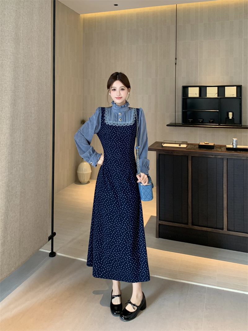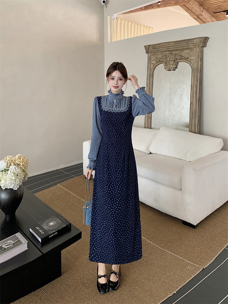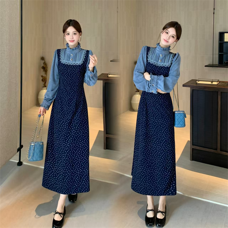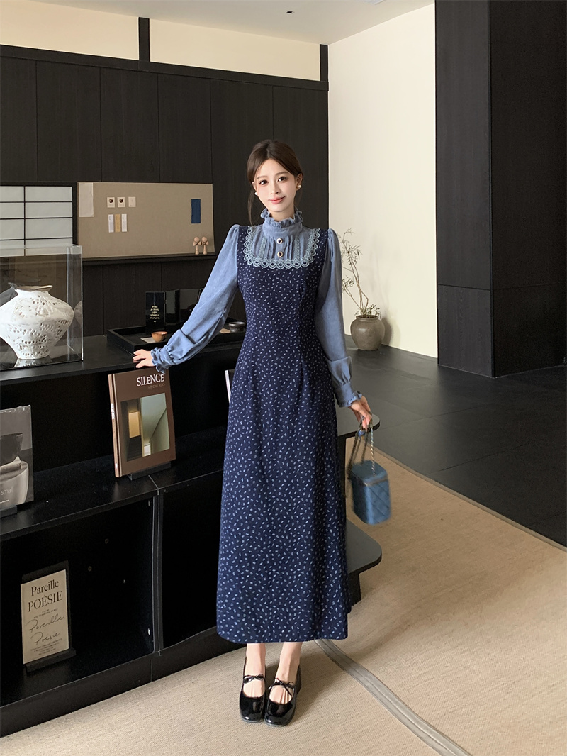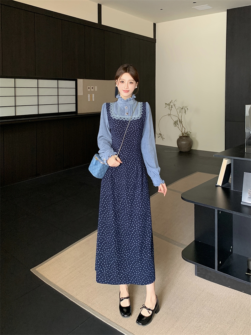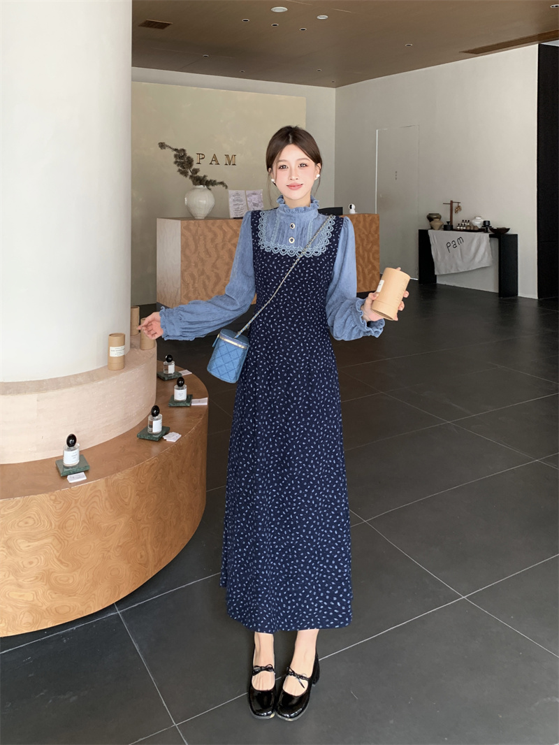 MY15128# 大码海兰花法式设计感碎花假两件拼接长袖连衣裙女裝貨源服裝批發