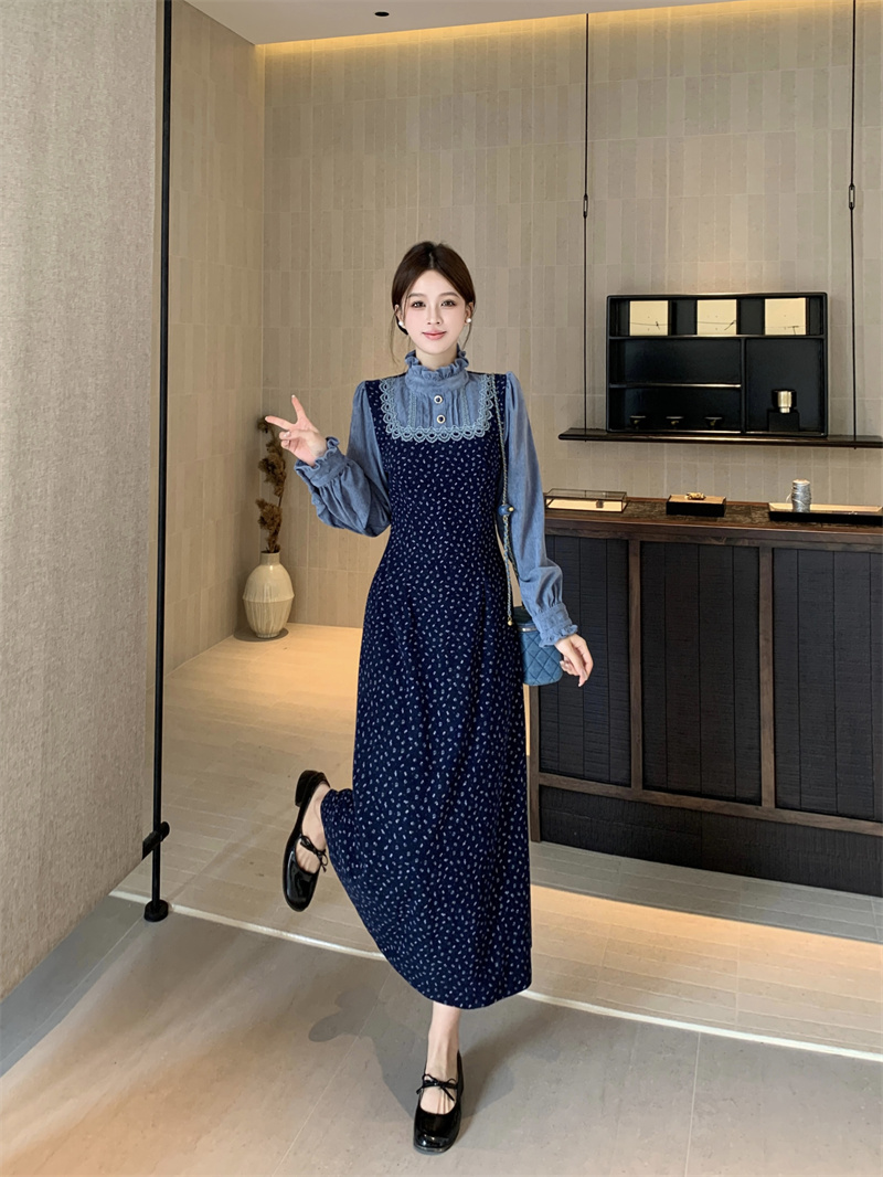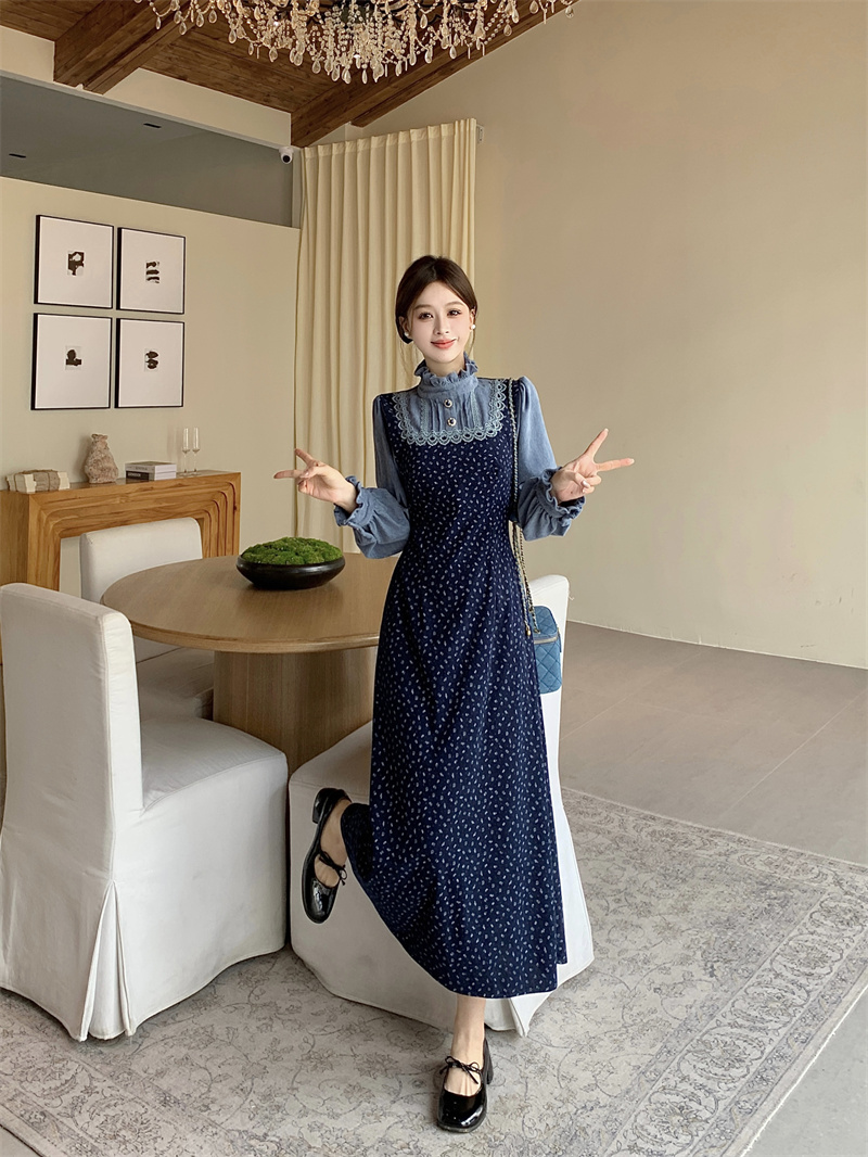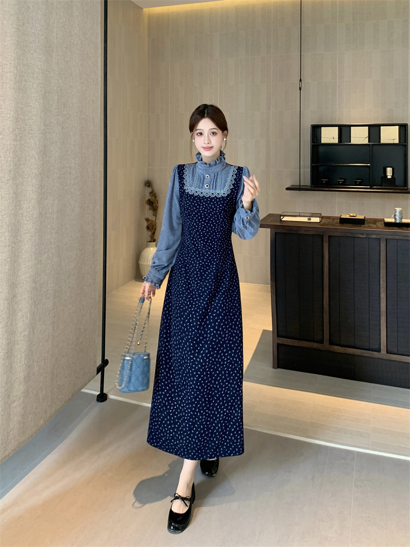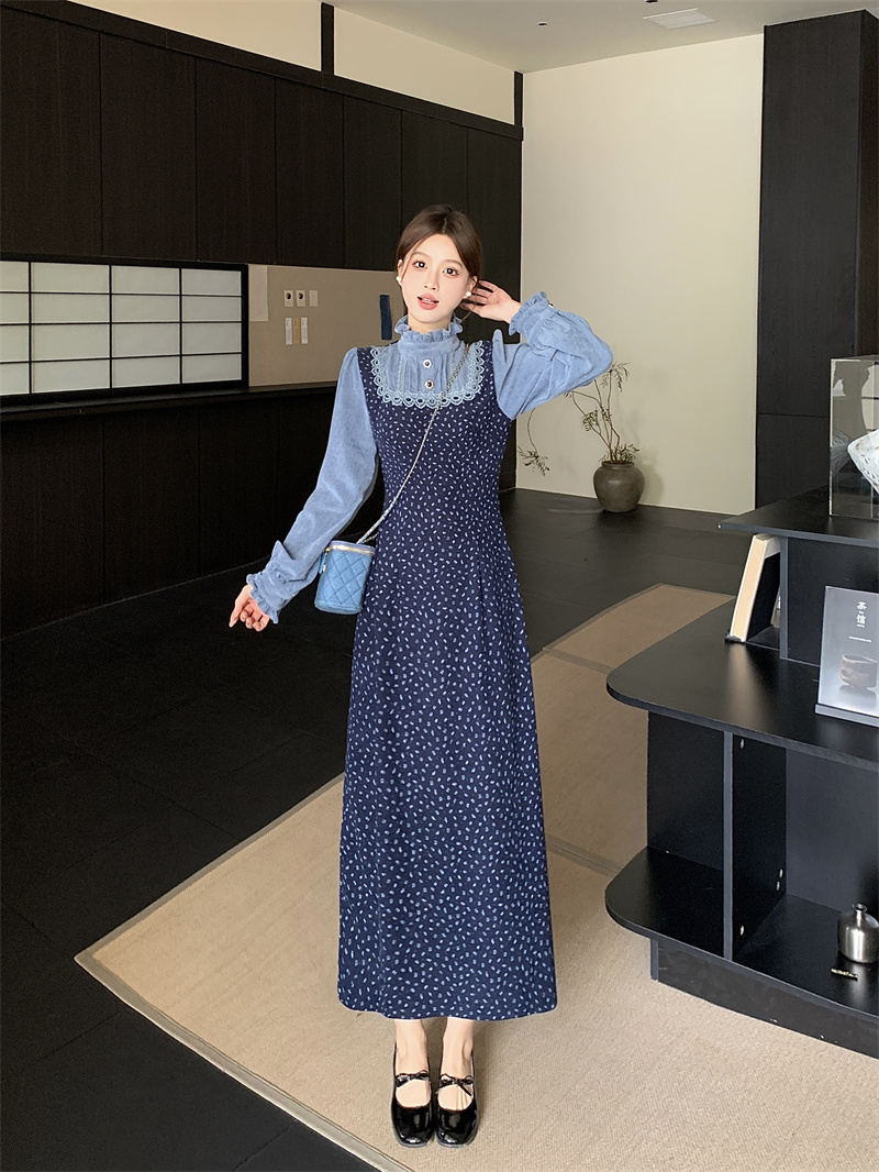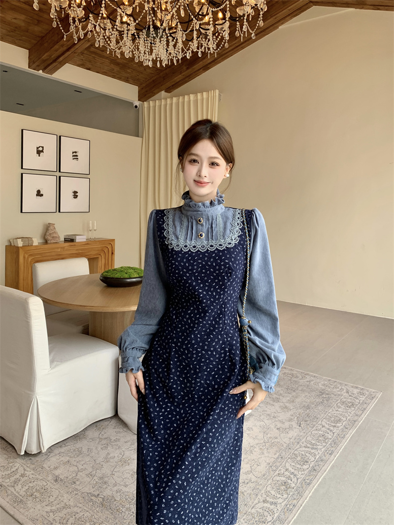 MY15128# 大码海兰花法式设计感碎花假两件拼接长袖连衣裙女裝貨源服裝批發