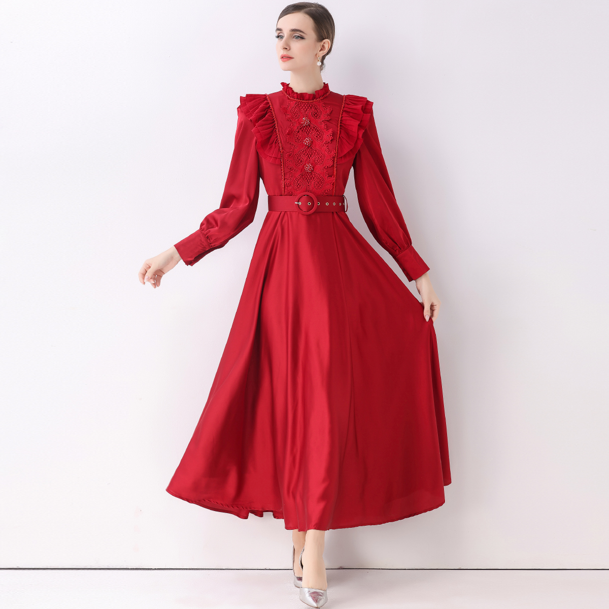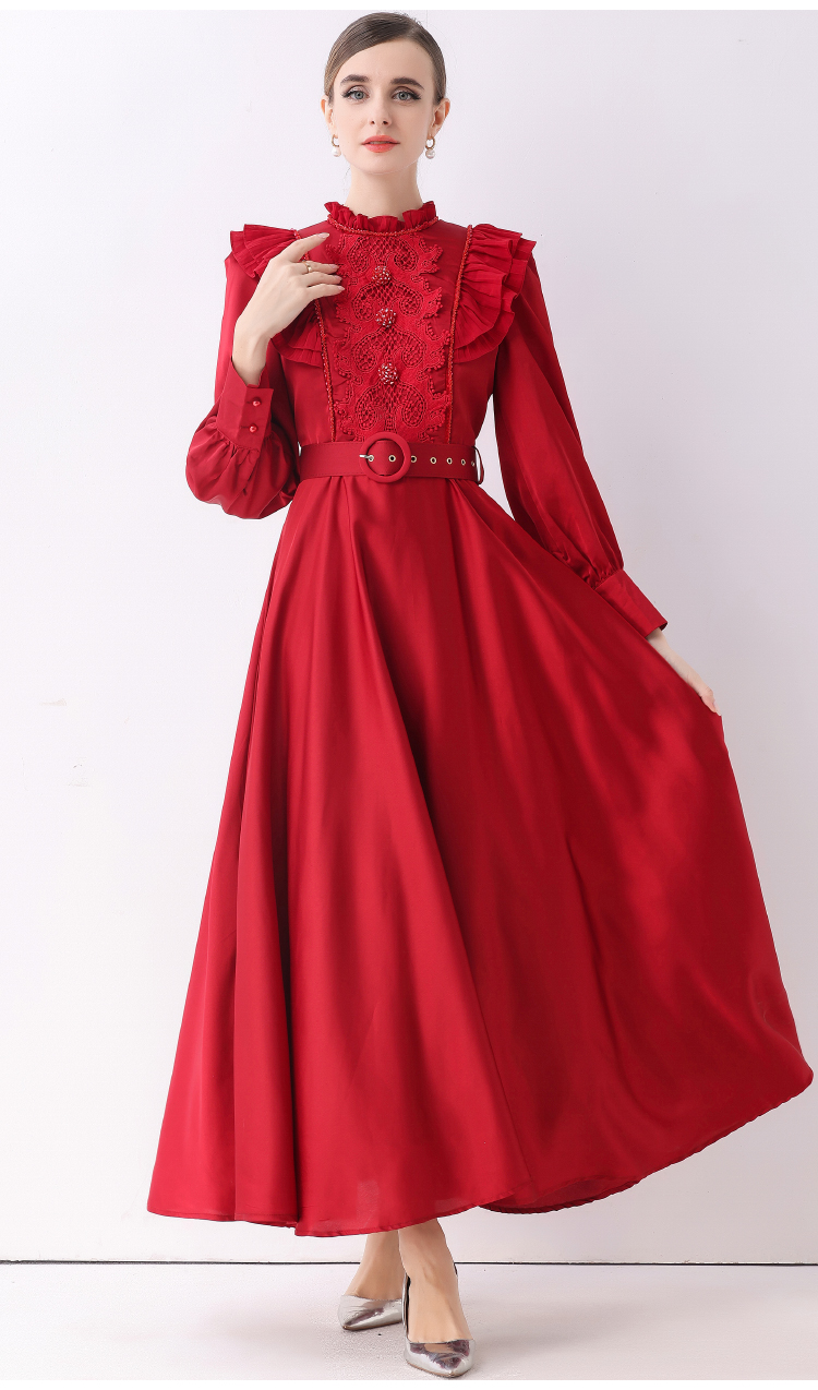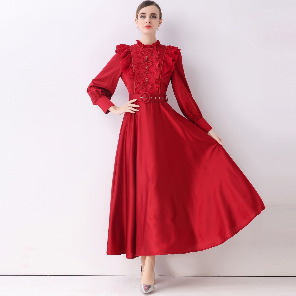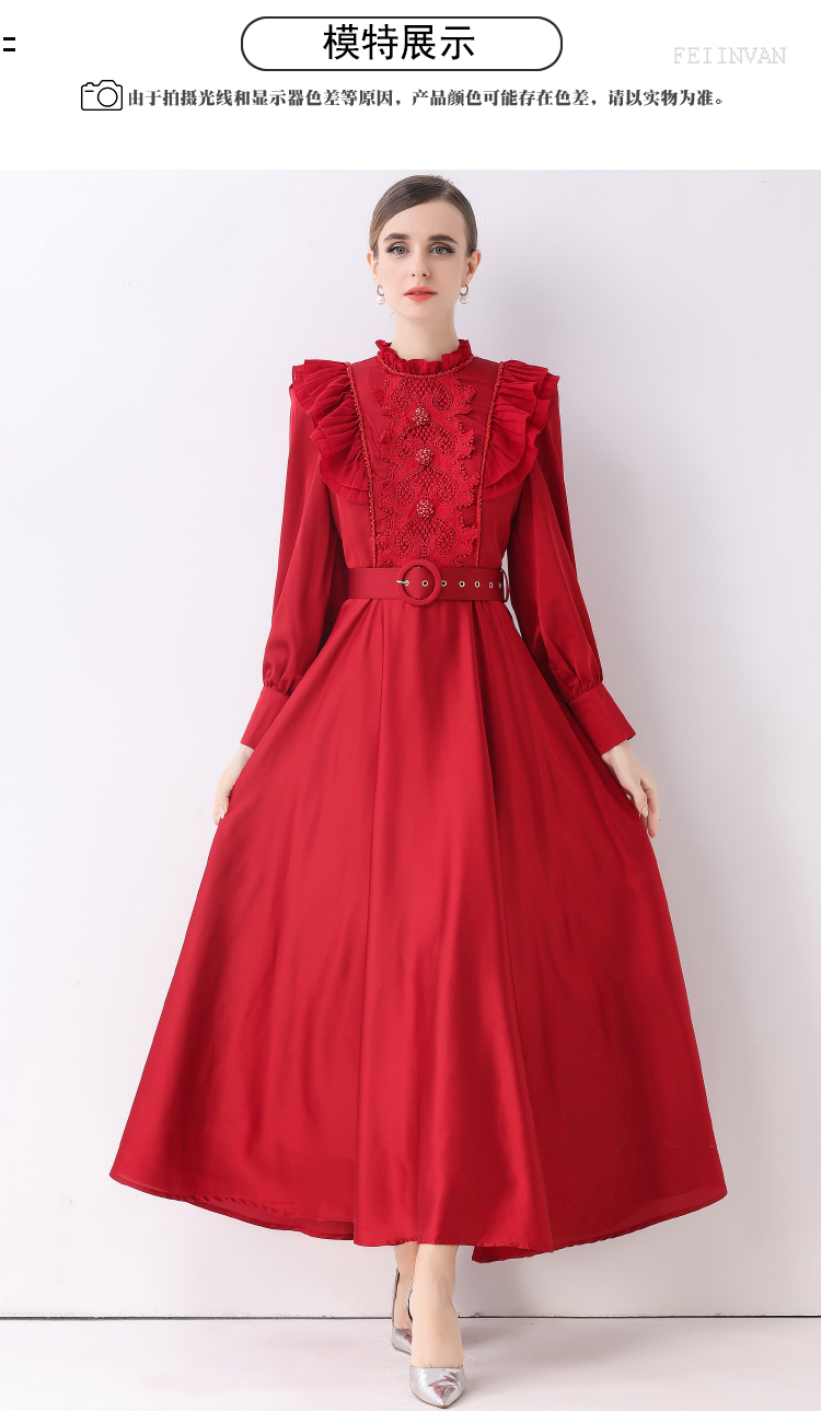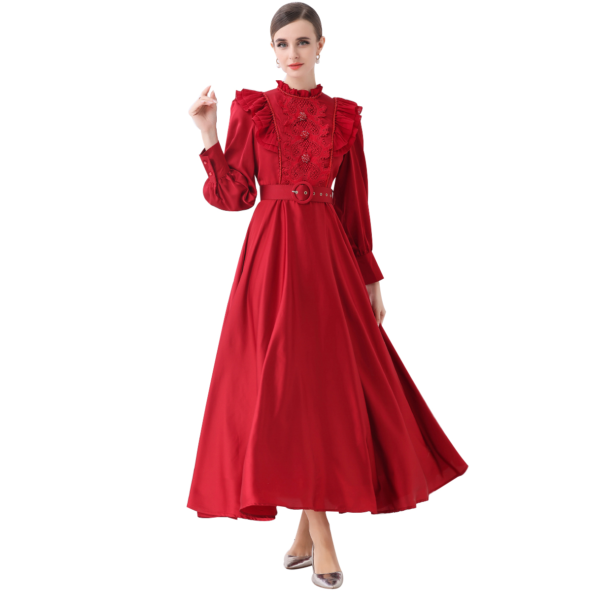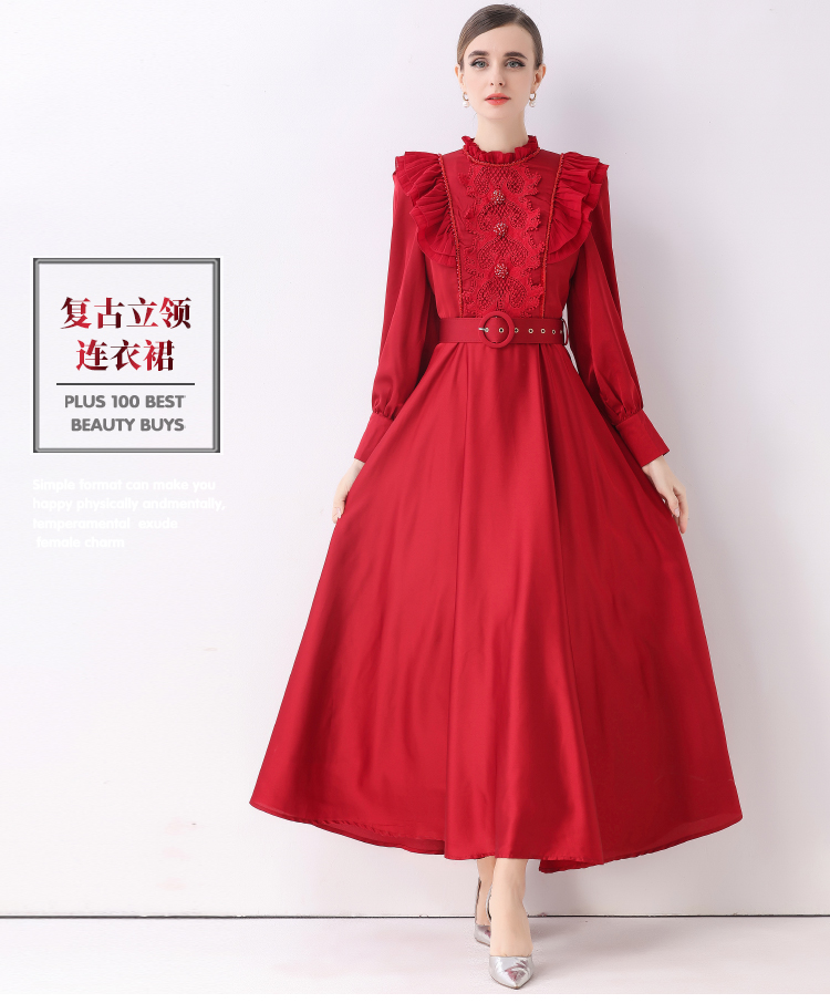 MY15150# 新款复古气质优雅立领荷叶边长袖收腰长款连衣裙长裙送腰带女裝貨源服裝批發