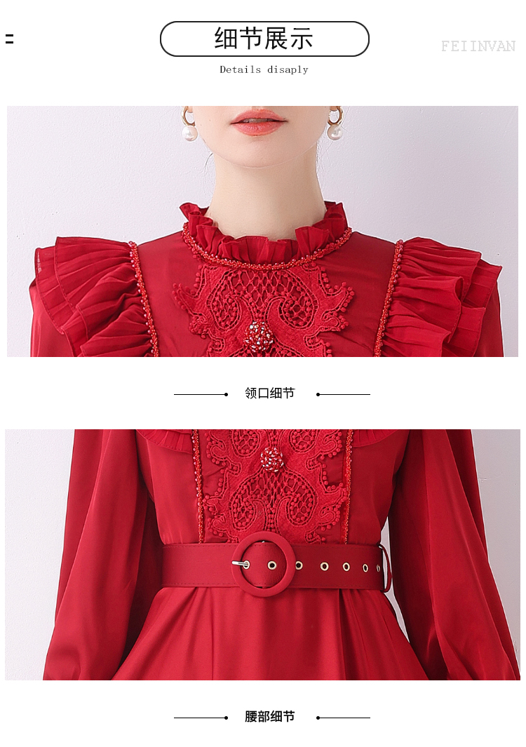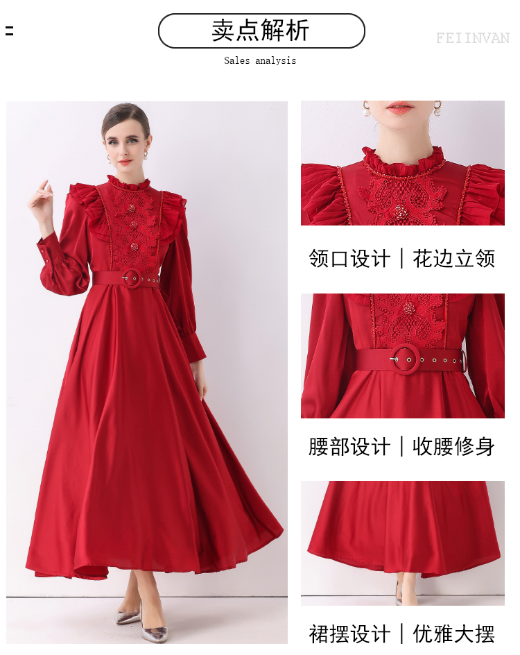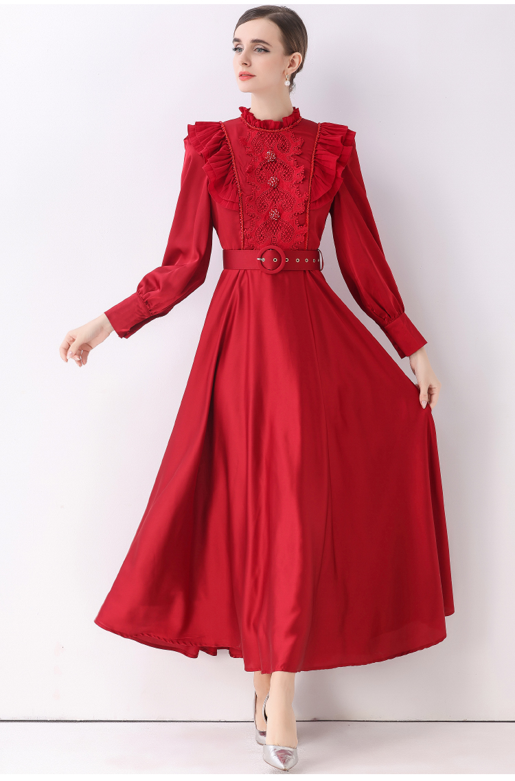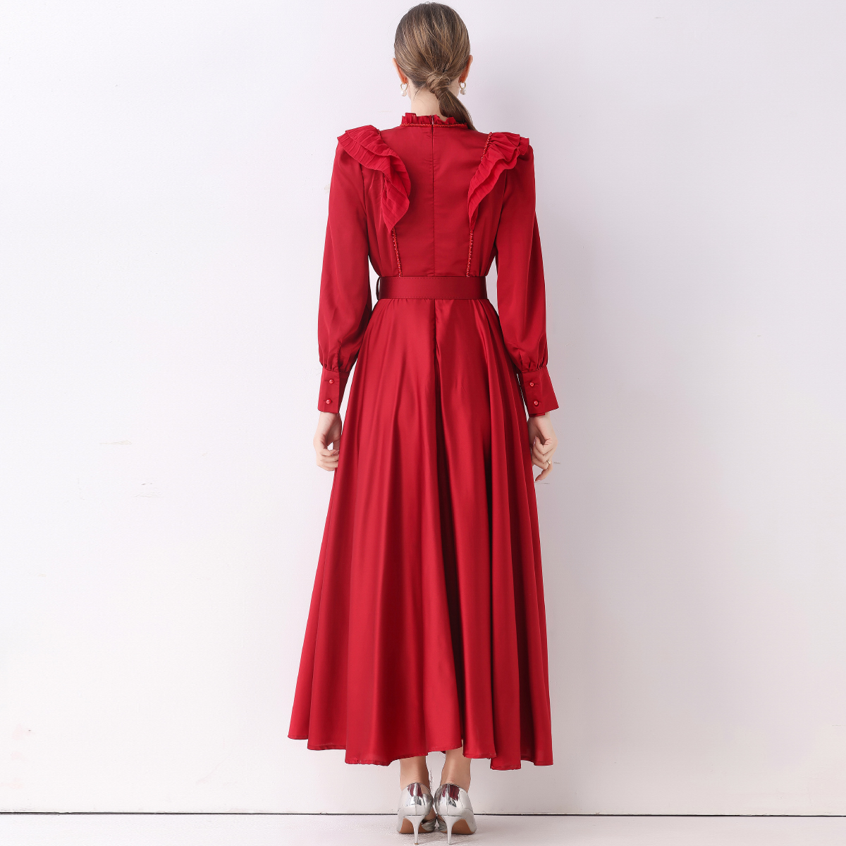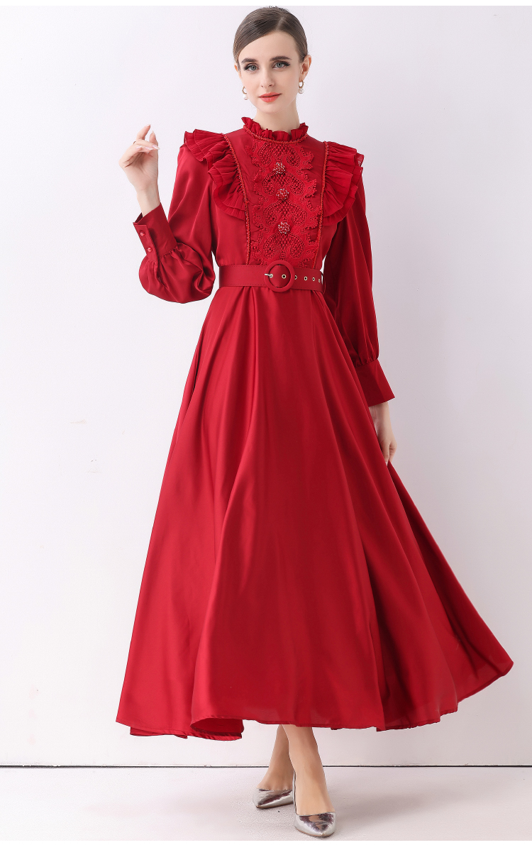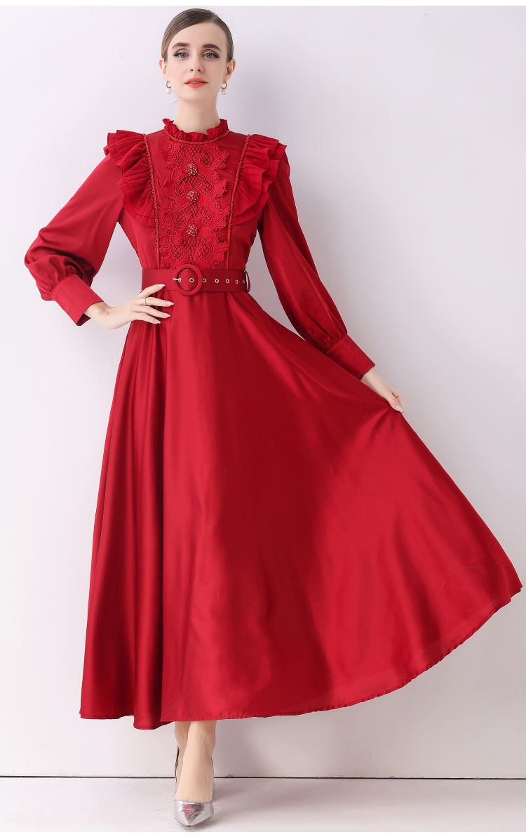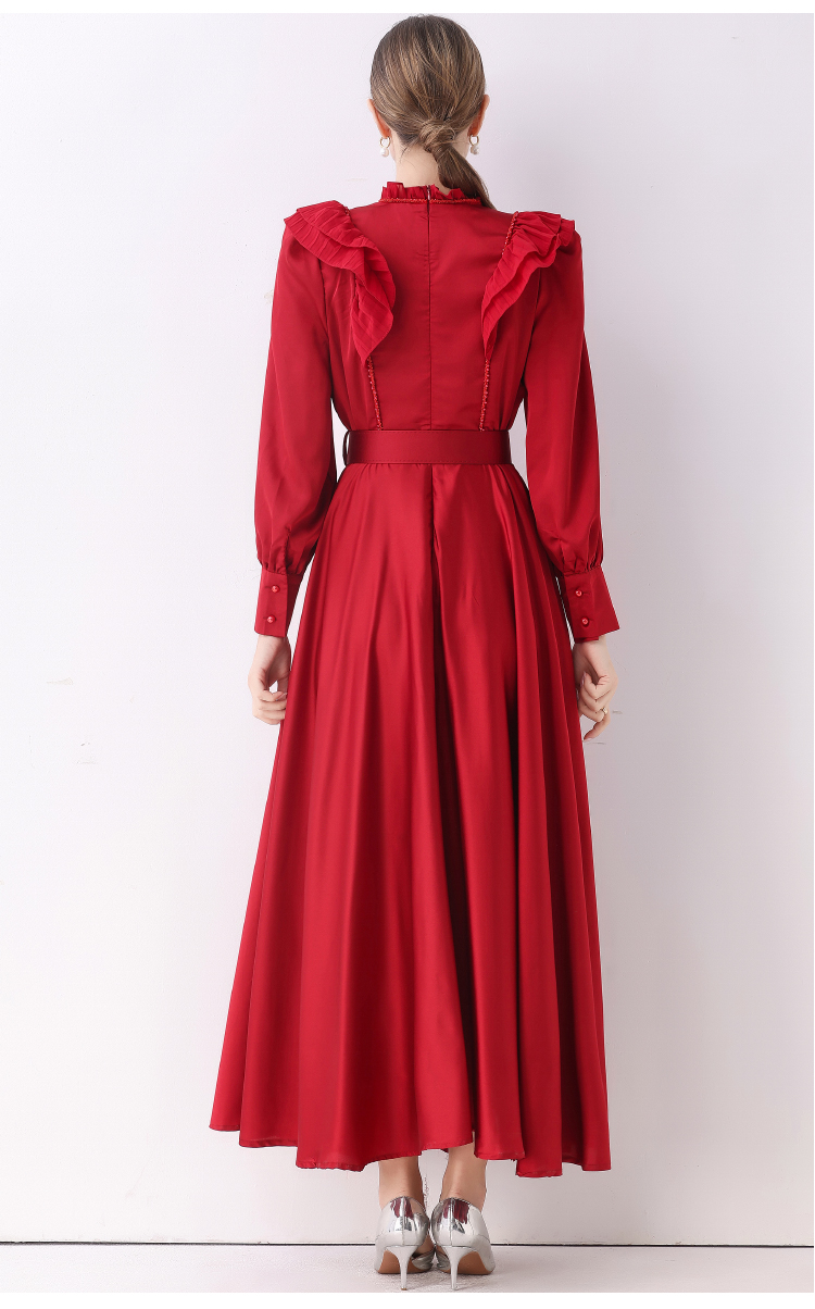 MY15150# 新款复古气质优雅立领荷叶边长袖收腰长款连衣裙长裙送腰带女裝貨源服裝批發