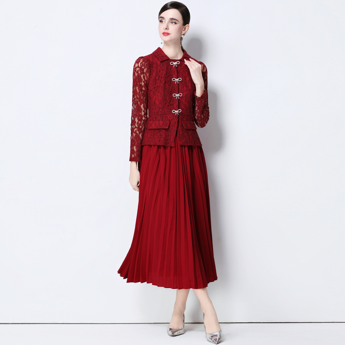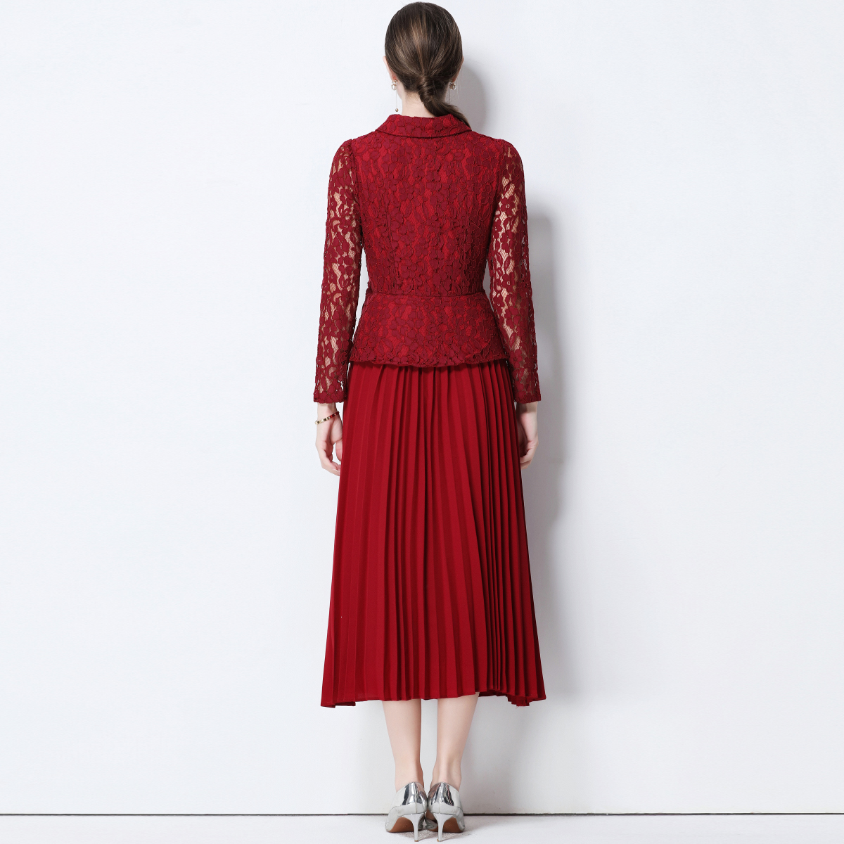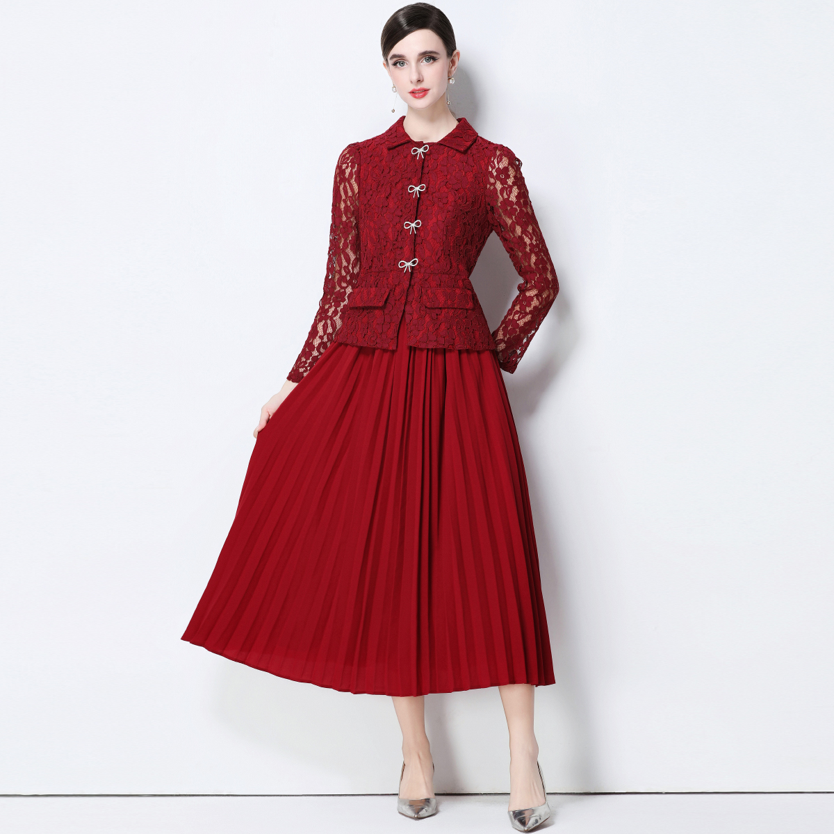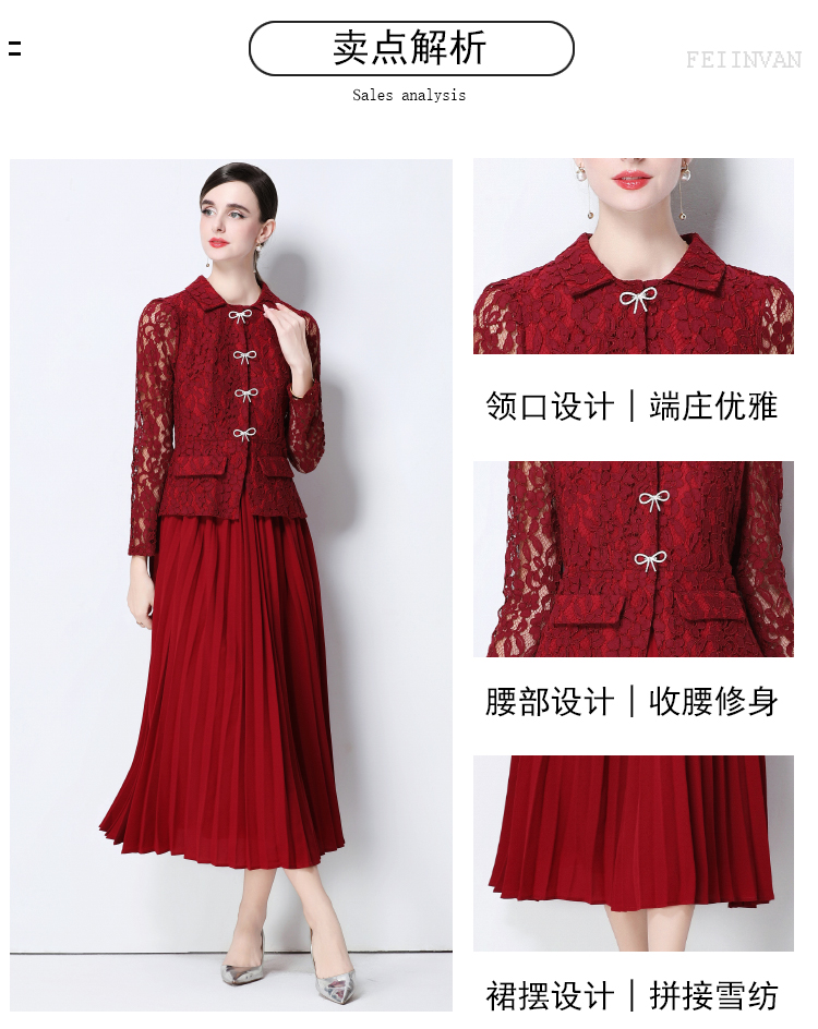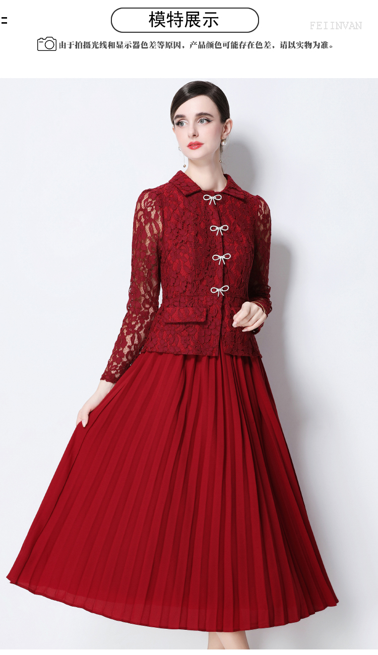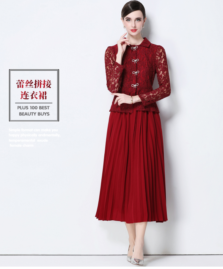 MY15153# 复古名媛御姐风蕾丝假两件连衣裙女收腰气质百褶中长裙送腰带女裝貨源服裝批發