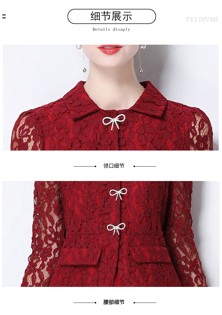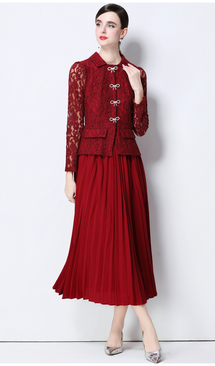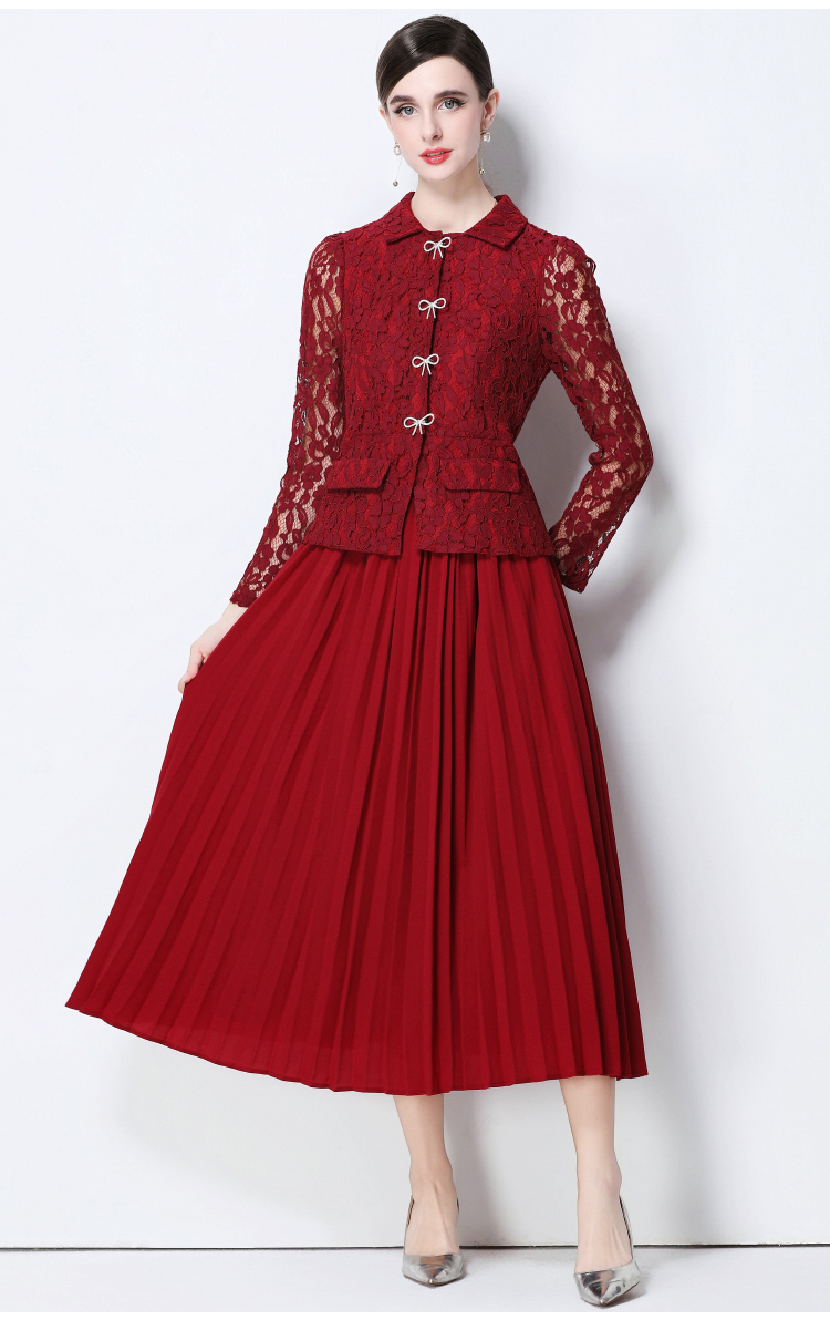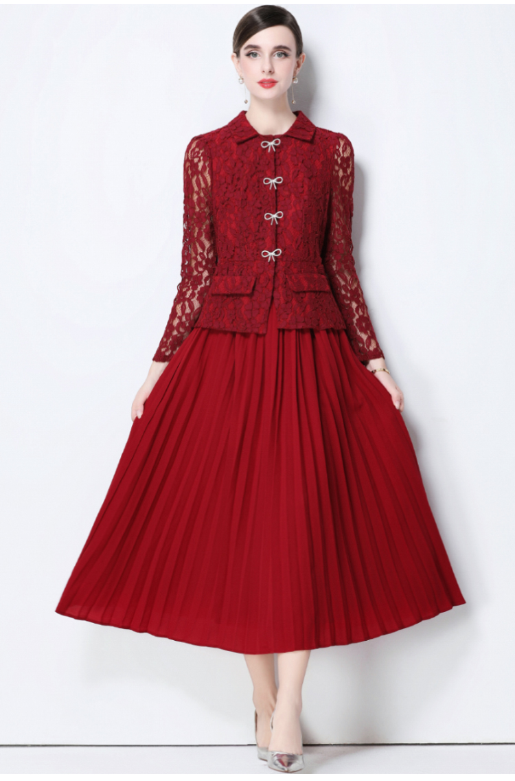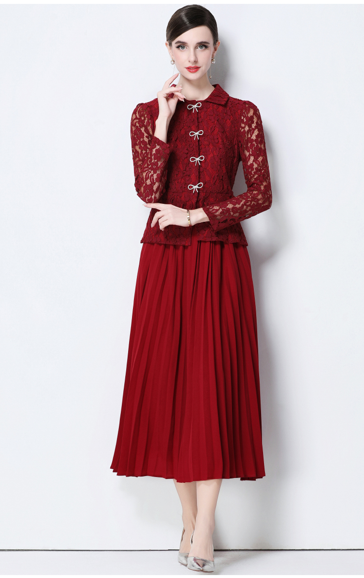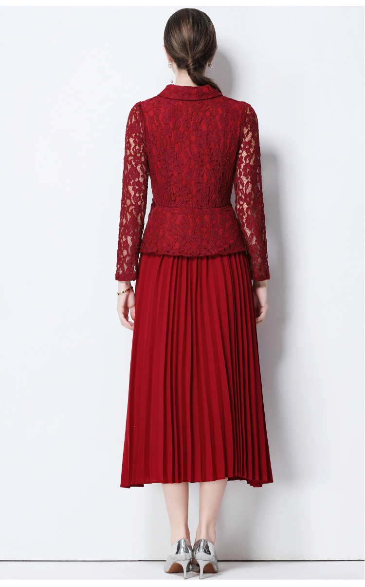 MY15153# 复古名媛御姐风蕾丝假两件连衣裙女收腰气质百褶中长裙送腰带女裝貨源服裝批發