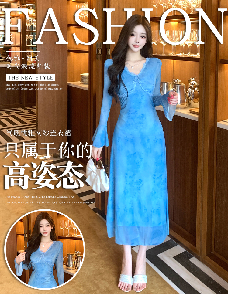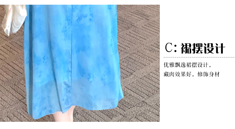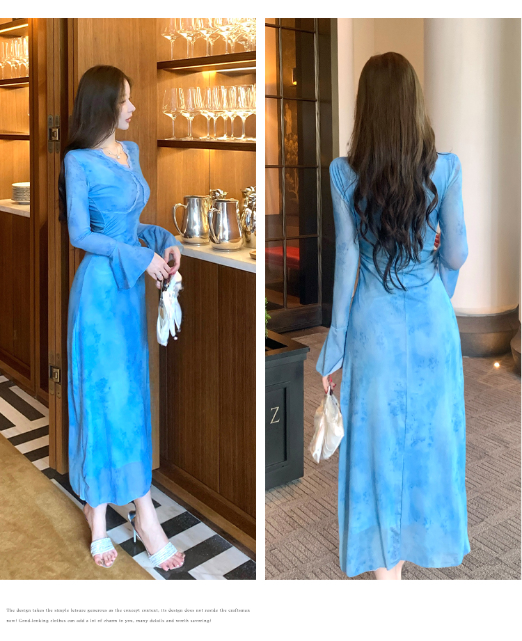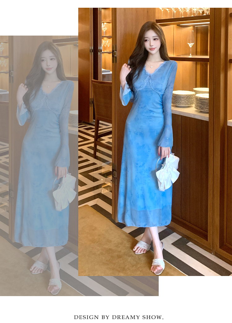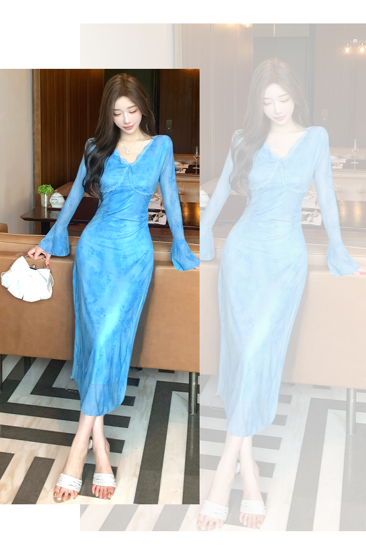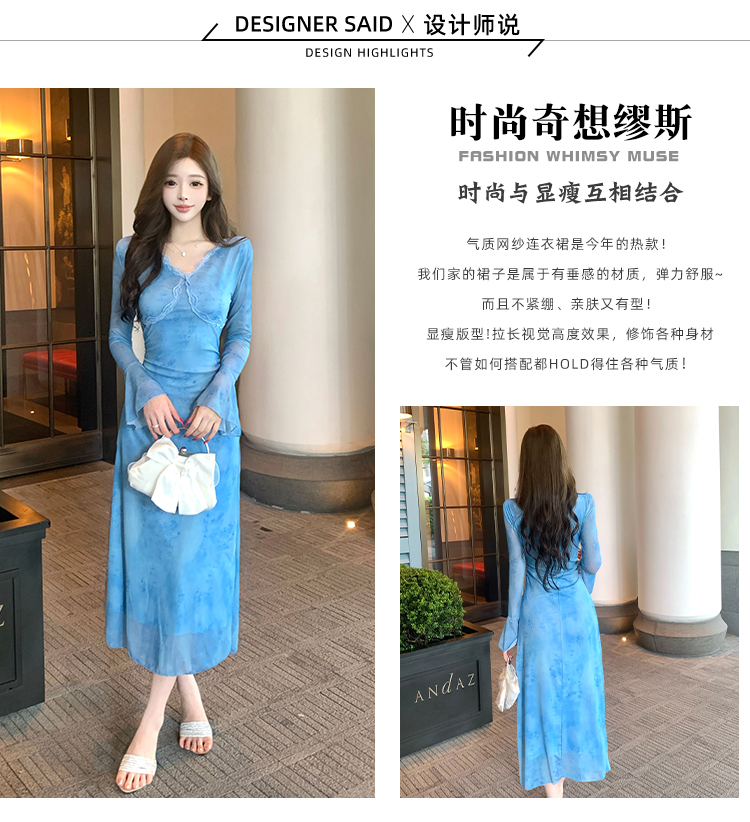 MY15183# 温柔风气质蓝色扎染连衣裙女装新款绝美V领御姐收腰长裙女裝貨源服裝批發