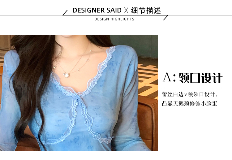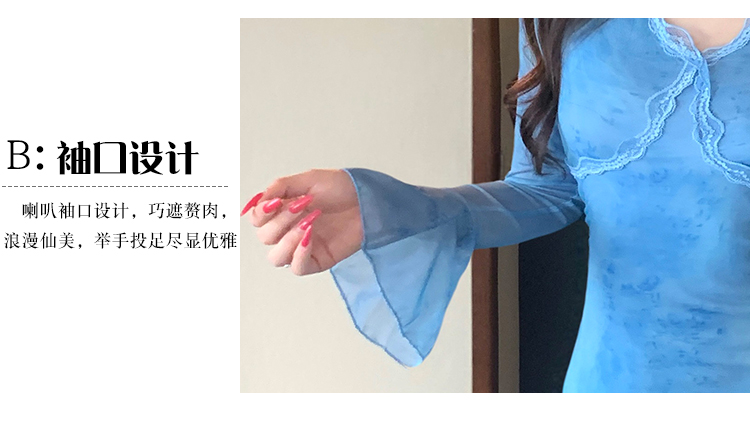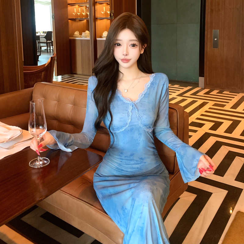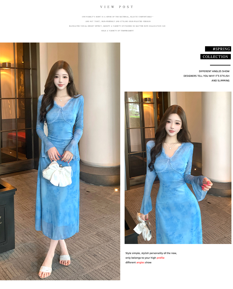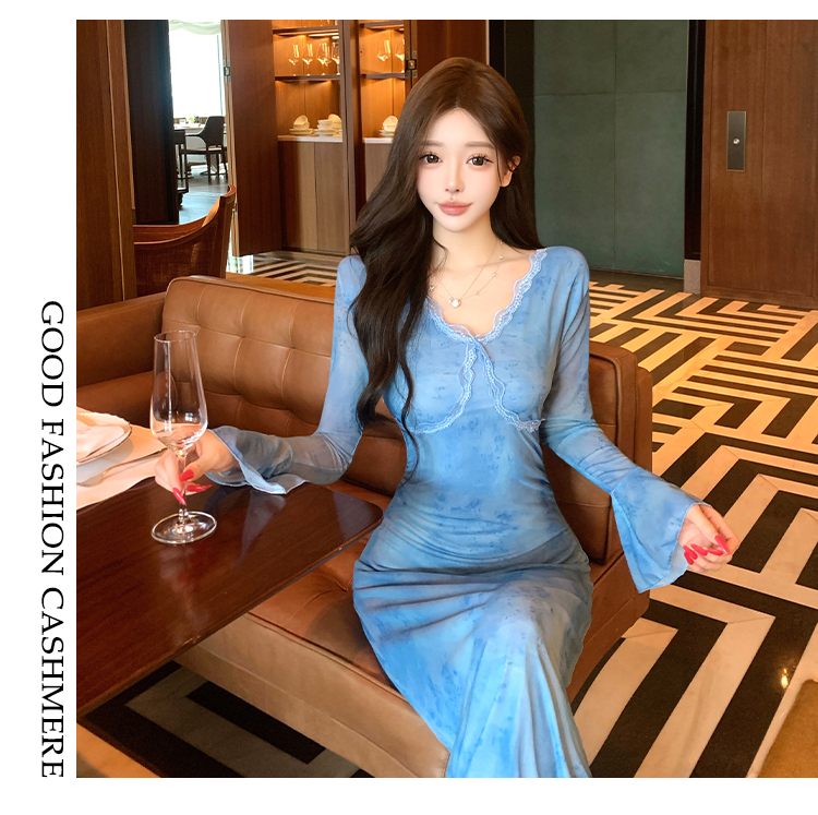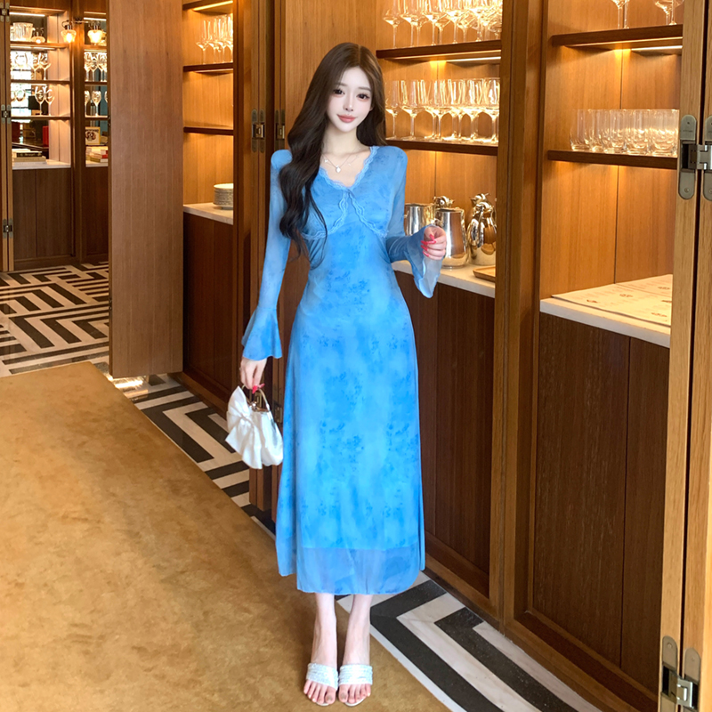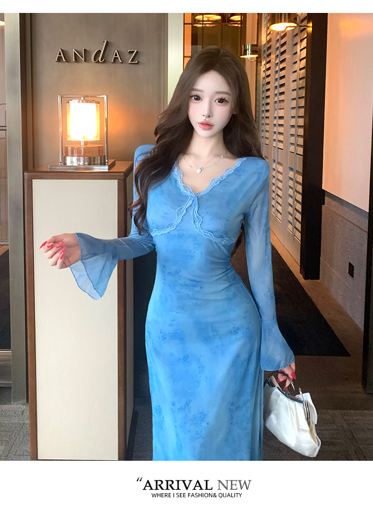 MY15183# 温柔风气质蓝色扎染连衣裙女装新款绝美V领御姐收腰长裙女裝貨源服裝批發