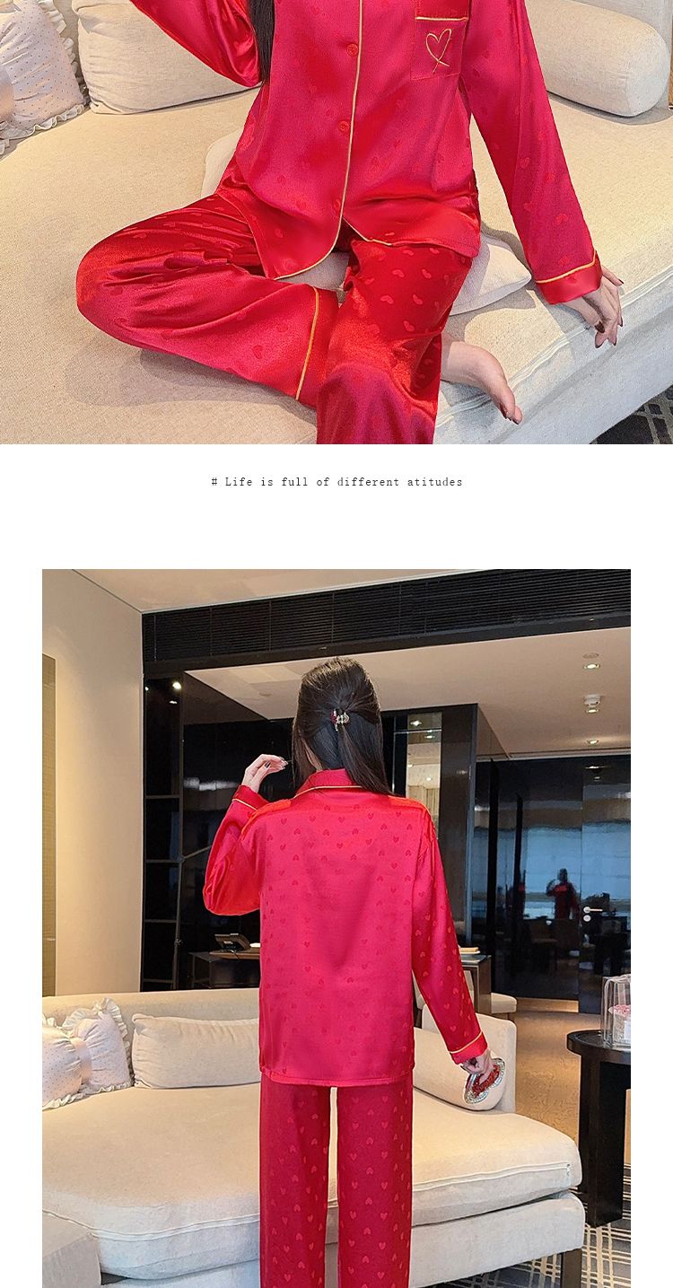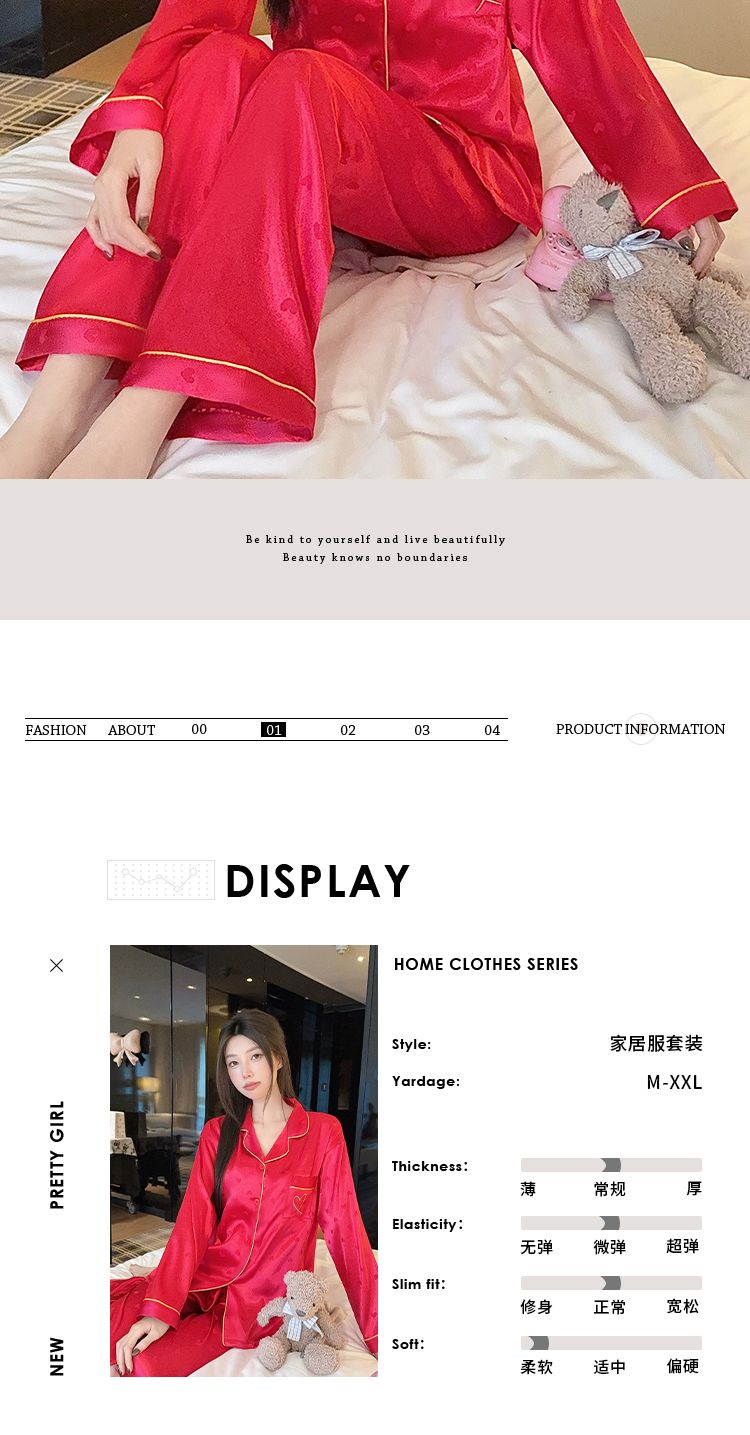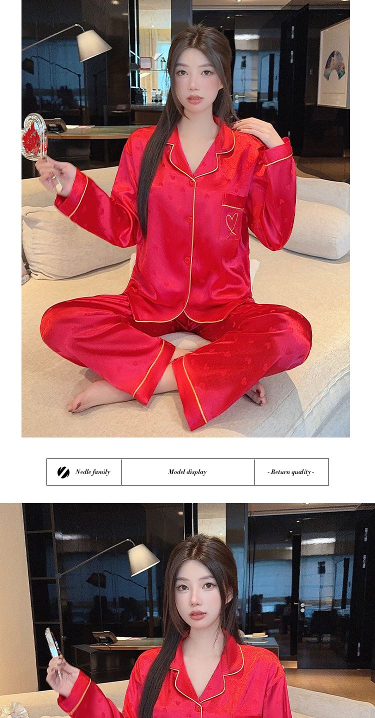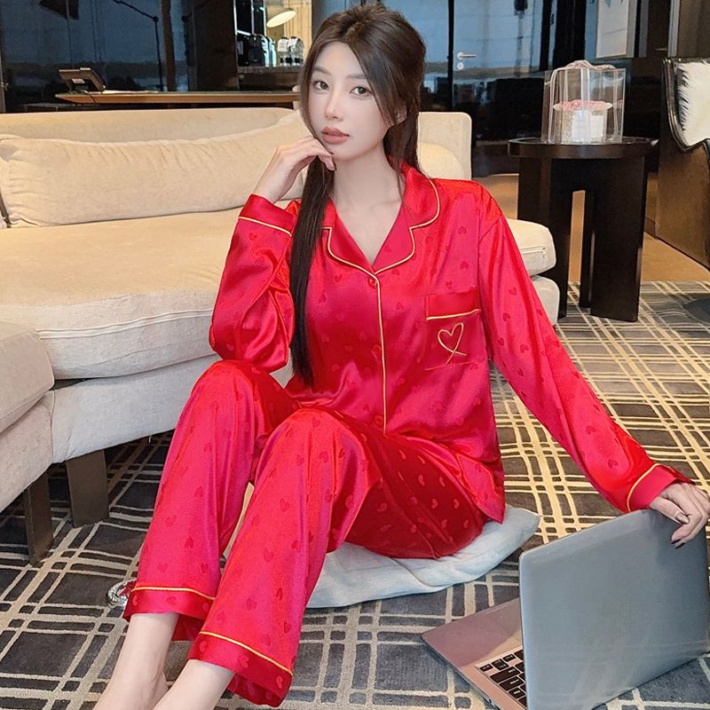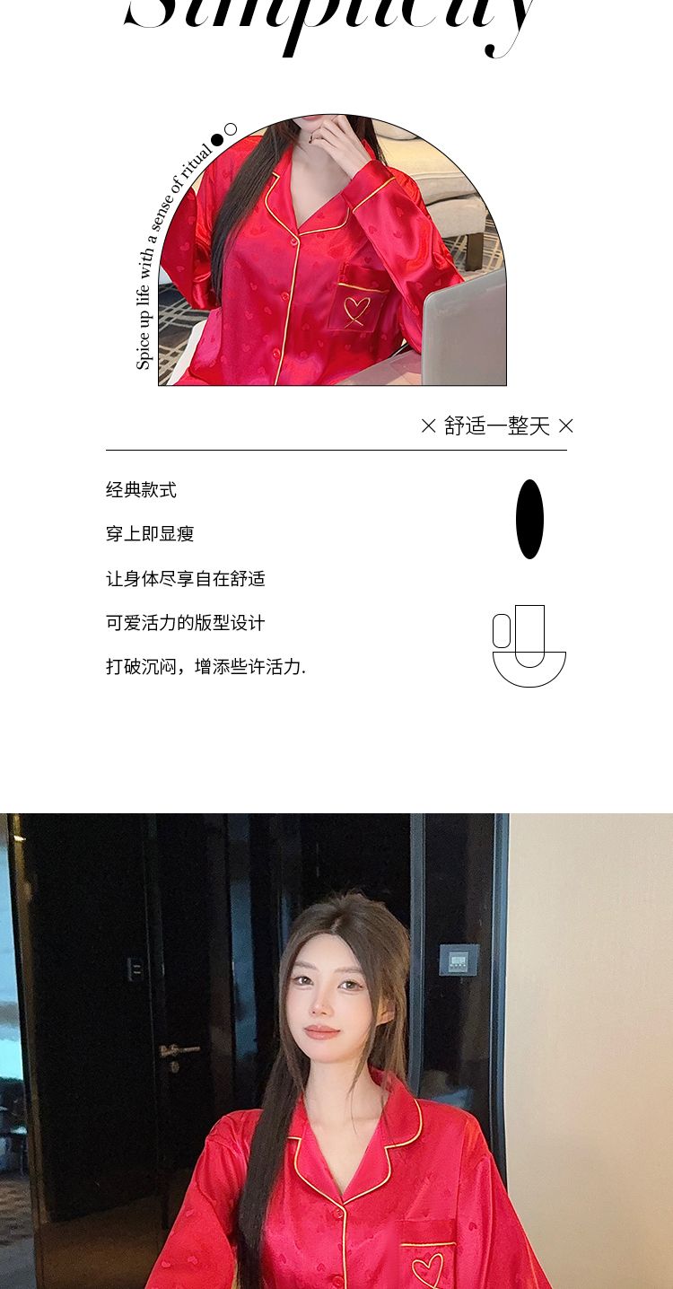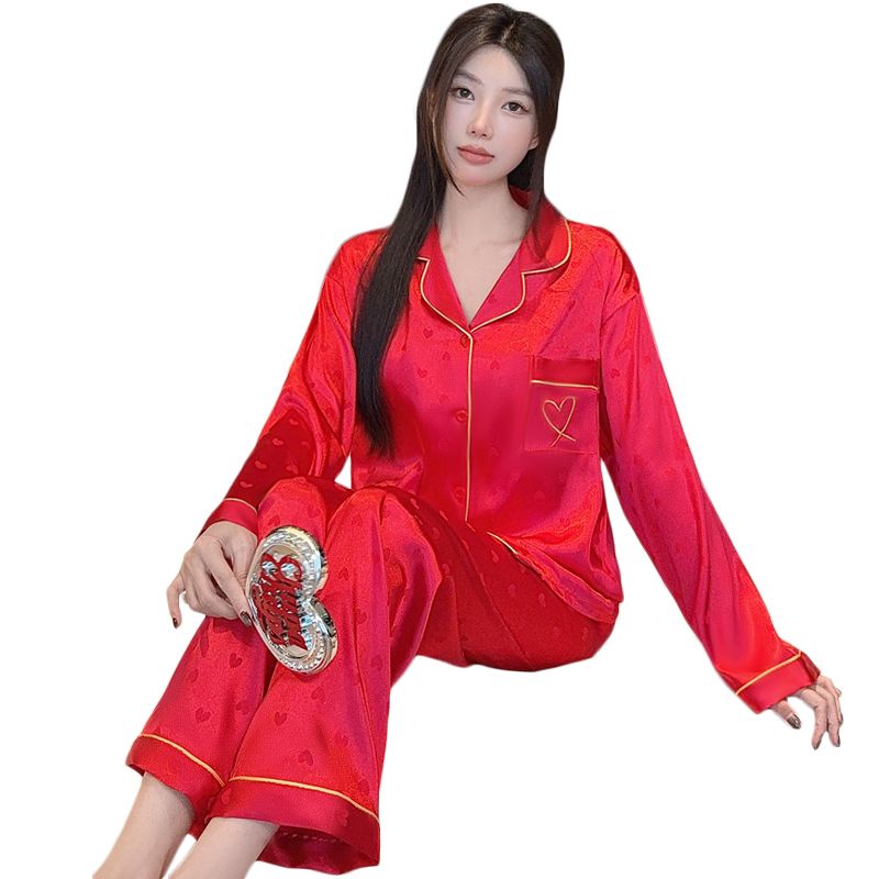 MY15186# 新款中国红简约提花爱心睡衣女仿真丝婚庆家居服套装女裝貨源服裝批發