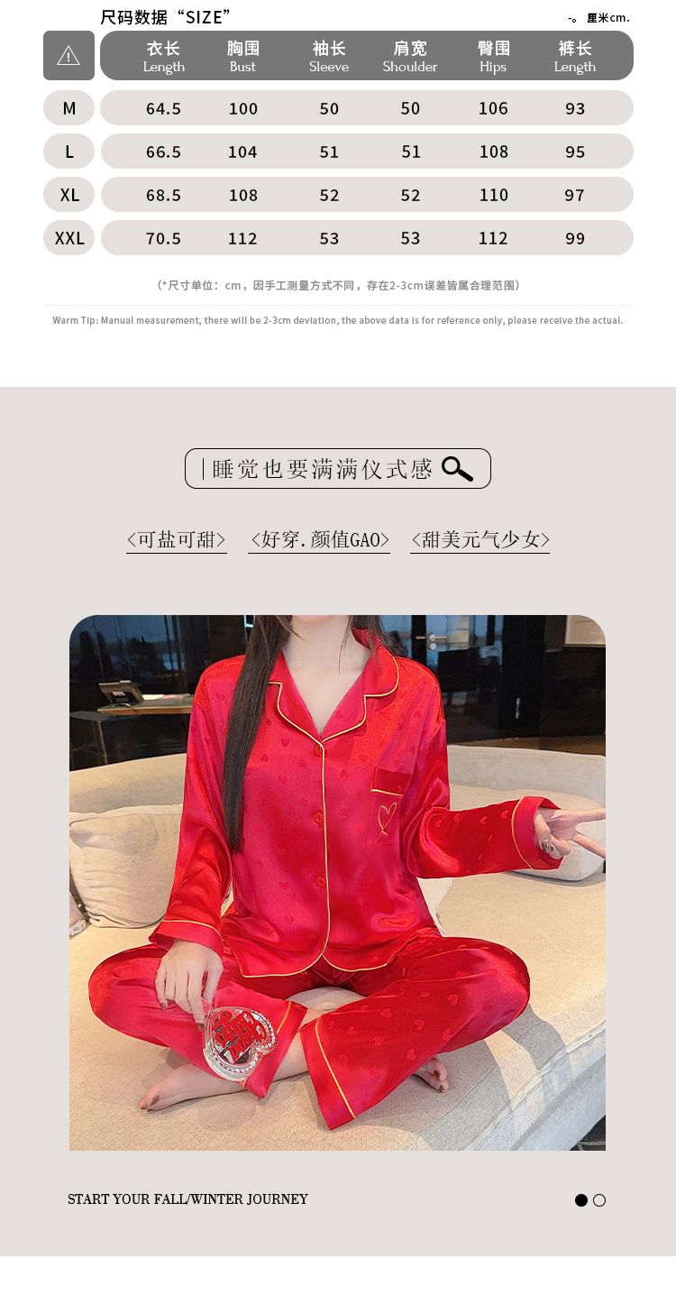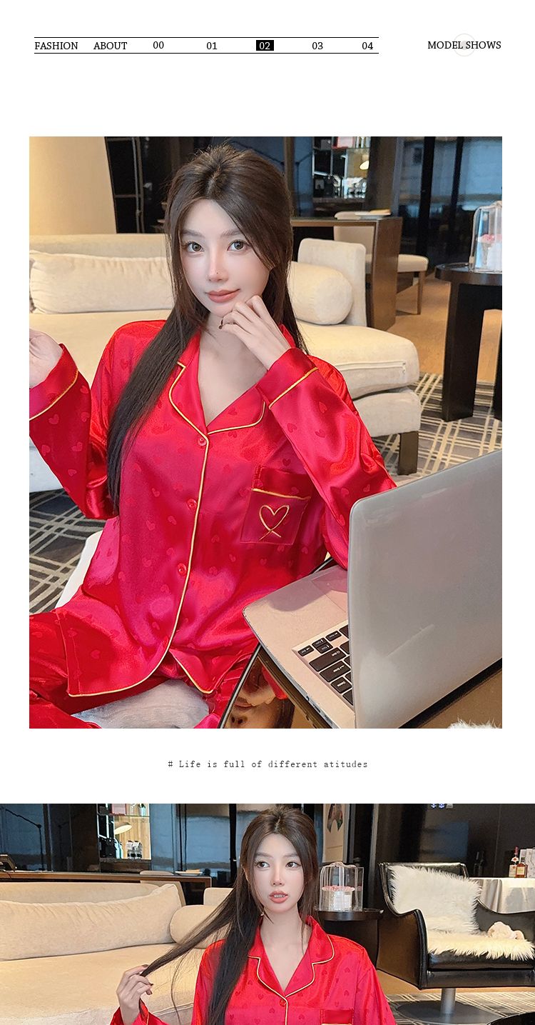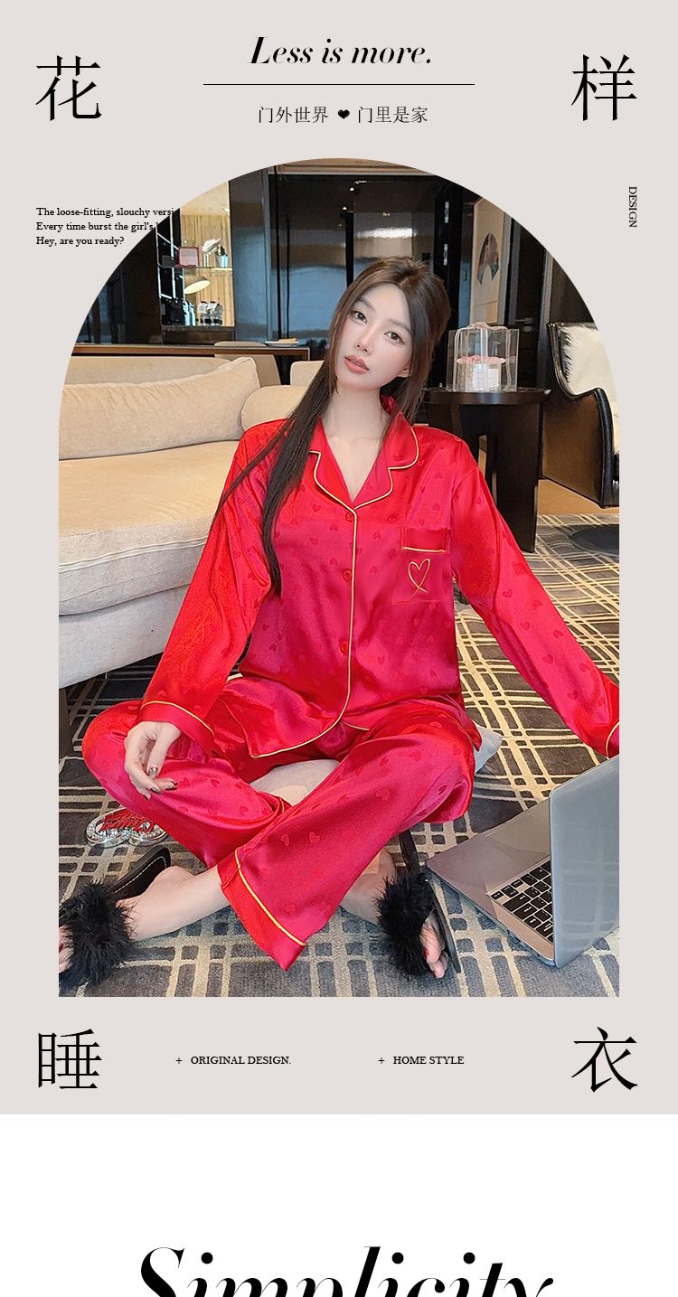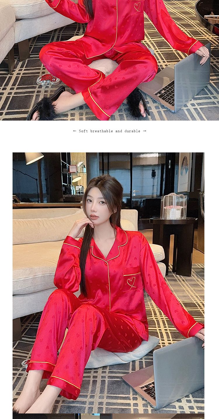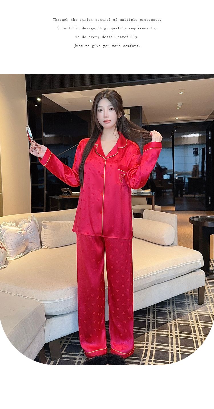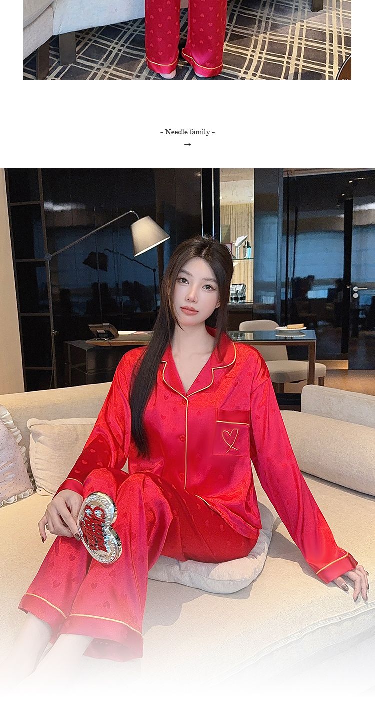 MY15186# 新款中国红简约提花爱心睡衣女仿真丝婚庆家居服套装女裝貨源服裝批發