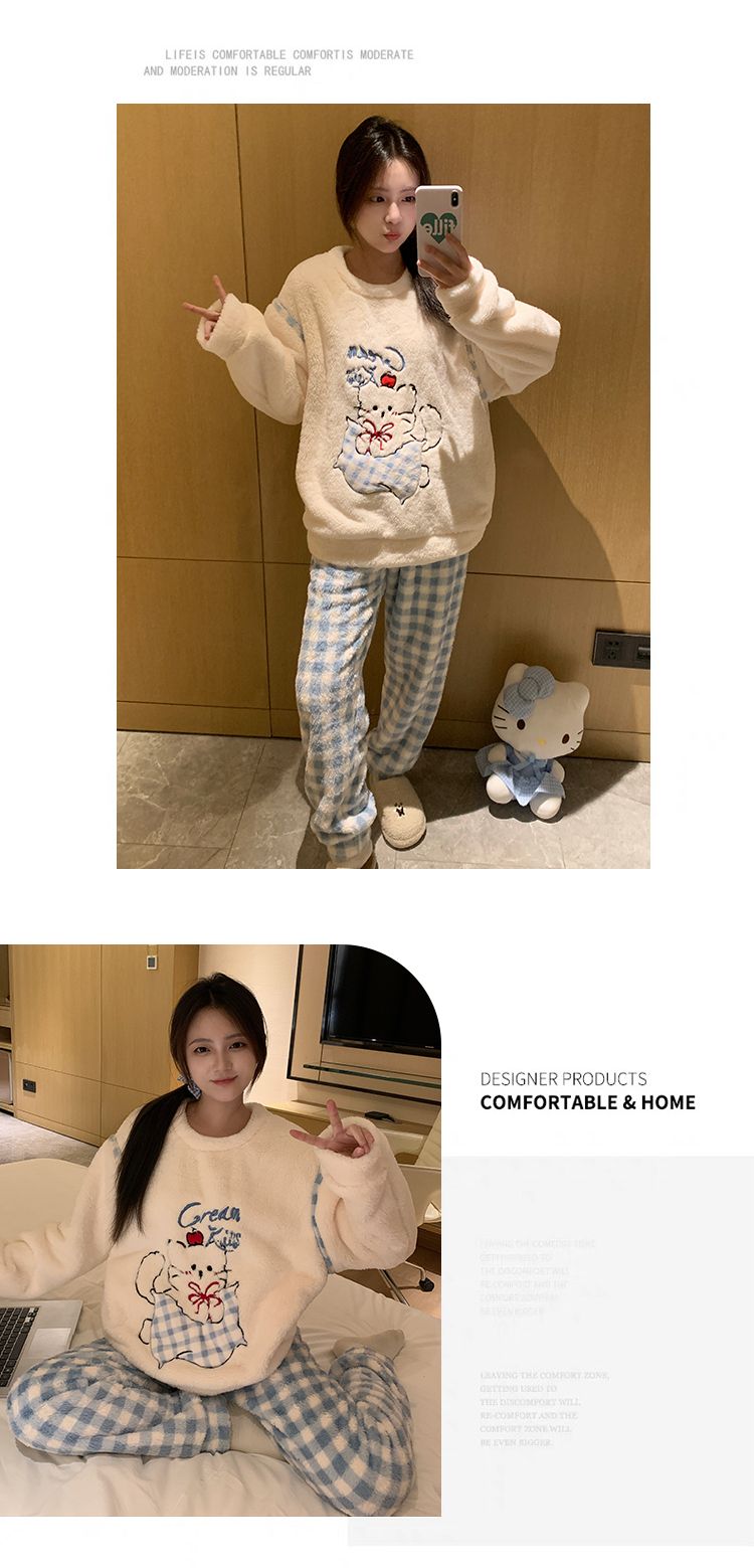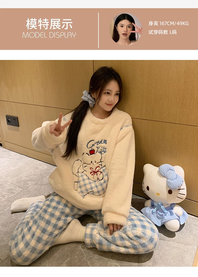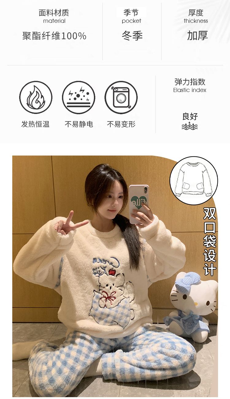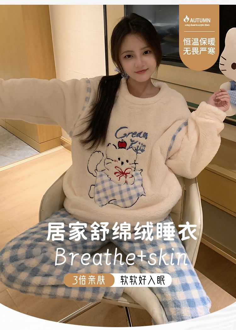 MY15192# 新款长毛绒加厚睡衣女圆领双口袋卡通甜美家居服套装女裝貨源服裝批發