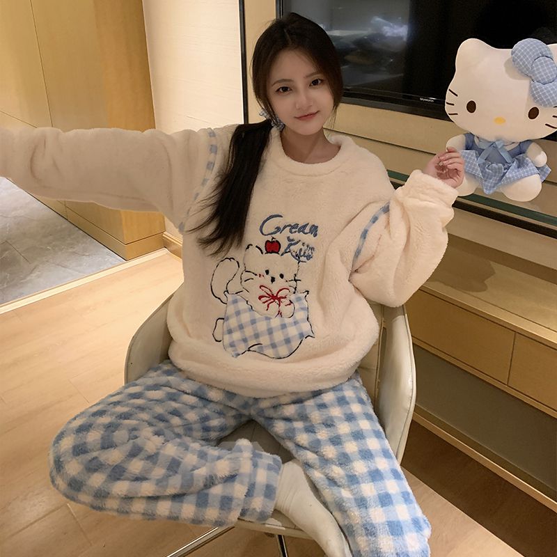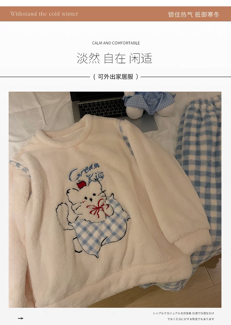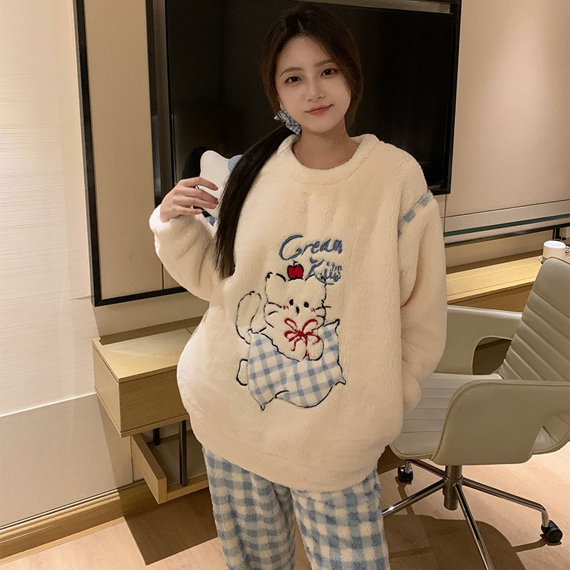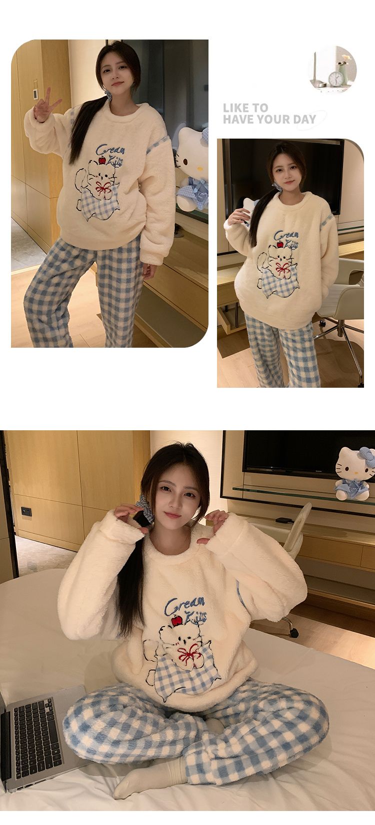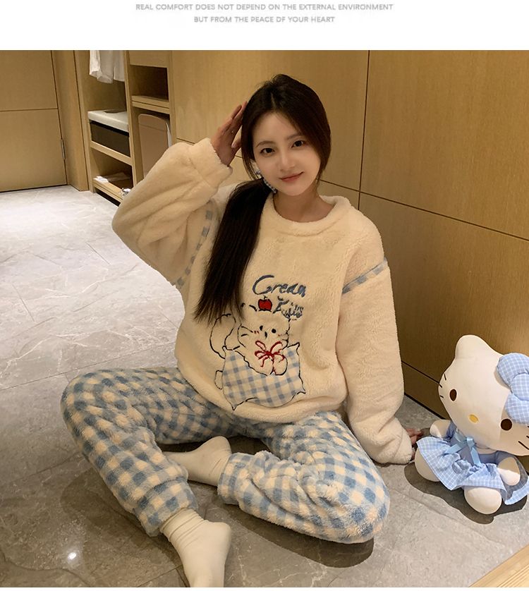 MY15192# 新款长毛绒加厚睡衣女圆领双口袋卡通甜美家居服套装女裝貨源服裝批發