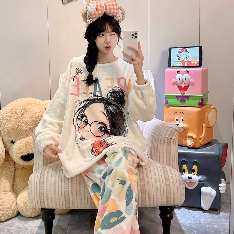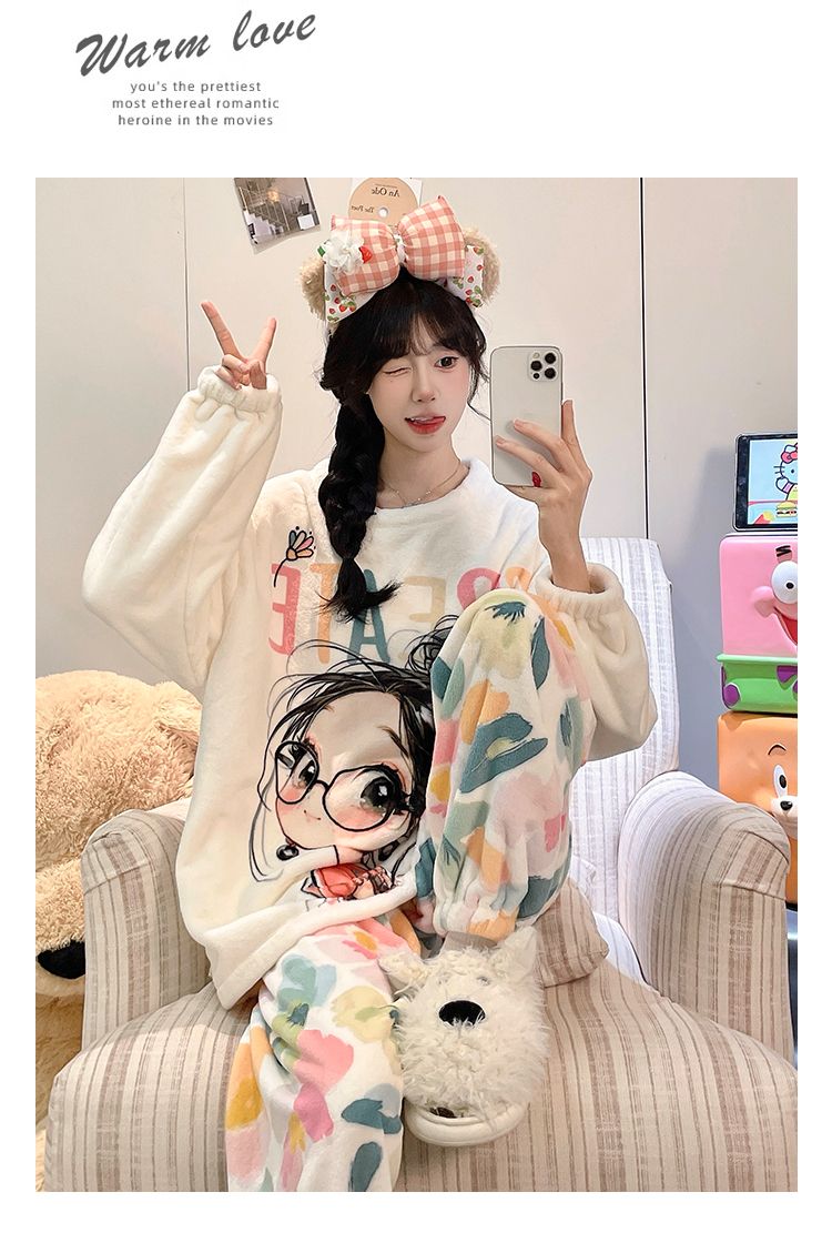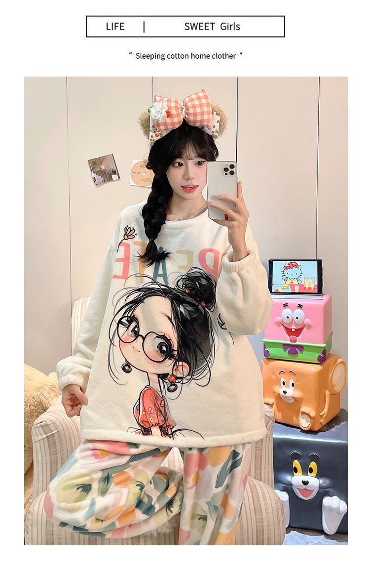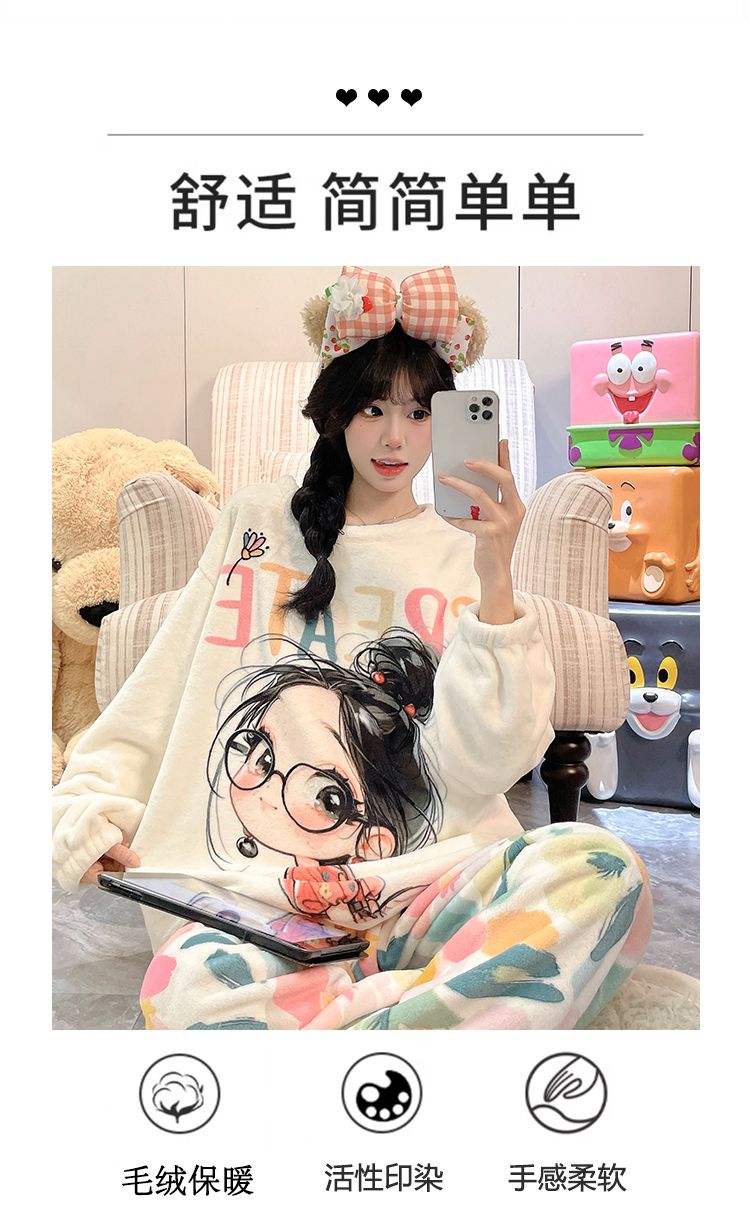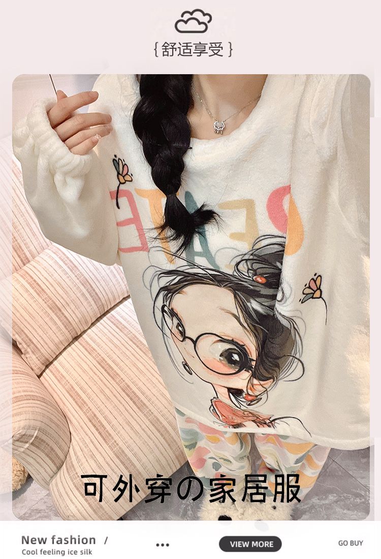 MY15194# 韩系新款甜美卡通睡衣女加绒加厚法兰绒少女家居服套装女裝貨源服裝批發