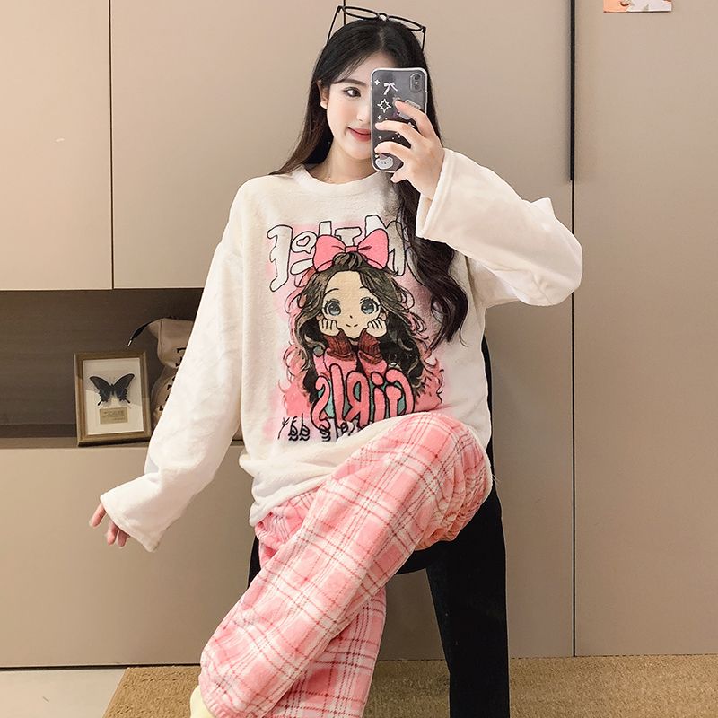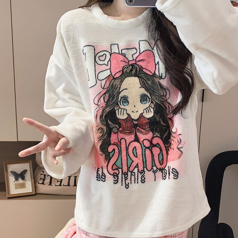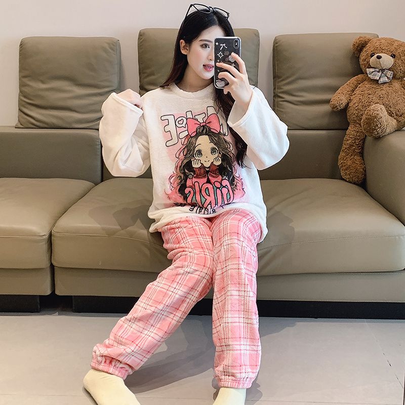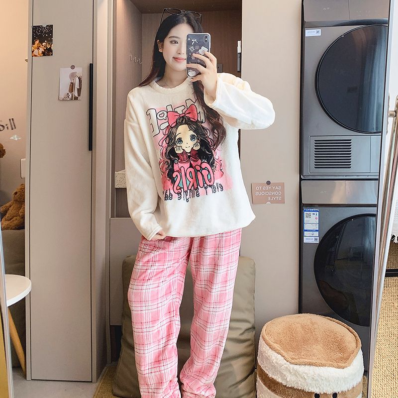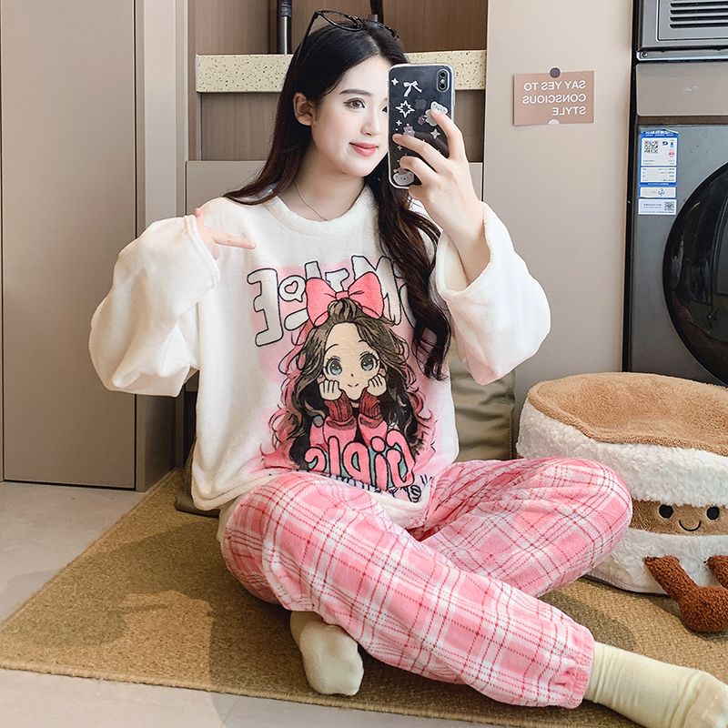MY15198# 新款法兰绒圆领卡通甜美睡衣女韩系可爱宽松家居服套装女裝貨源服裝批發