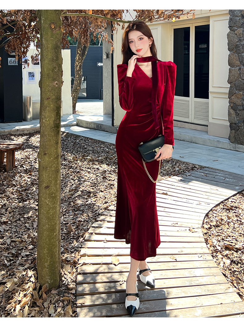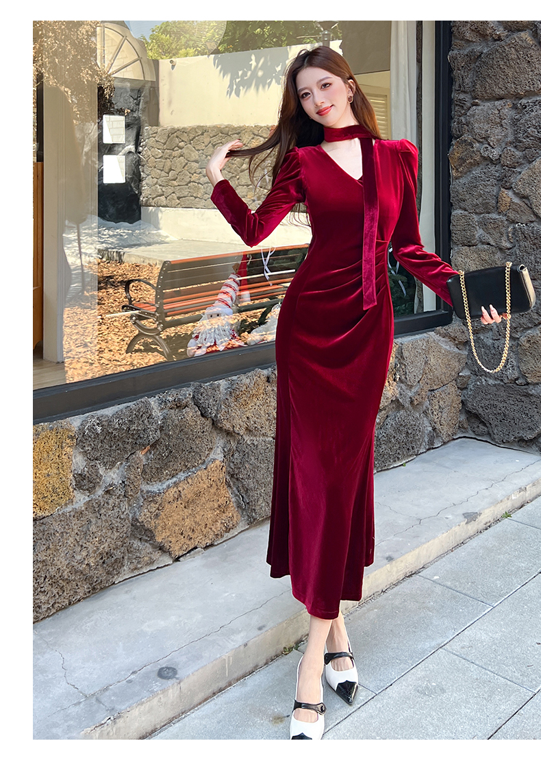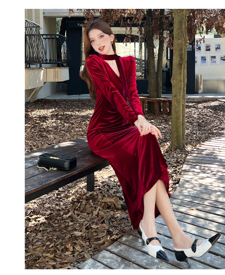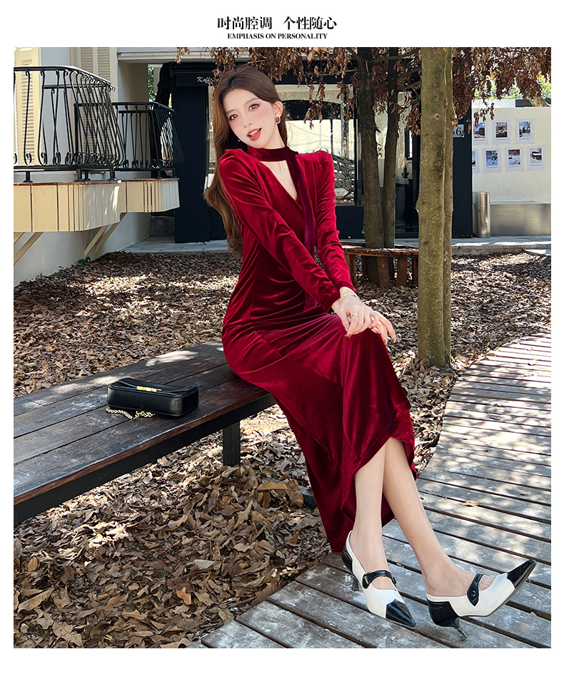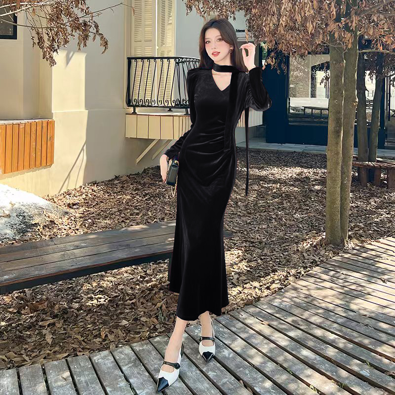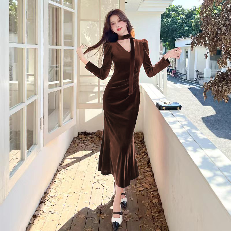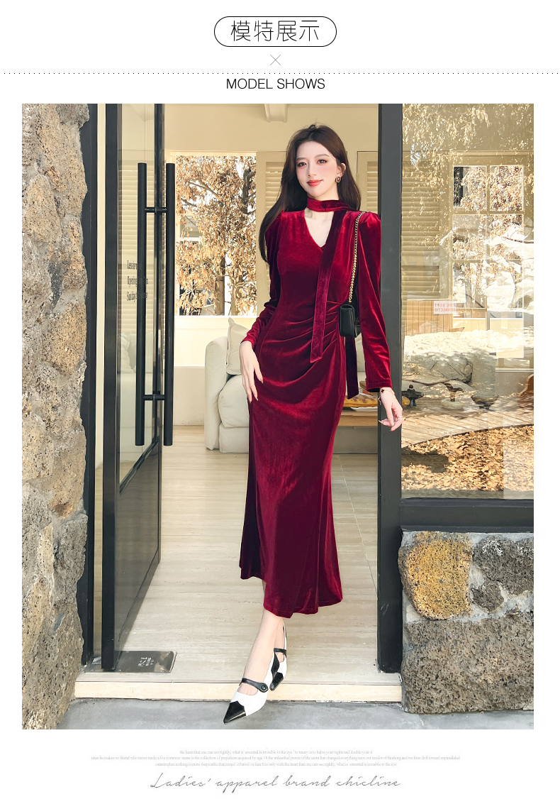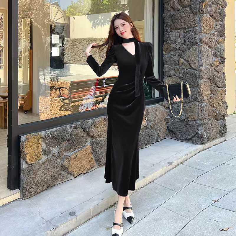 MY15200# 时尚气质金丝绒v领长裙包臀连衣裙女裝貨源服裝批發