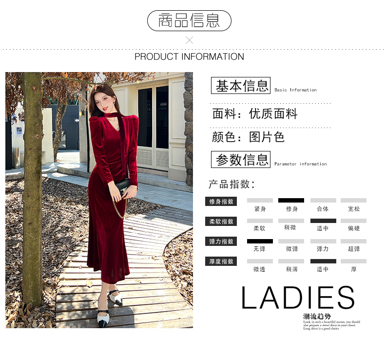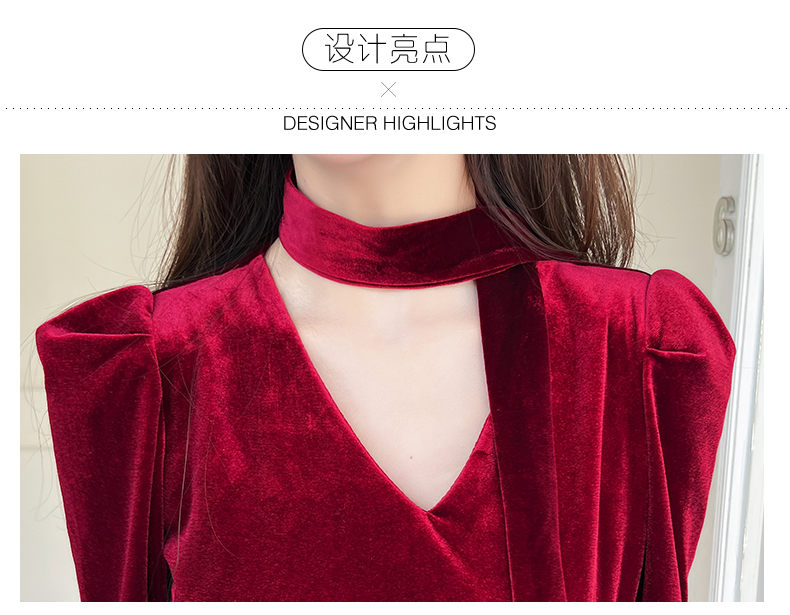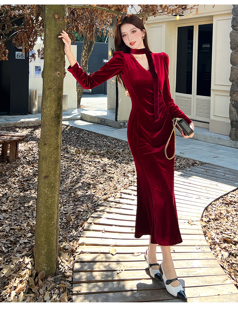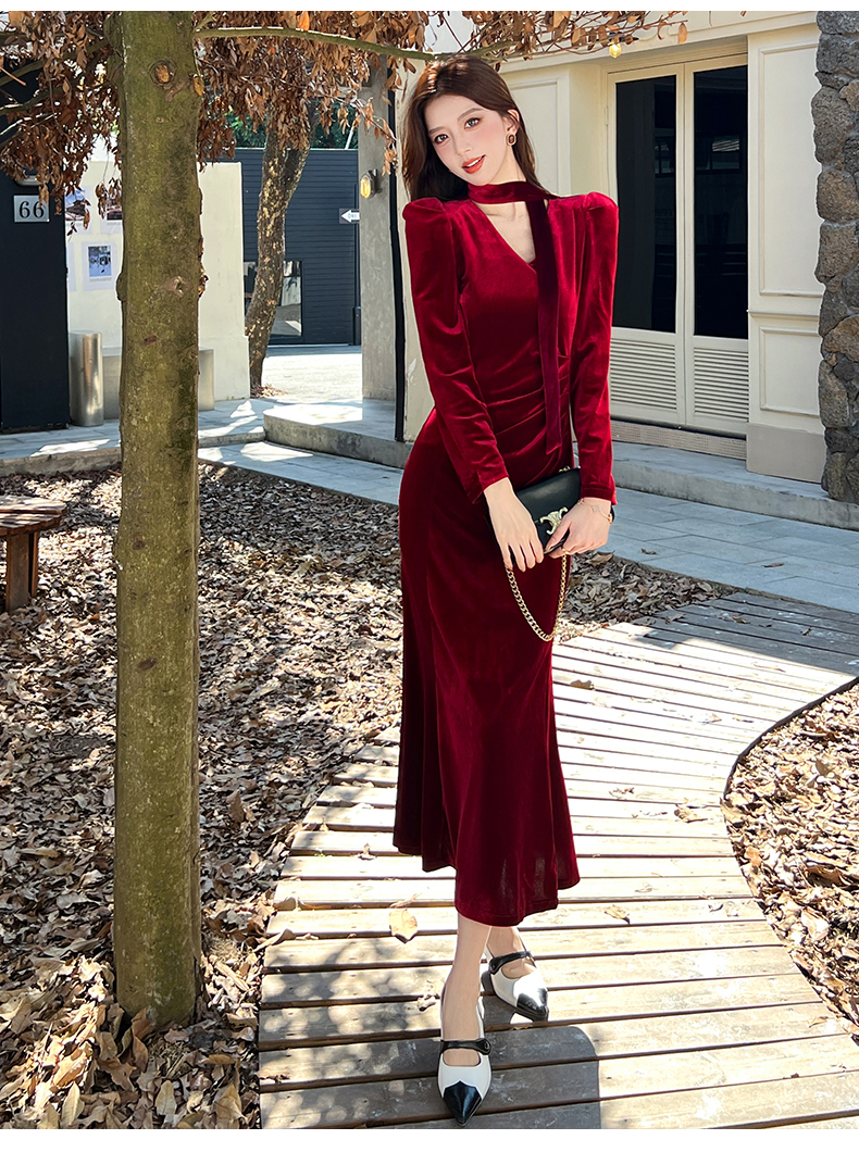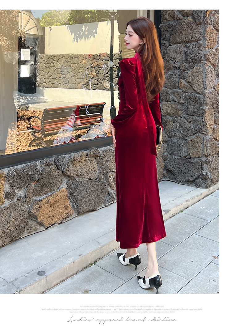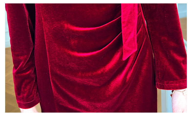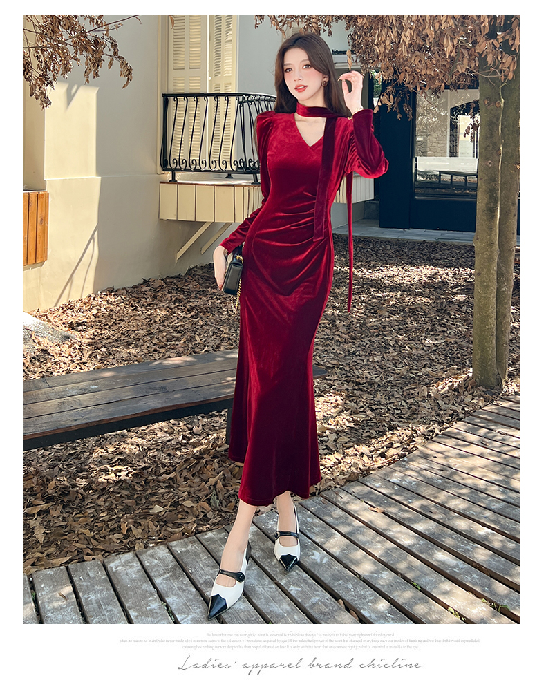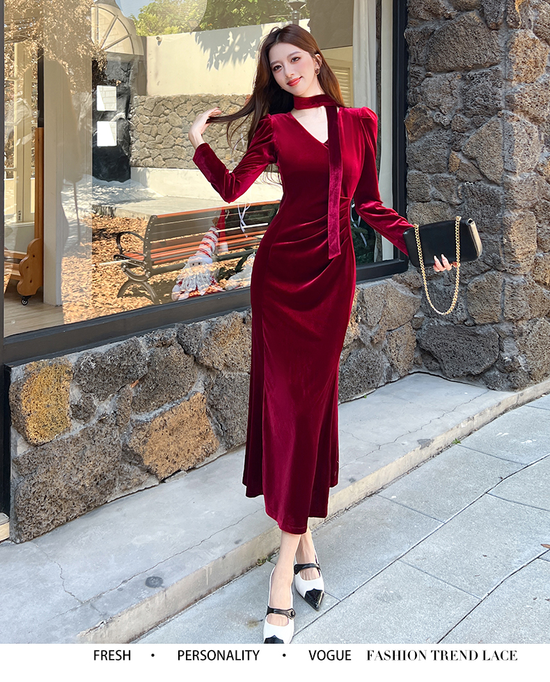 MY15200# 时尚气质金丝绒v领长裙包臀连衣裙女裝貨源服裝批發