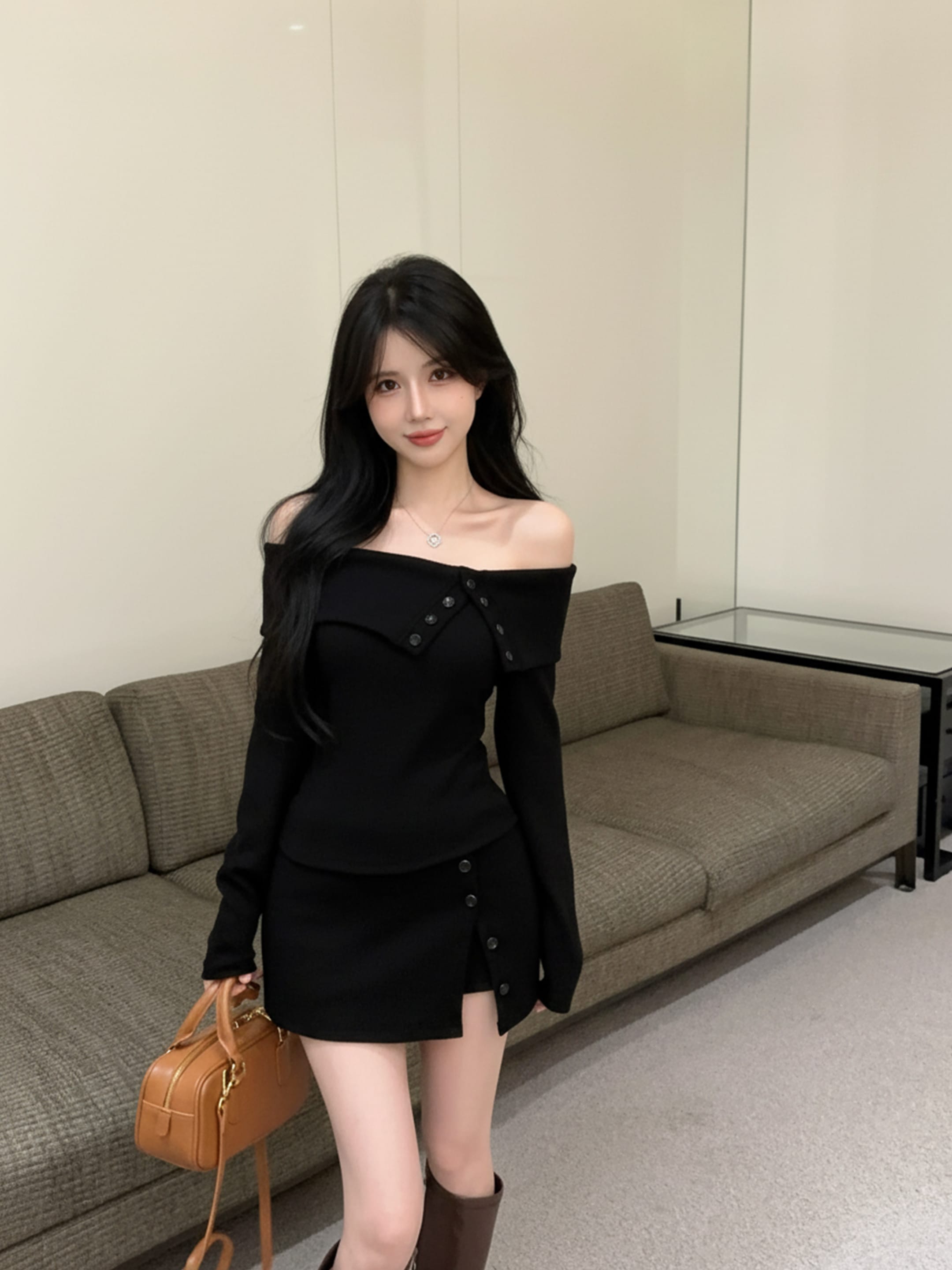 MY15214# 一字领不规则T恤上衣开叉裙裤千金套装时尚女两件套装女裝貨源服裝批發