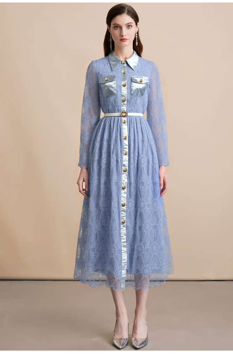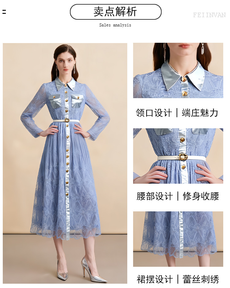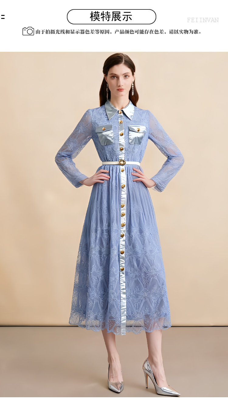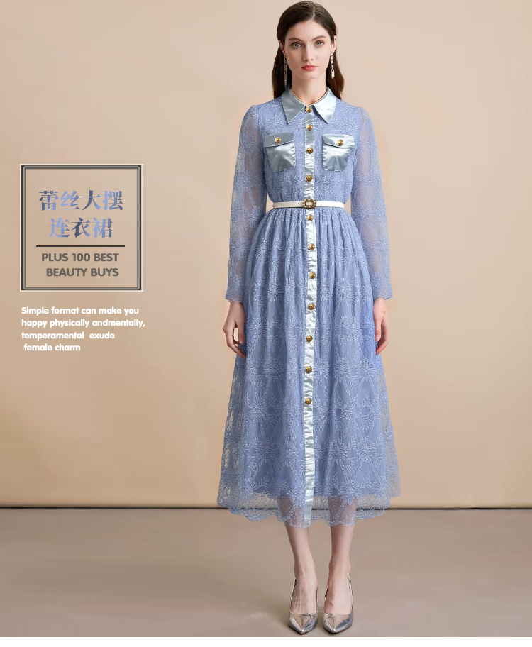 MY15216# 优雅长裙单排扣长袖POLO领收腰显瘦蕾丝连衣裙女送腰带女裝貨源服裝批發