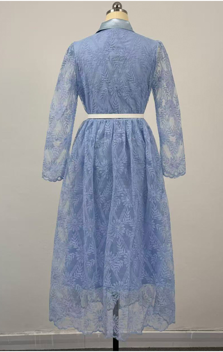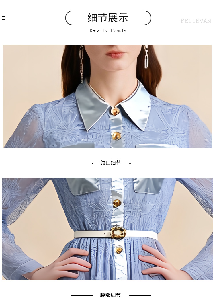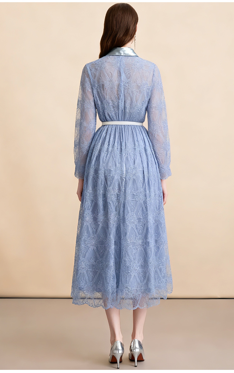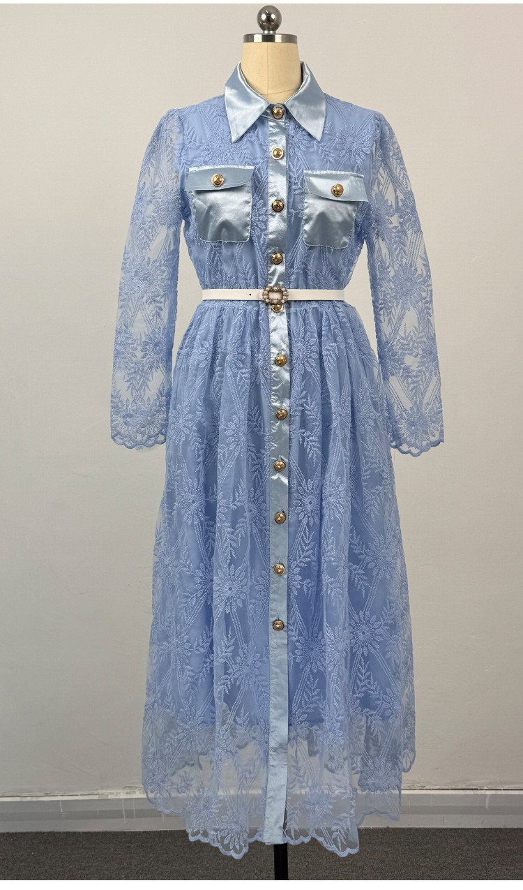 MY15216# 优雅长裙单排扣长袖POLO领收腰显瘦蕾丝连衣裙女送腰带女裝貨源服裝批發