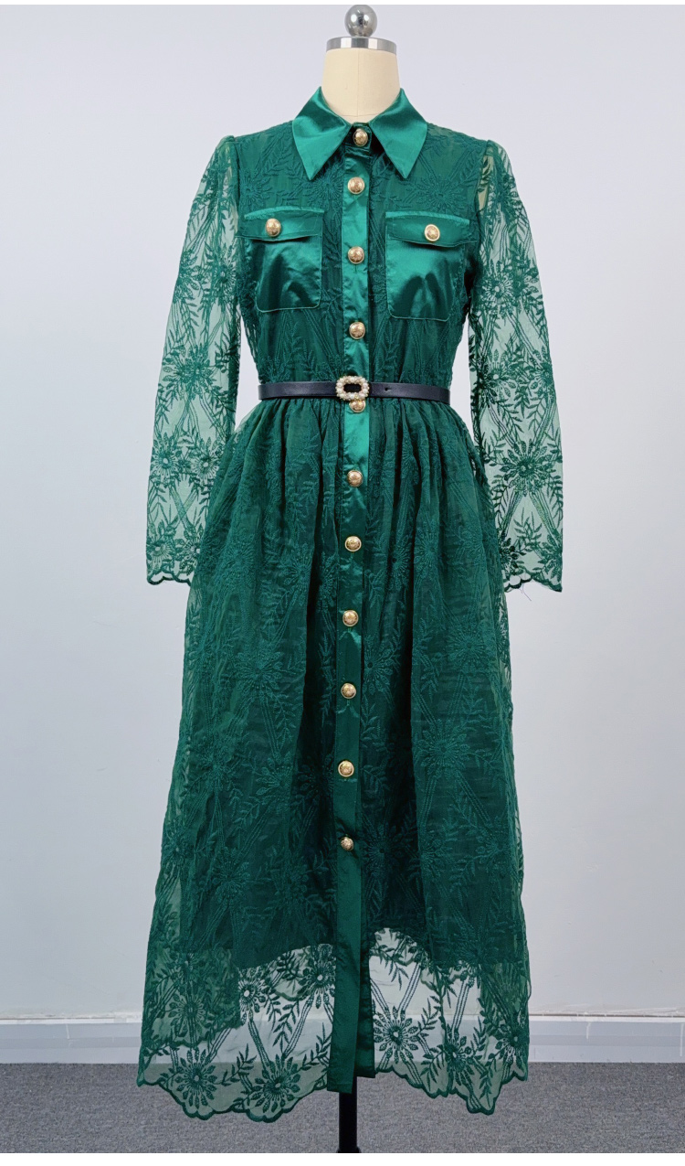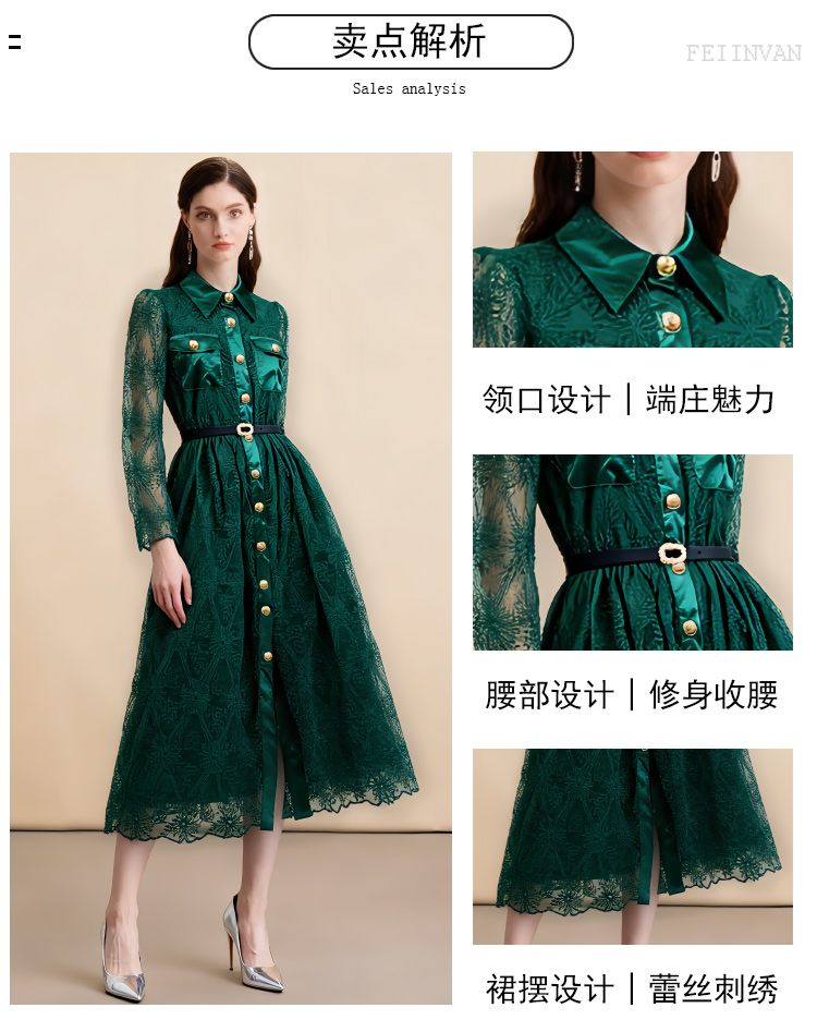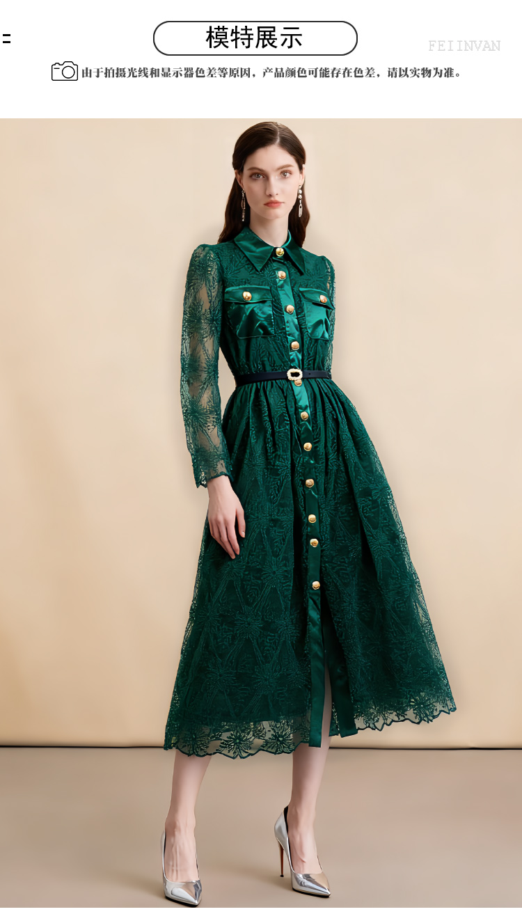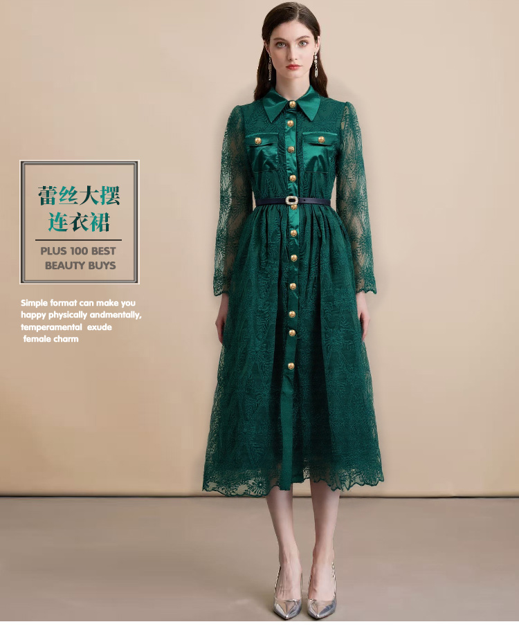 MY15217# 优雅长裙单排扣长袖POLO领收腰显瘦蕾丝连衣裙女送腰带女裝貨源服裝批發