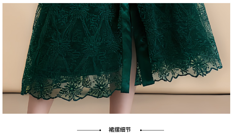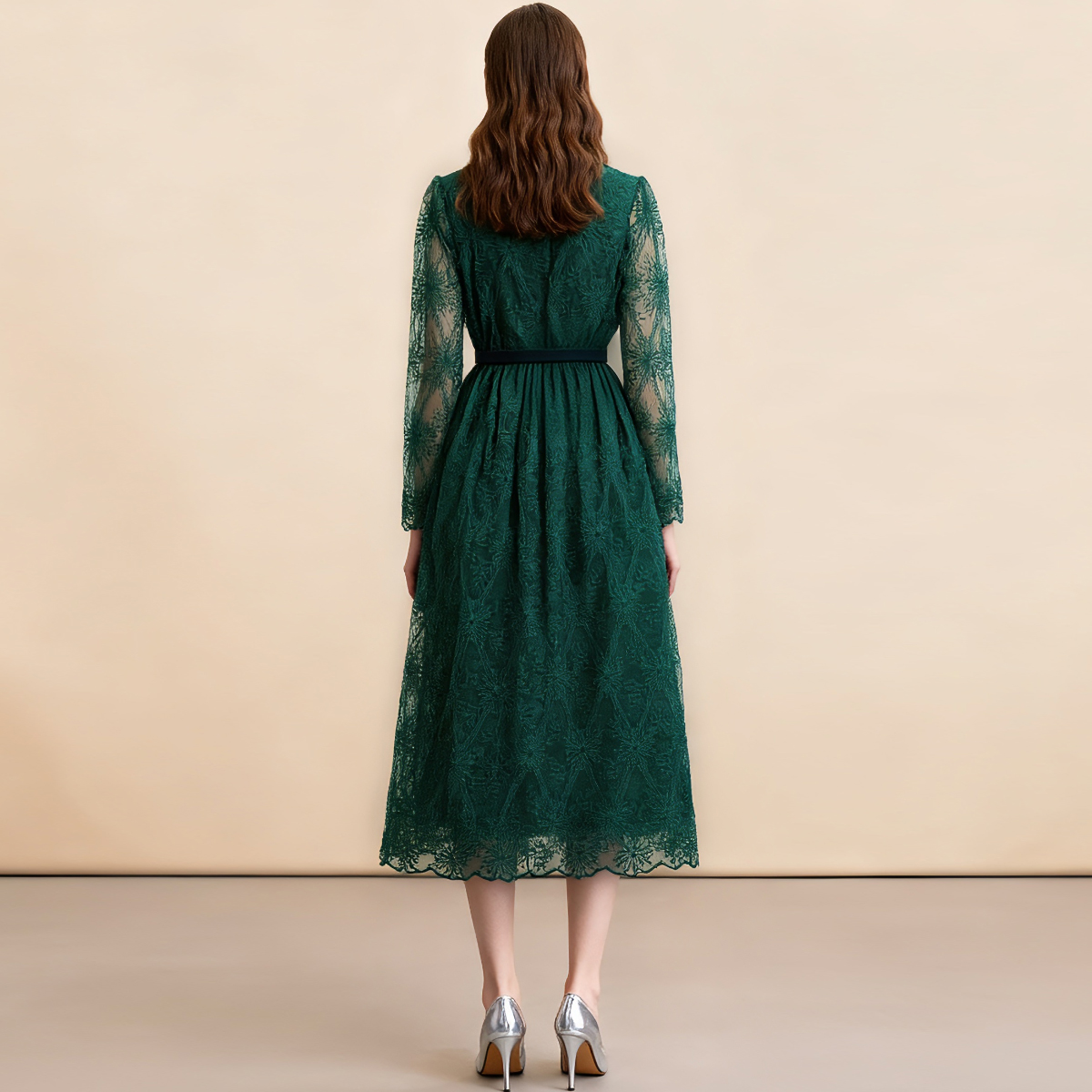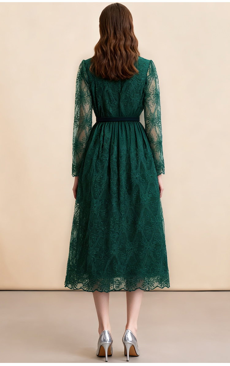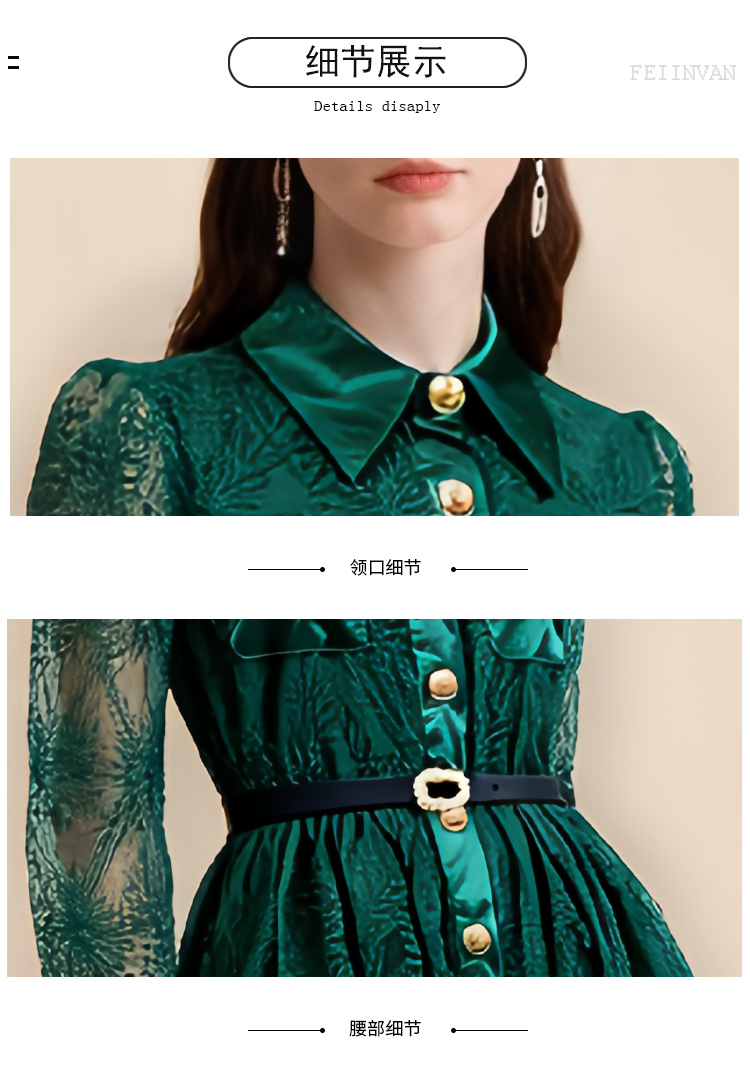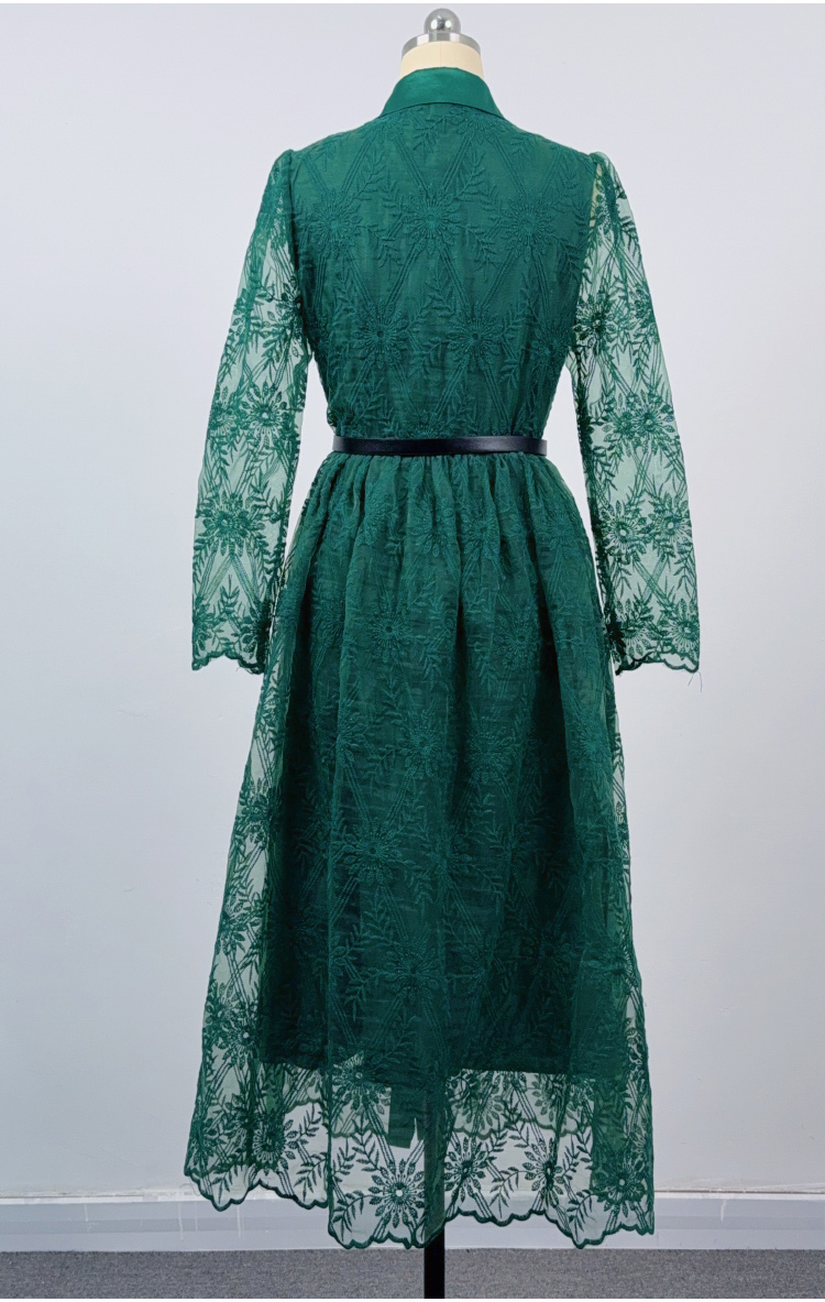 MY15217# 优雅长裙单排扣长袖POLO领收腰显瘦蕾丝连衣裙女送腰带女裝貨源服裝批發