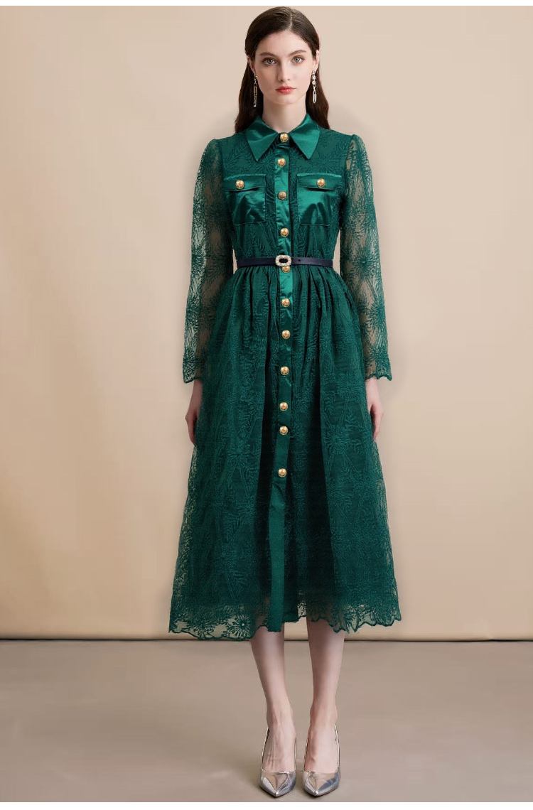 MY15216# 优雅长裙单排扣长袖POLO领收腰显瘦蕾丝连衣裙女送腰带女...