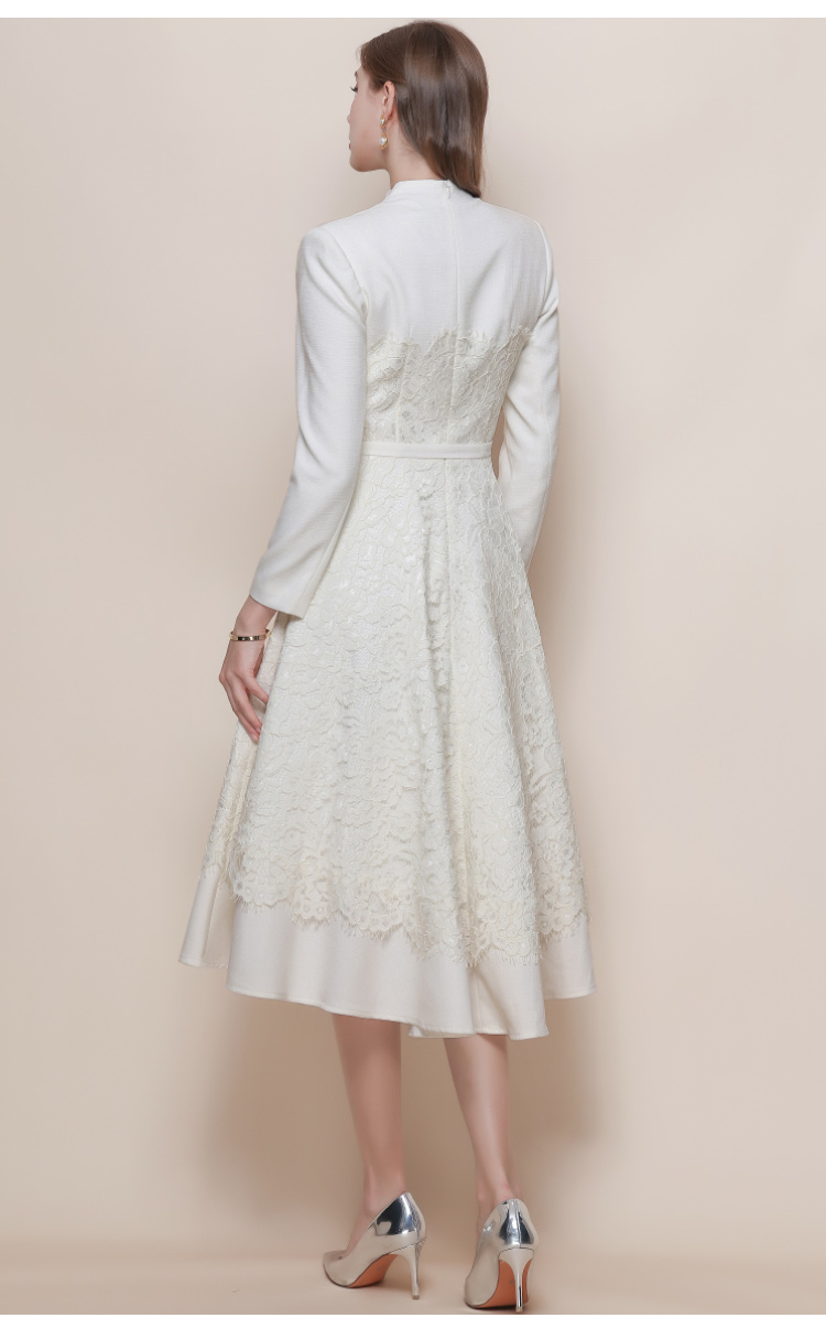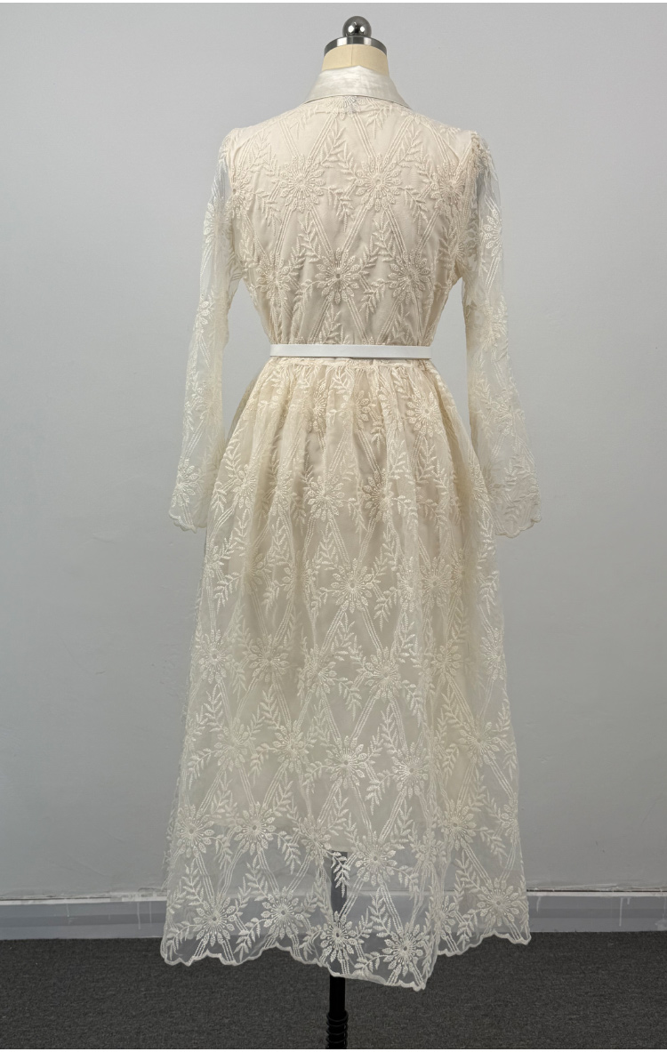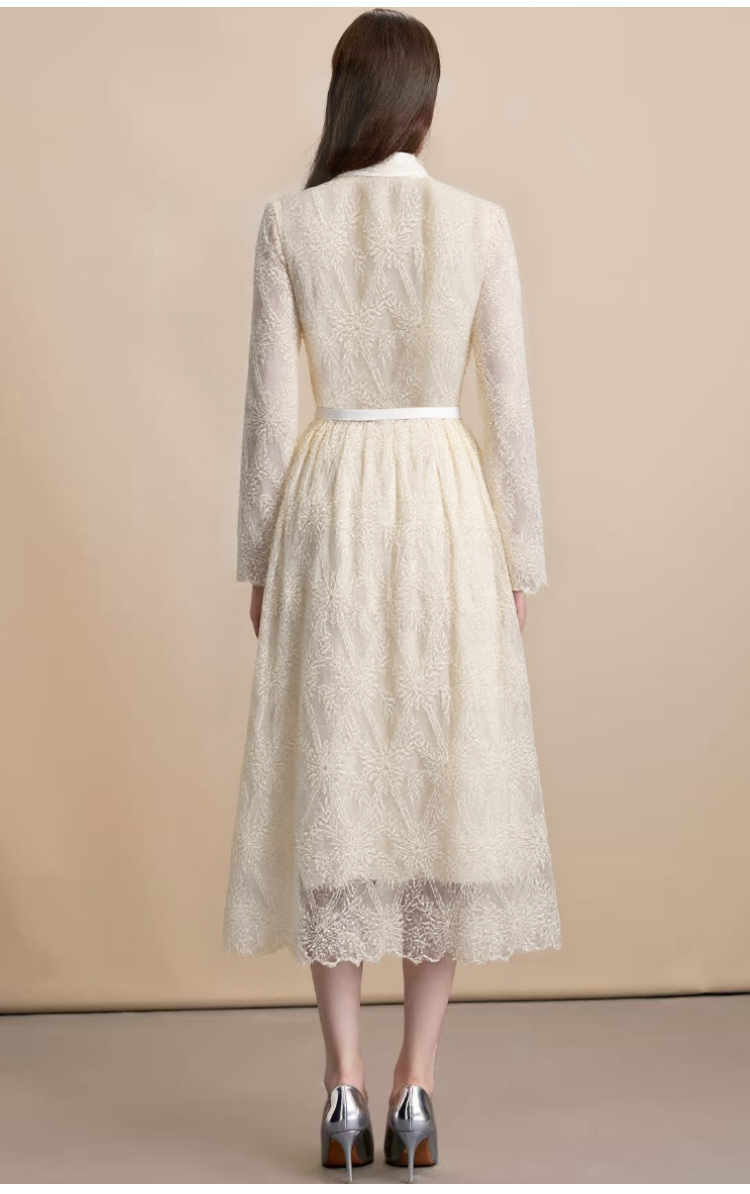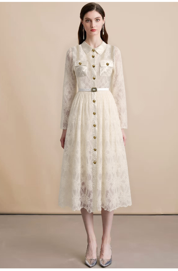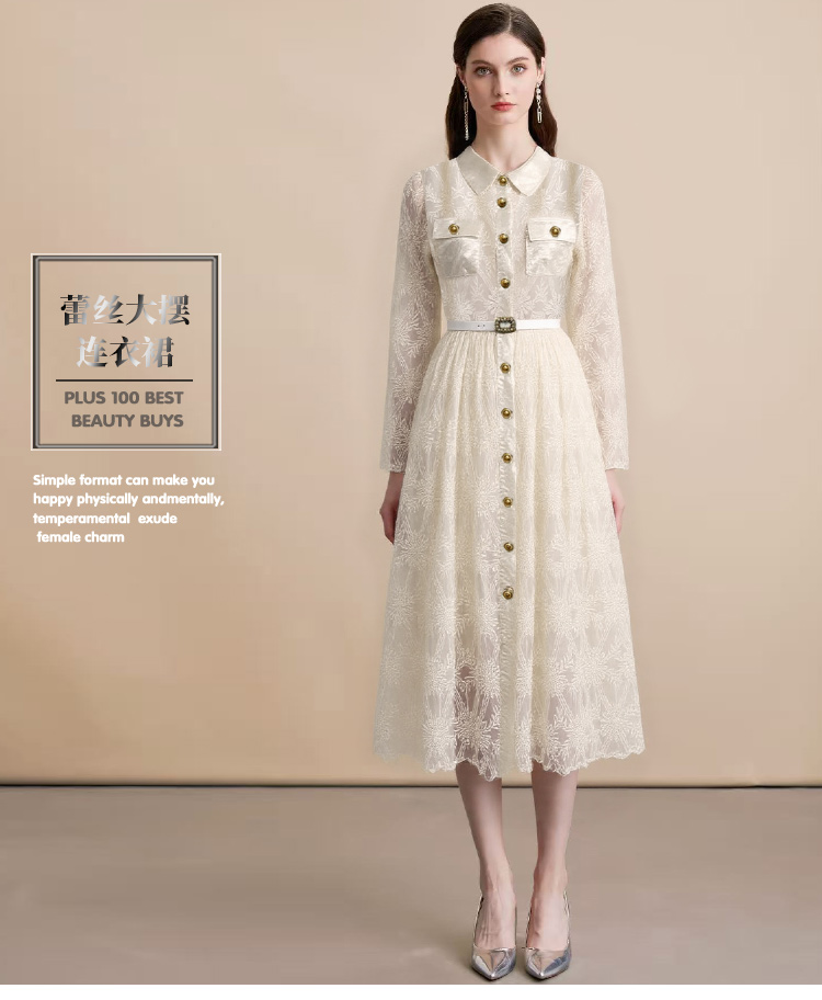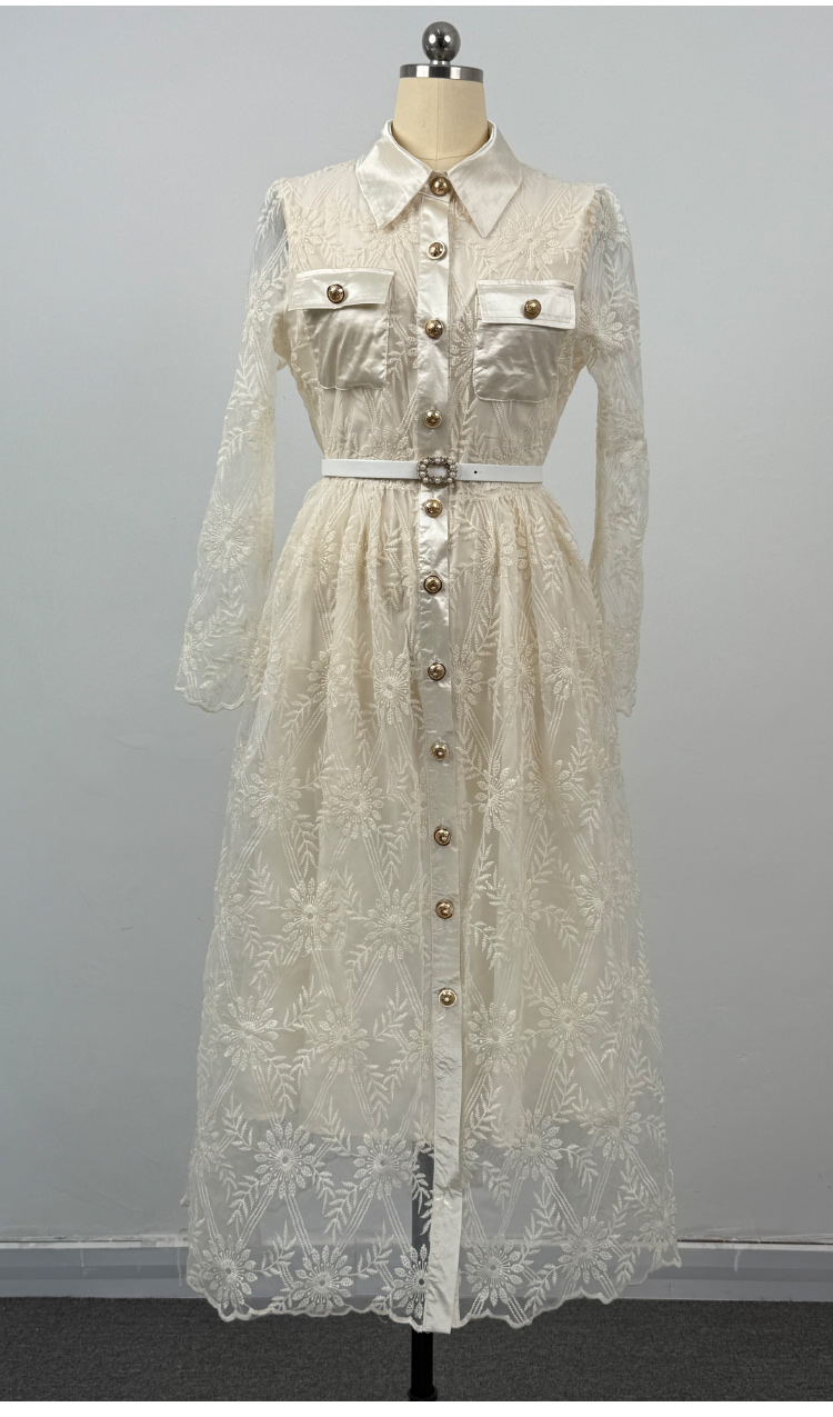 MY15218# 优雅长裙单排扣长袖POLO领收腰显瘦蕾丝连衣裙女送腰带女裝貨源服裝批發