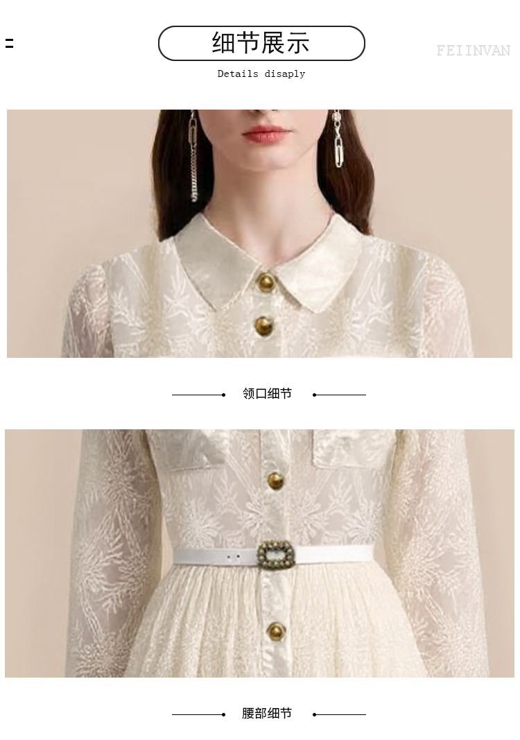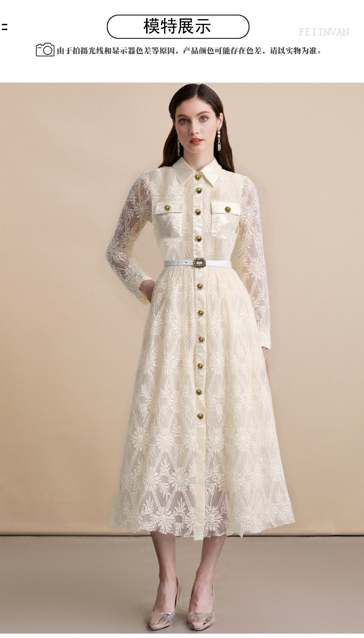MY15217# 优雅长裙单排扣长袖POLO领收腰显瘦蕾丝连衣裙女送腰带女...