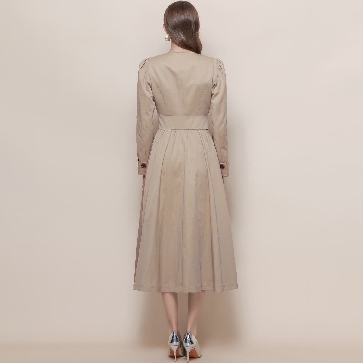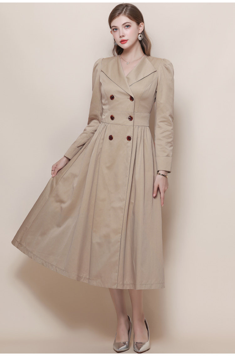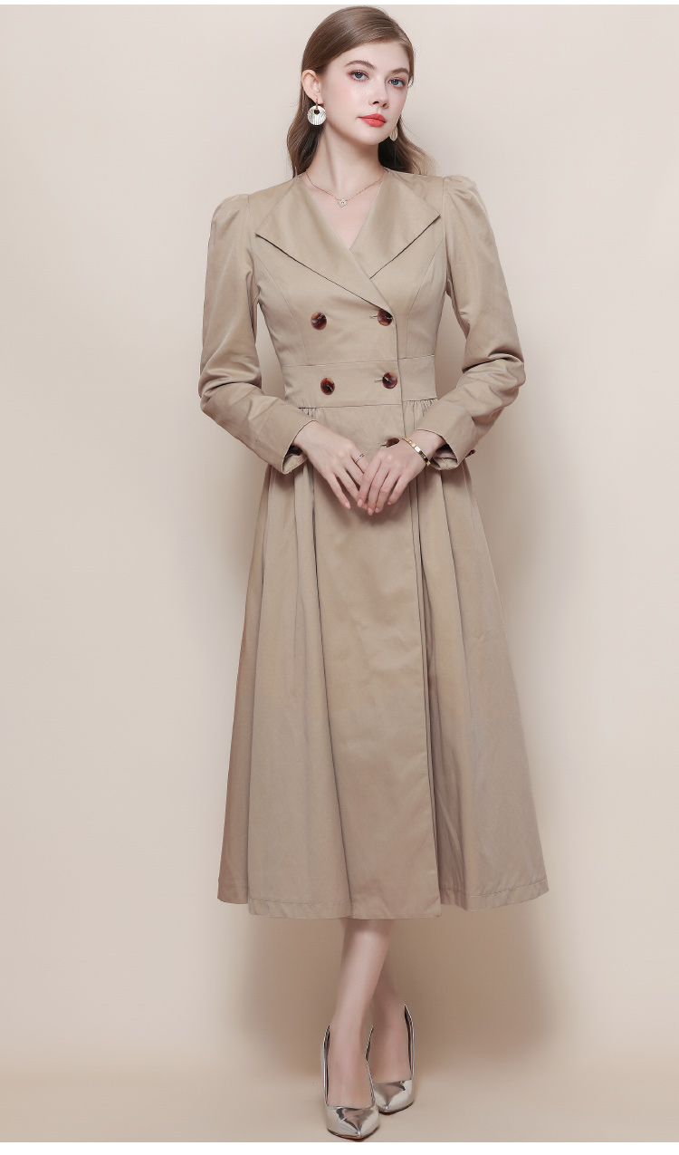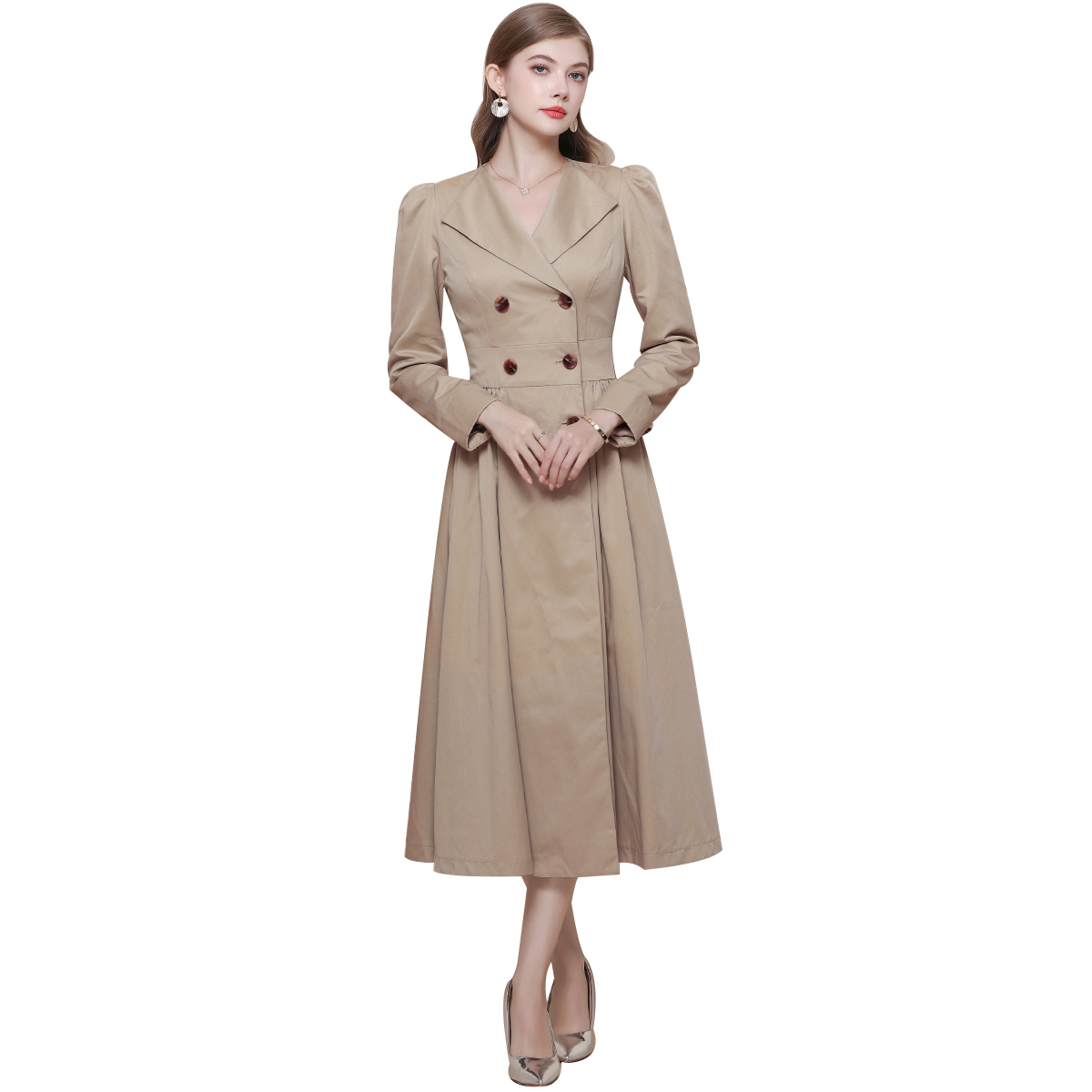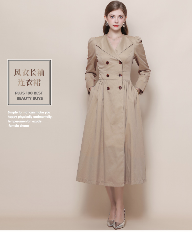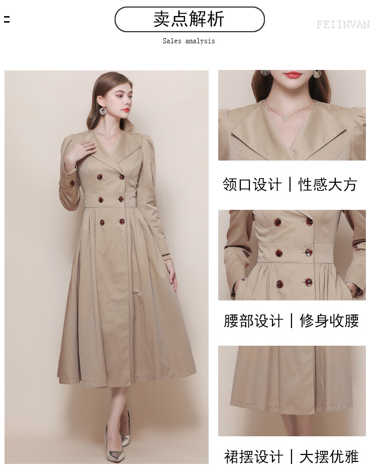 MY15221# 法式复古V领卡其色宽松双排扣收腰长袖风衣外套连衣裙女裝貨源服裝批發
