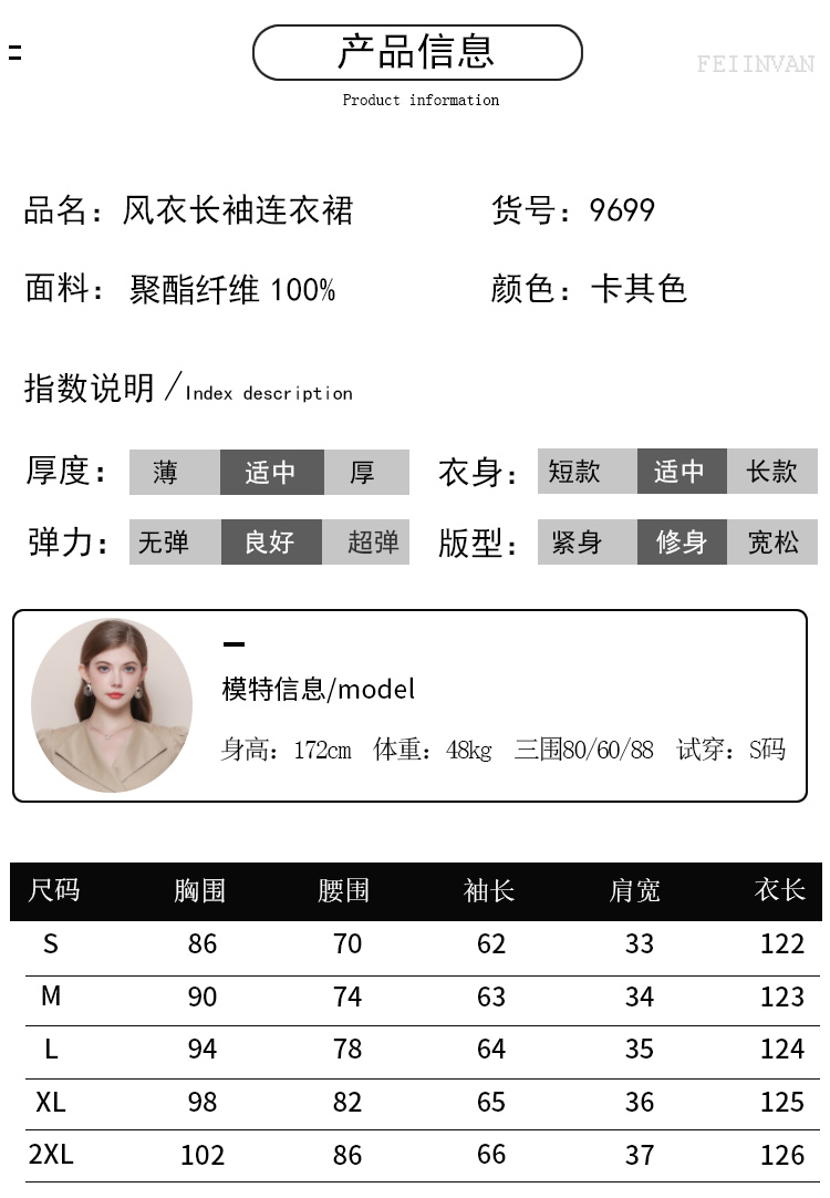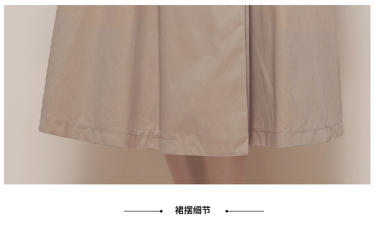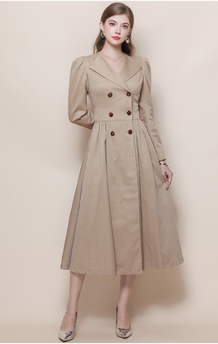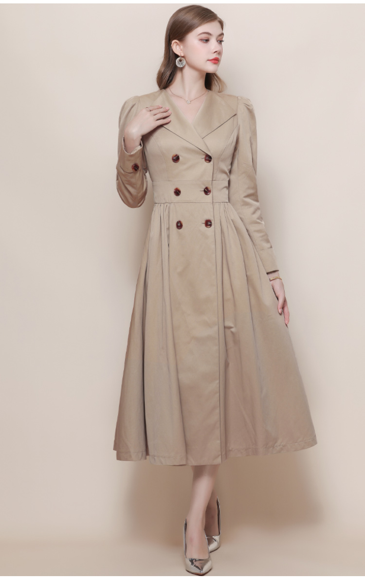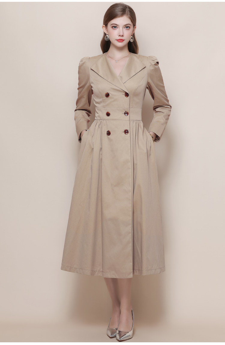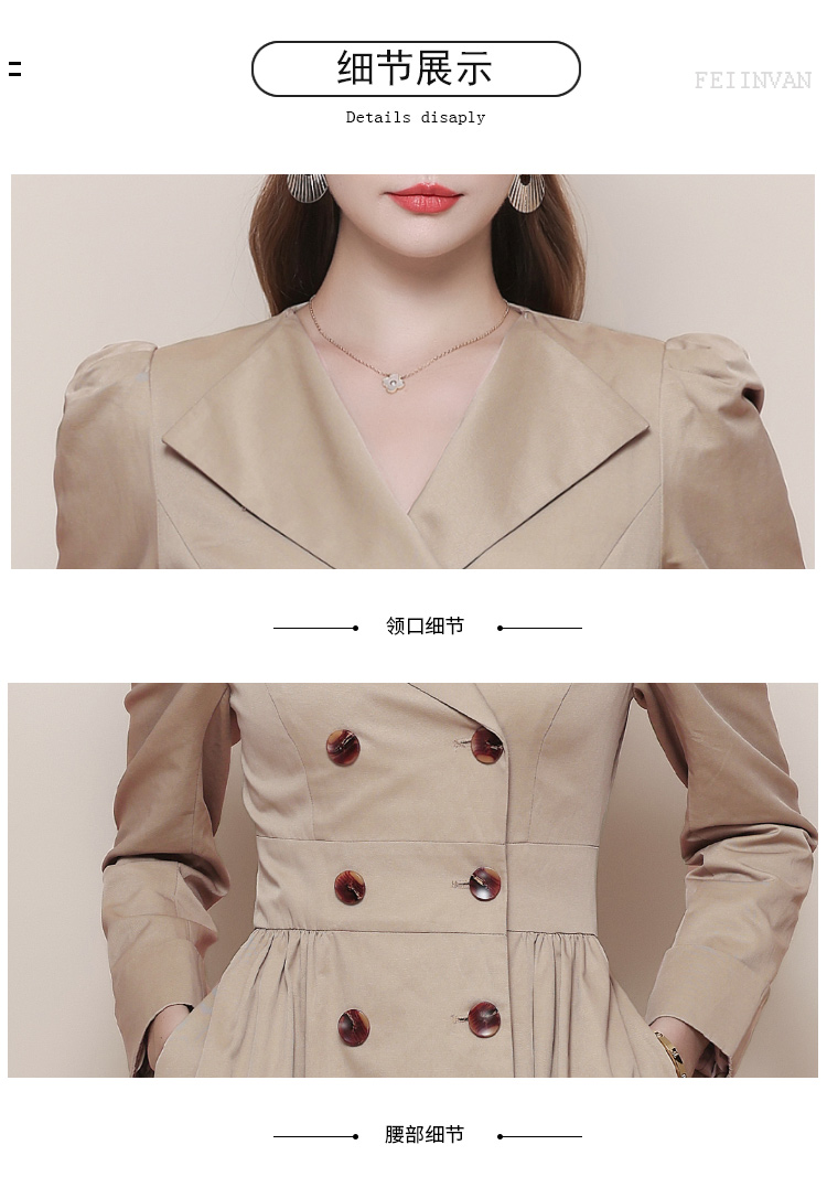 MY15221# 法式复古V领卡其色宽松双排扣收腰长袖风衣外套连衣裙女裝貨源服裝批發
