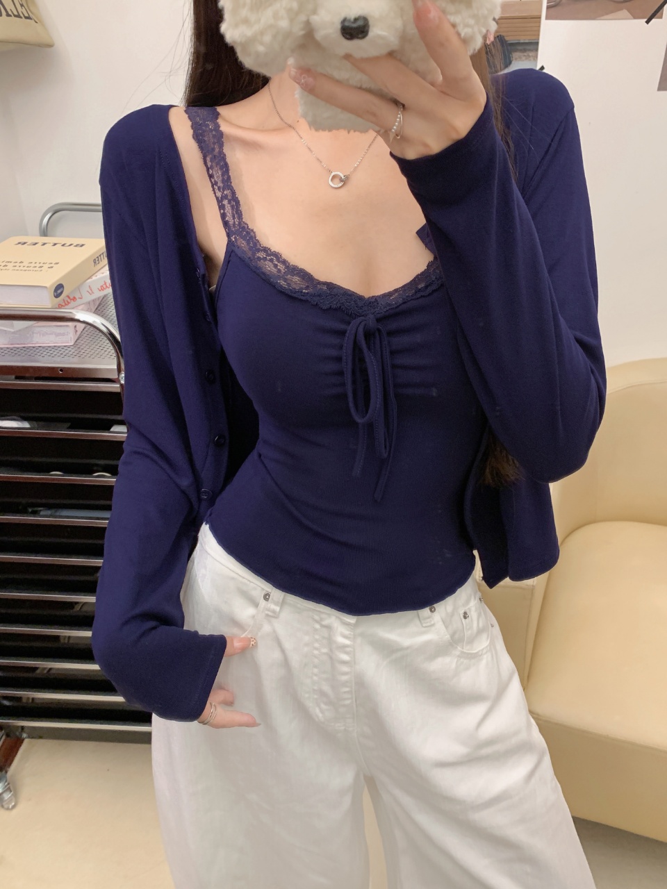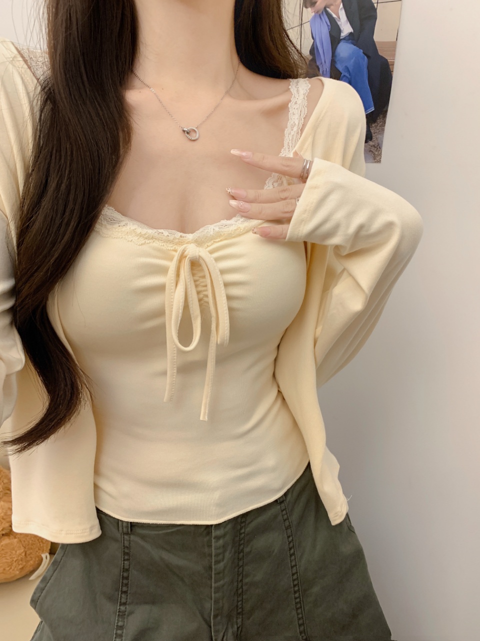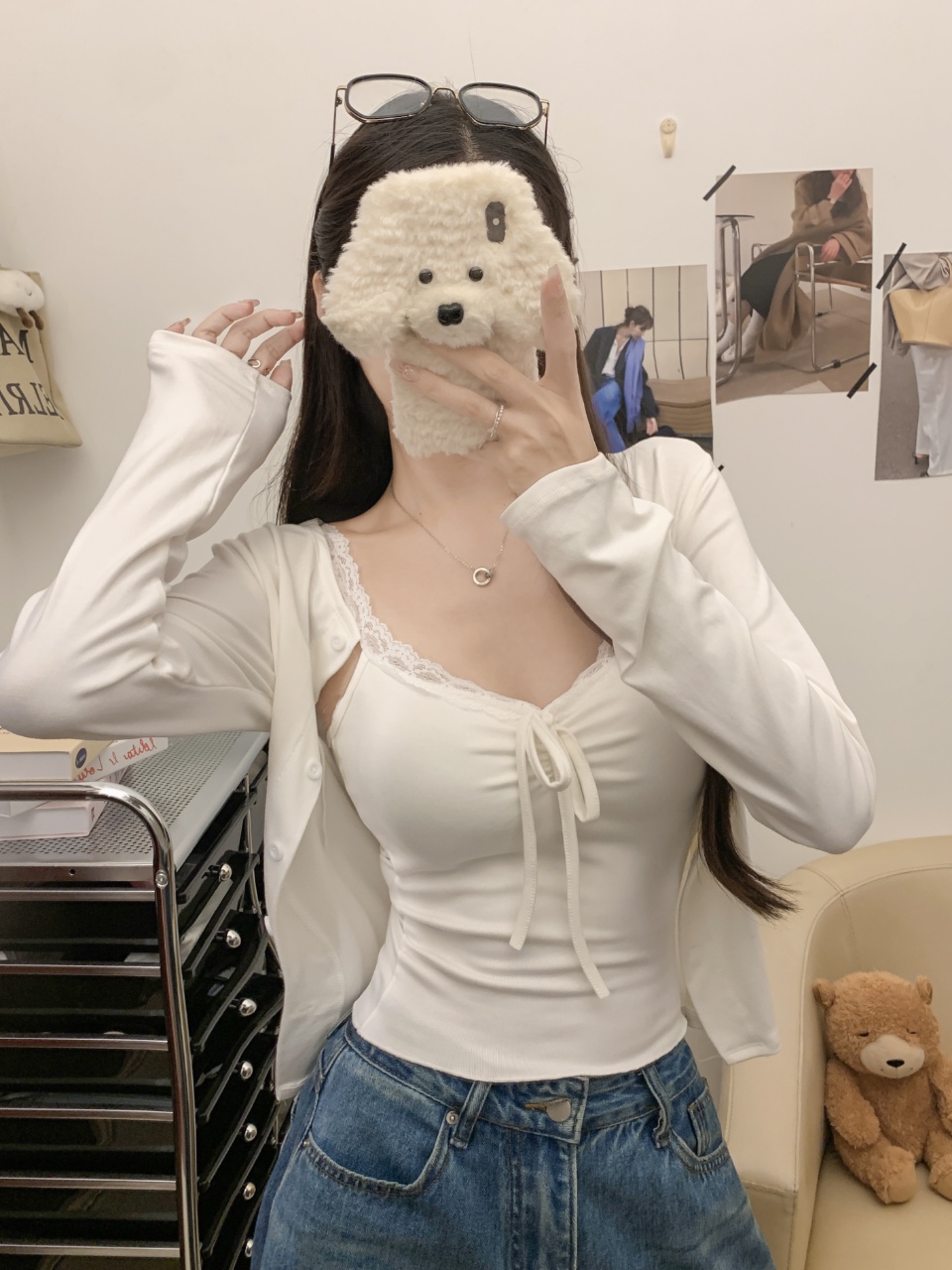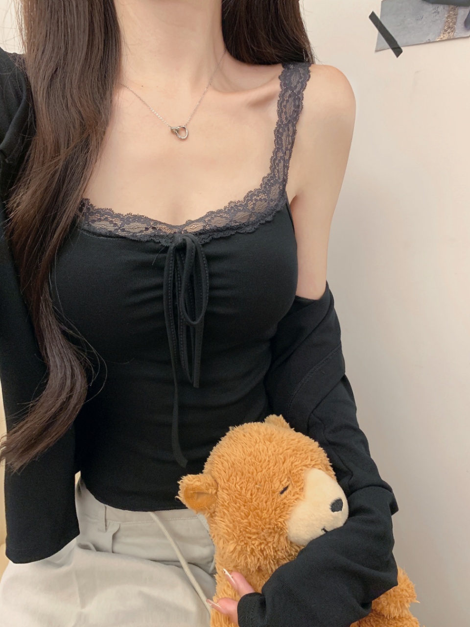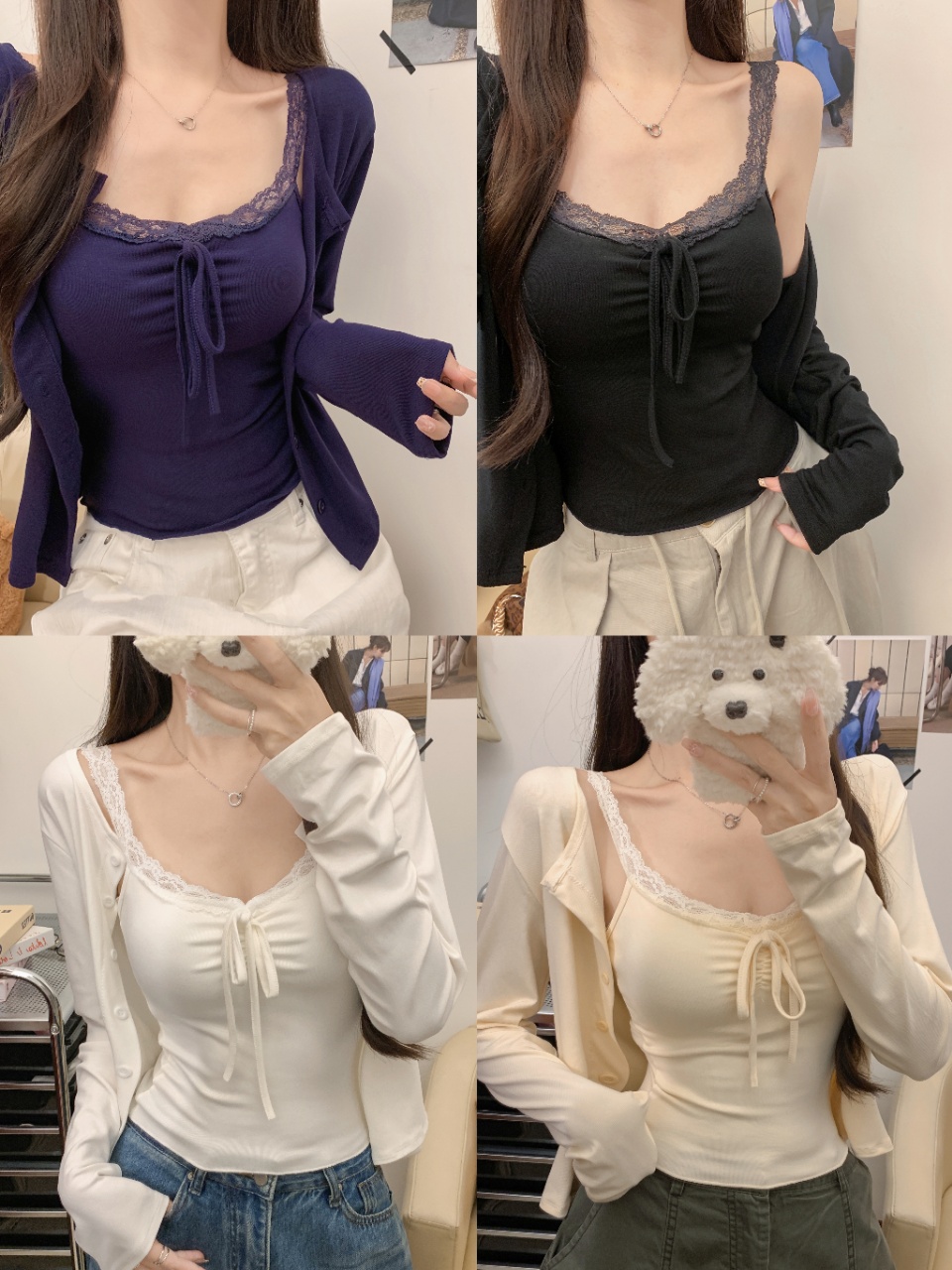 MY15225# 纯欲风蕾丝边系带吊带背心带胸垫长袖修身外套两件套女裝貨源服裝批發