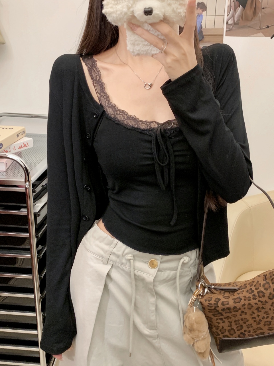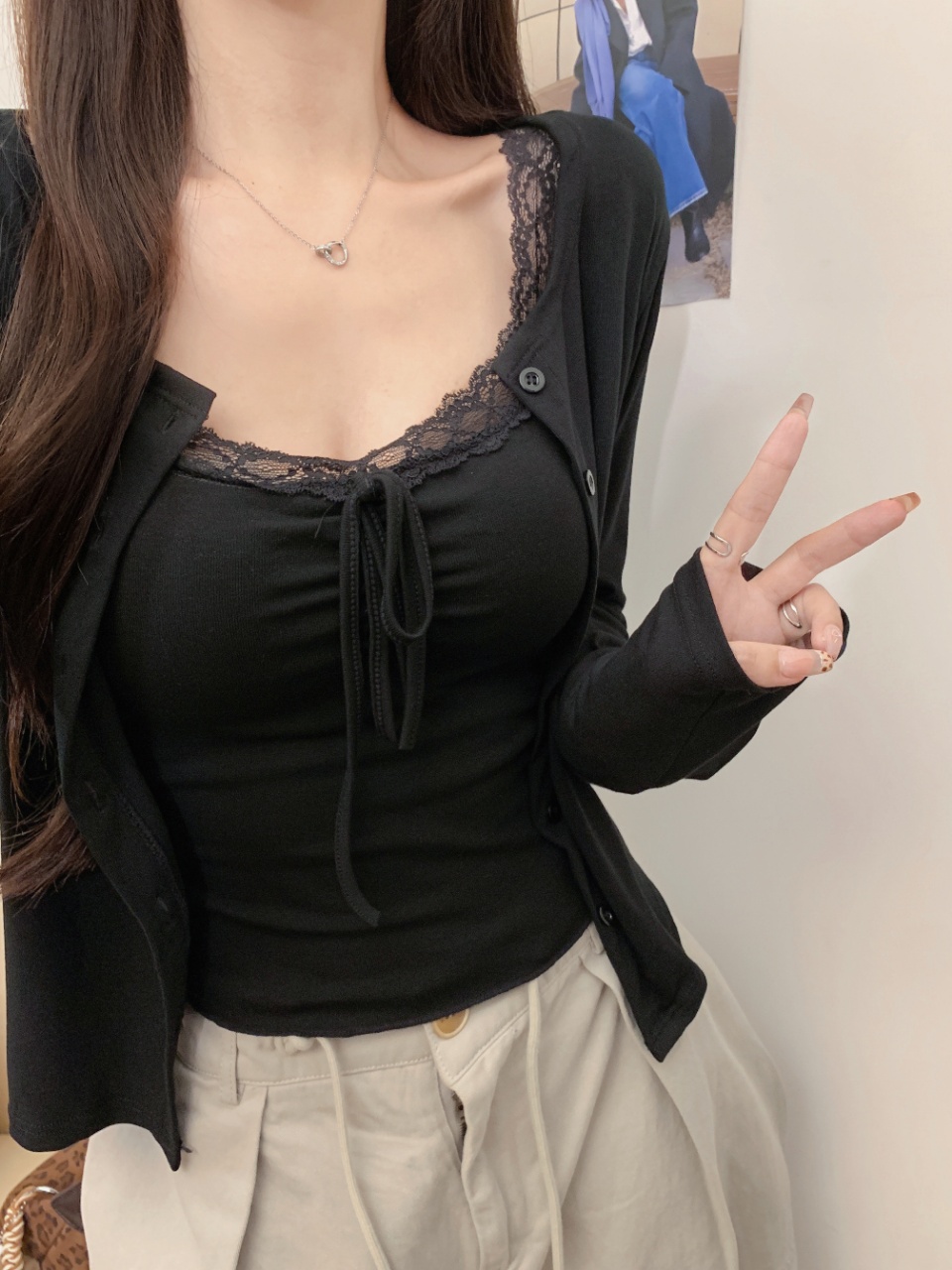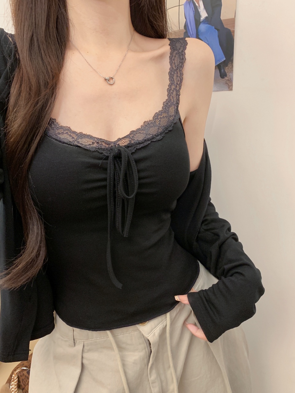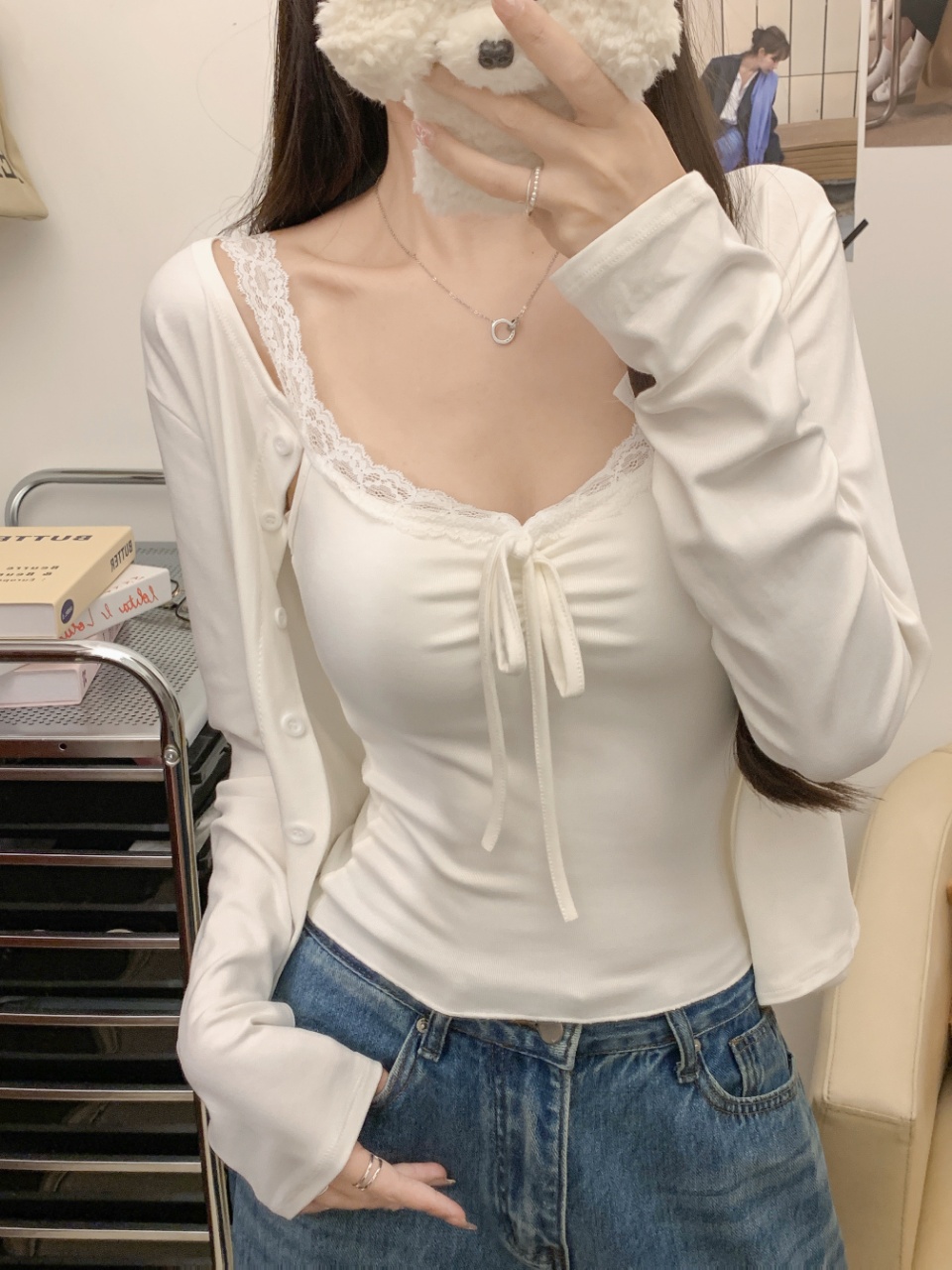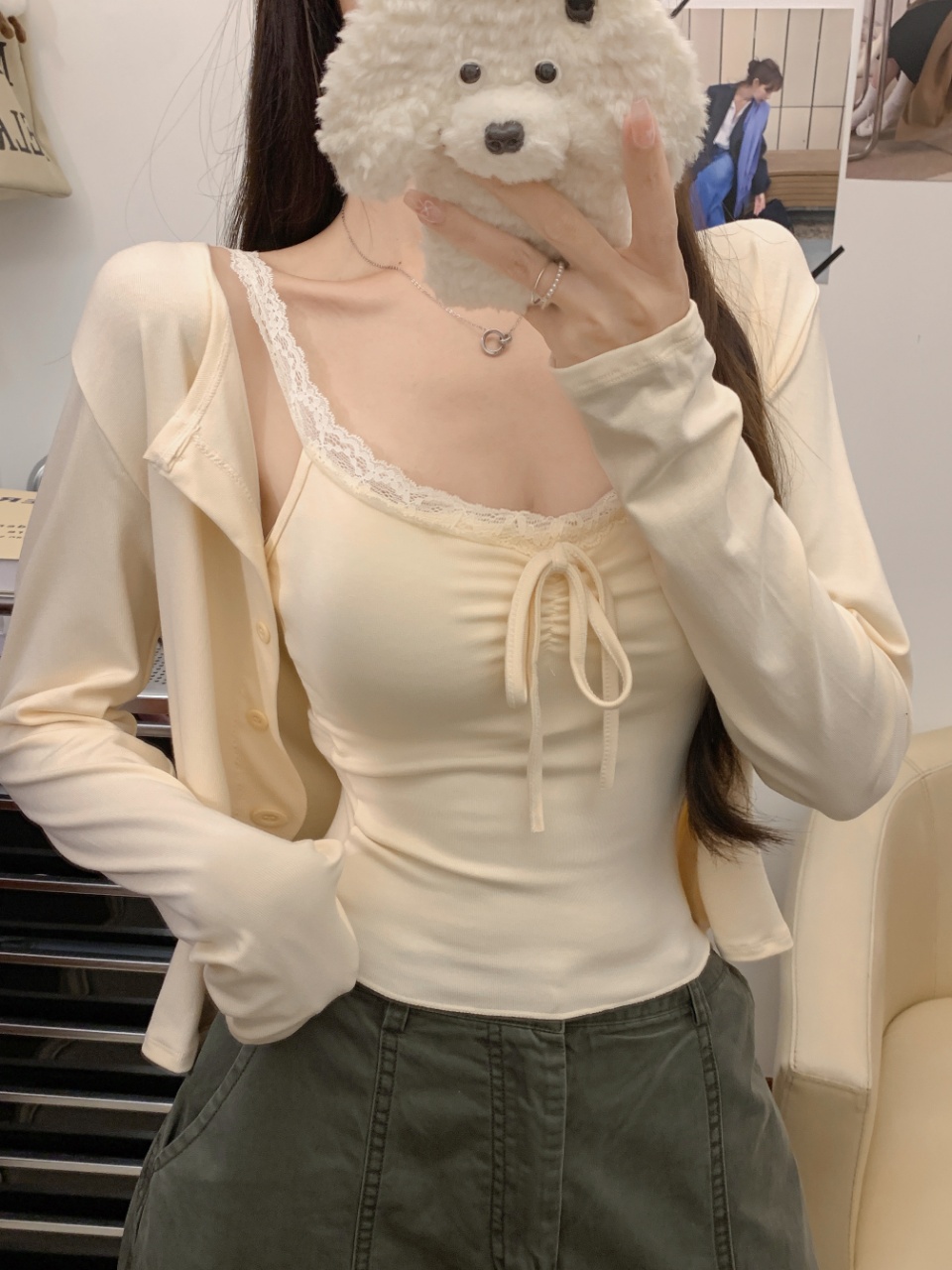 MY15225# 纯欲风蕾丝边系带吊带背心带胸垫长袖修身外套两件套女裝貨源服裝批發