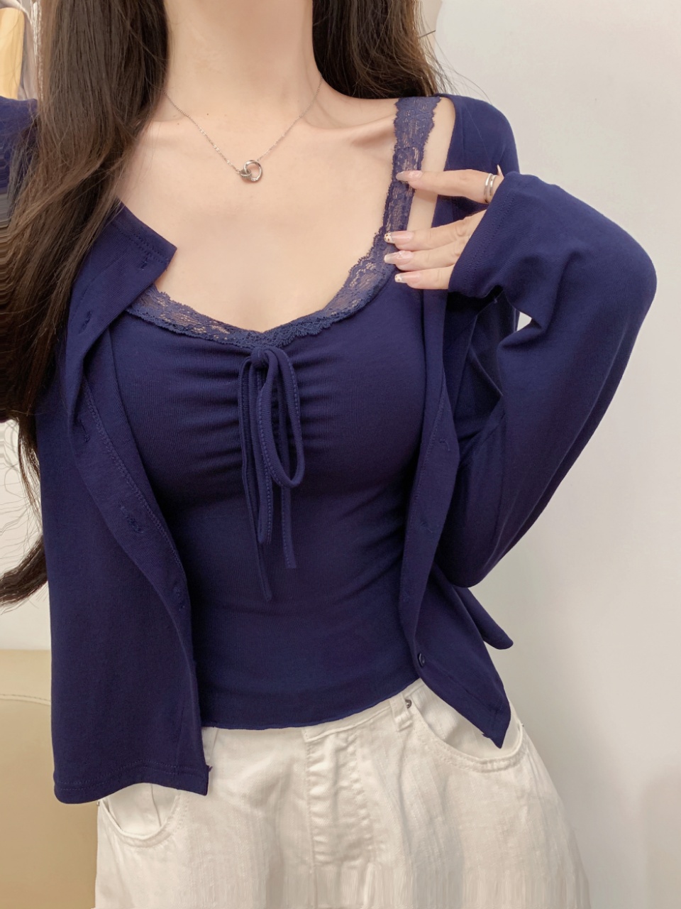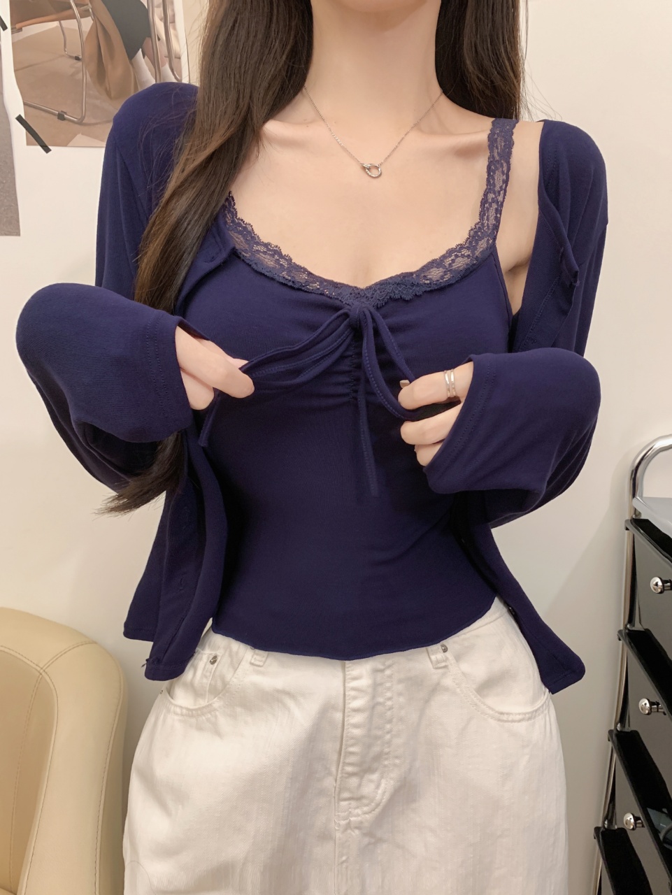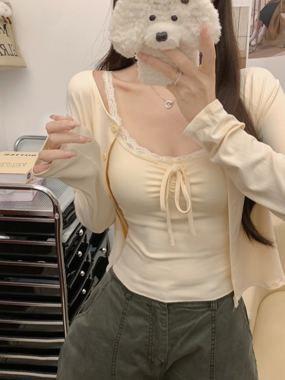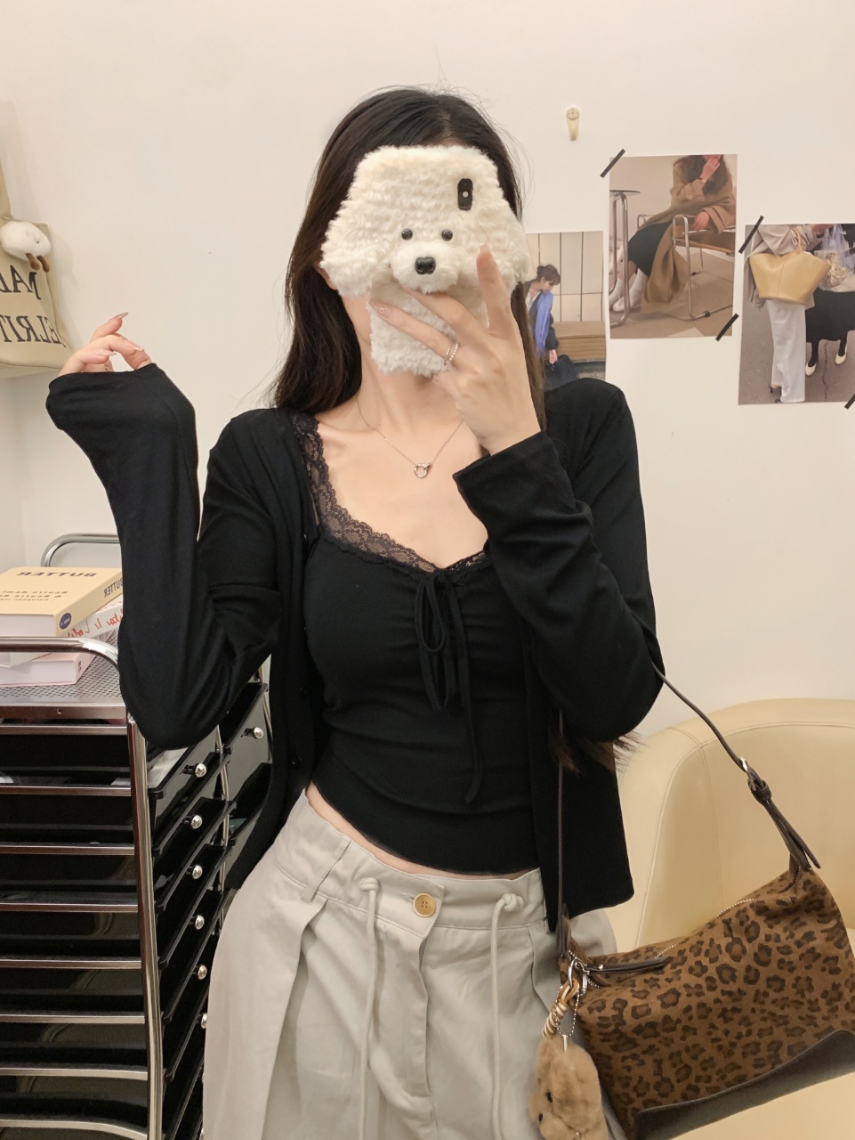 MY15225# 纯欲风蕾丝边系带吊带背心带胸垫长袖修身外套两件套女裝貨源服裝批發