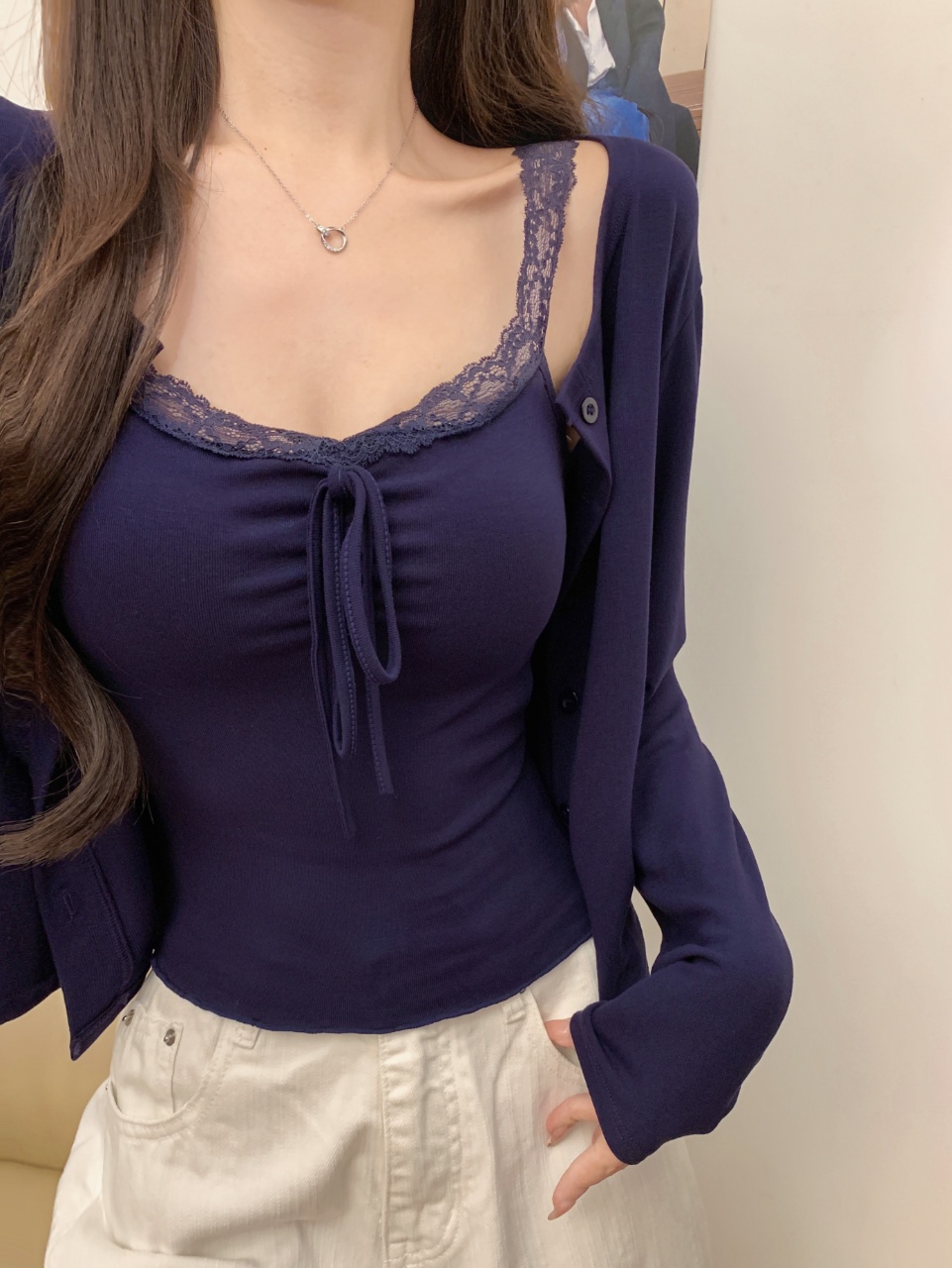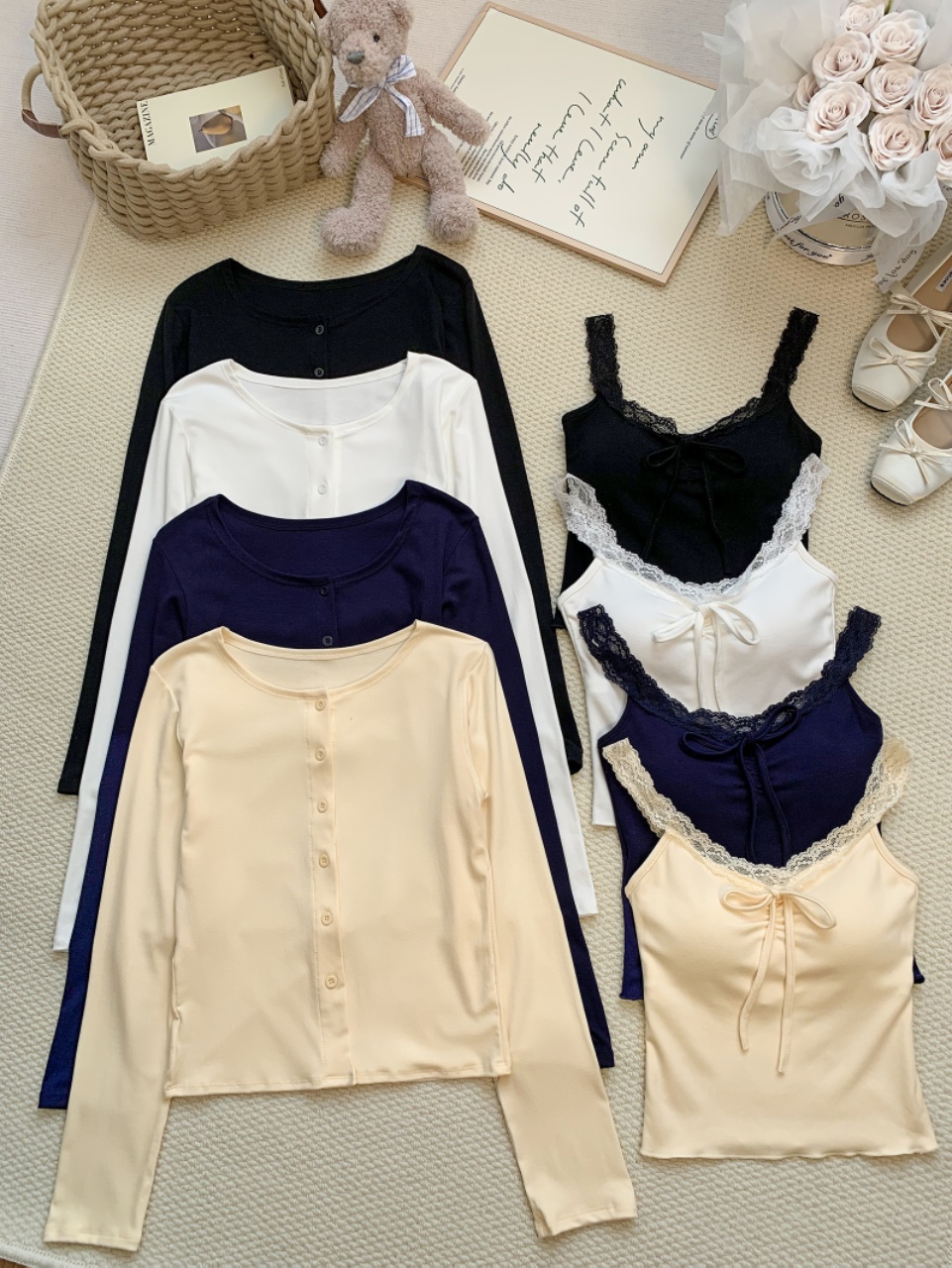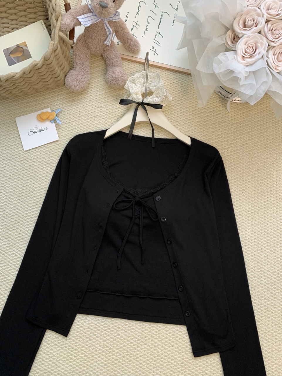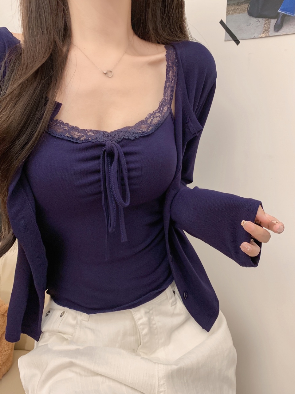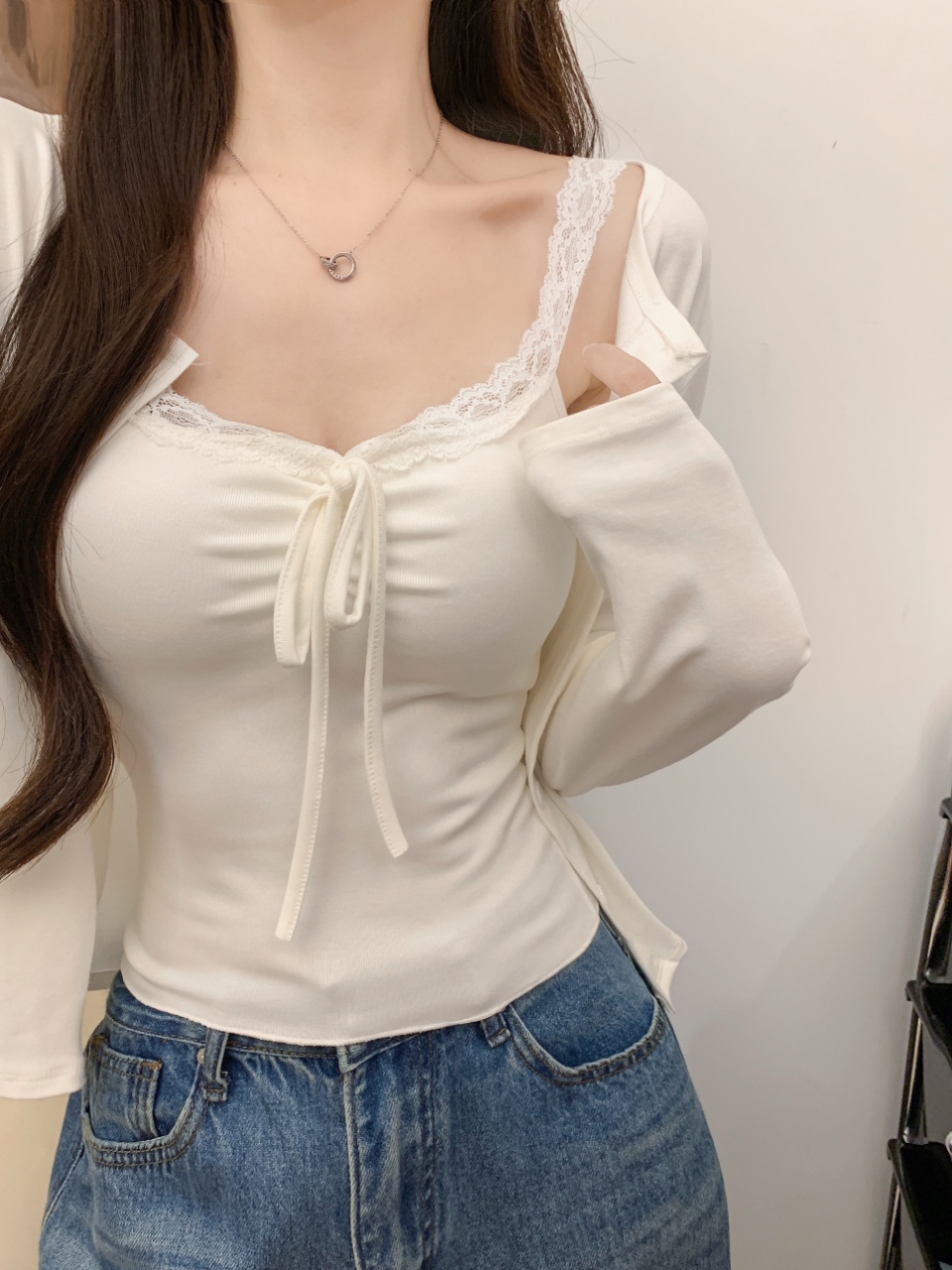 MY15225# 纯欲风蕾丝边系带吊带背心带胸垫长袖修身外套两件套女裝貨源服裝批發