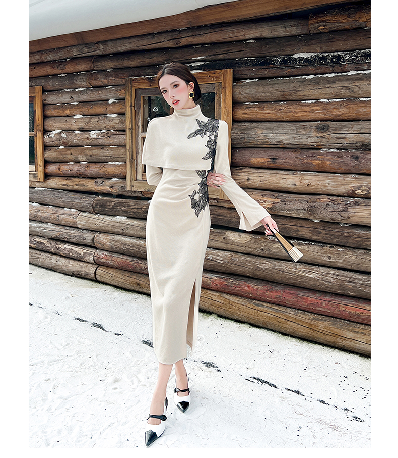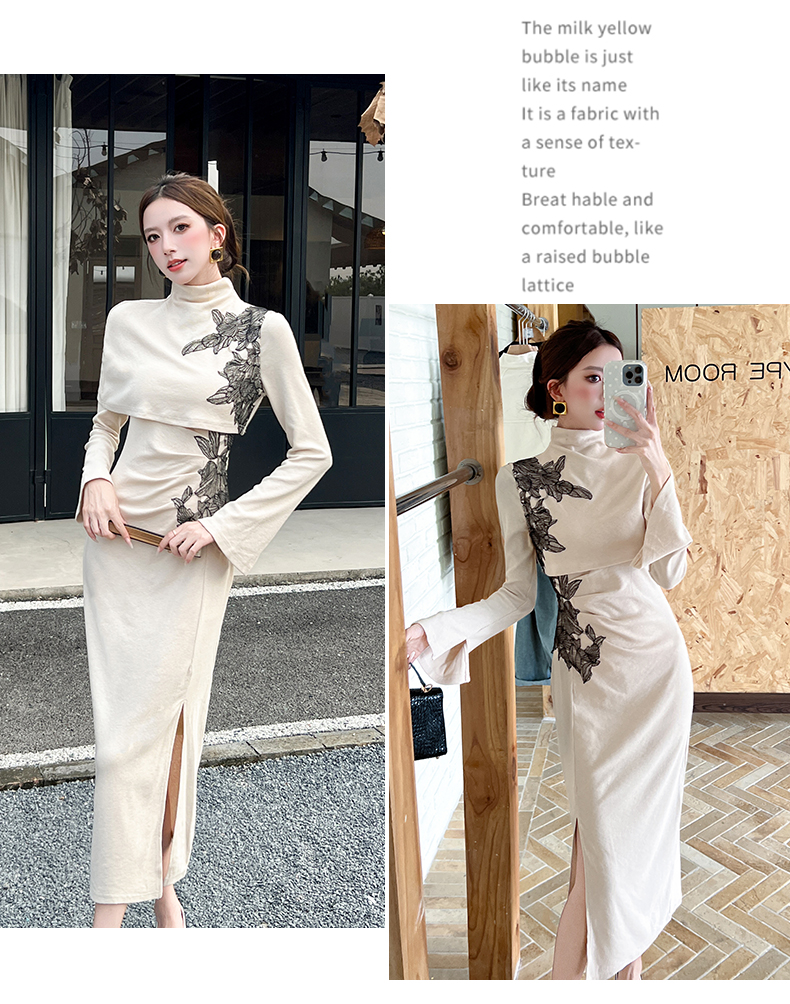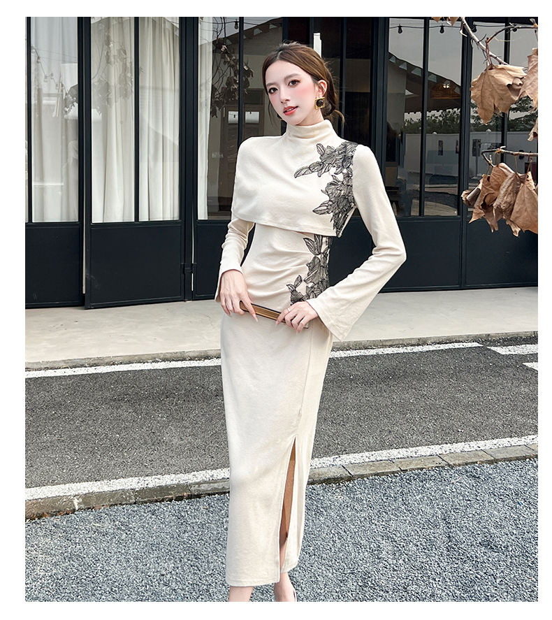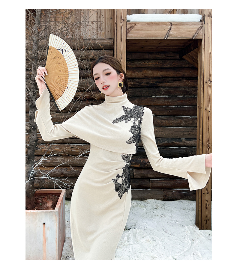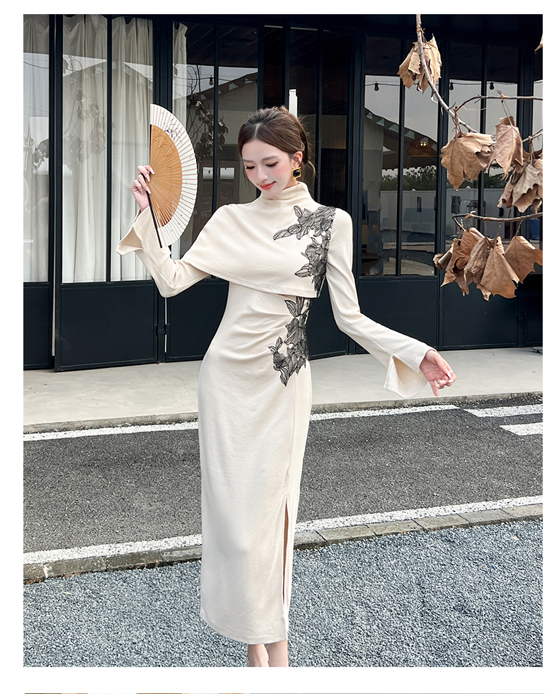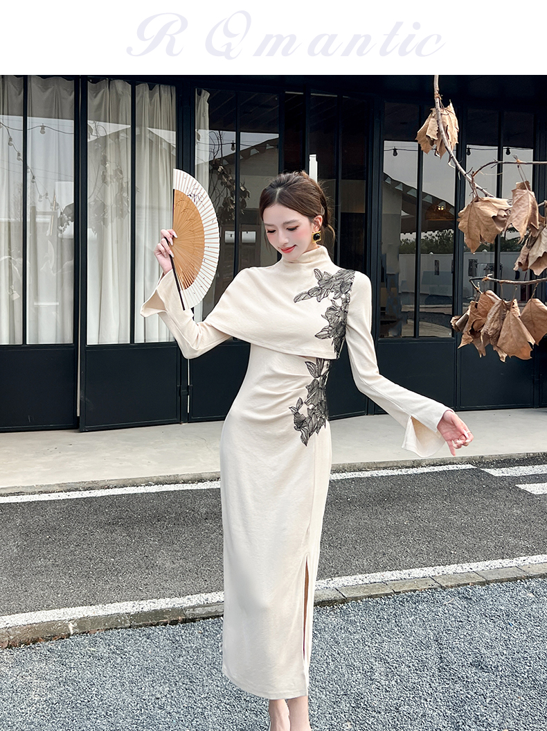 MY15233# 枫叙新中式针织连衣裙女法式斗篷披肩长袖旗袍长裙女裝貨源服裝批發