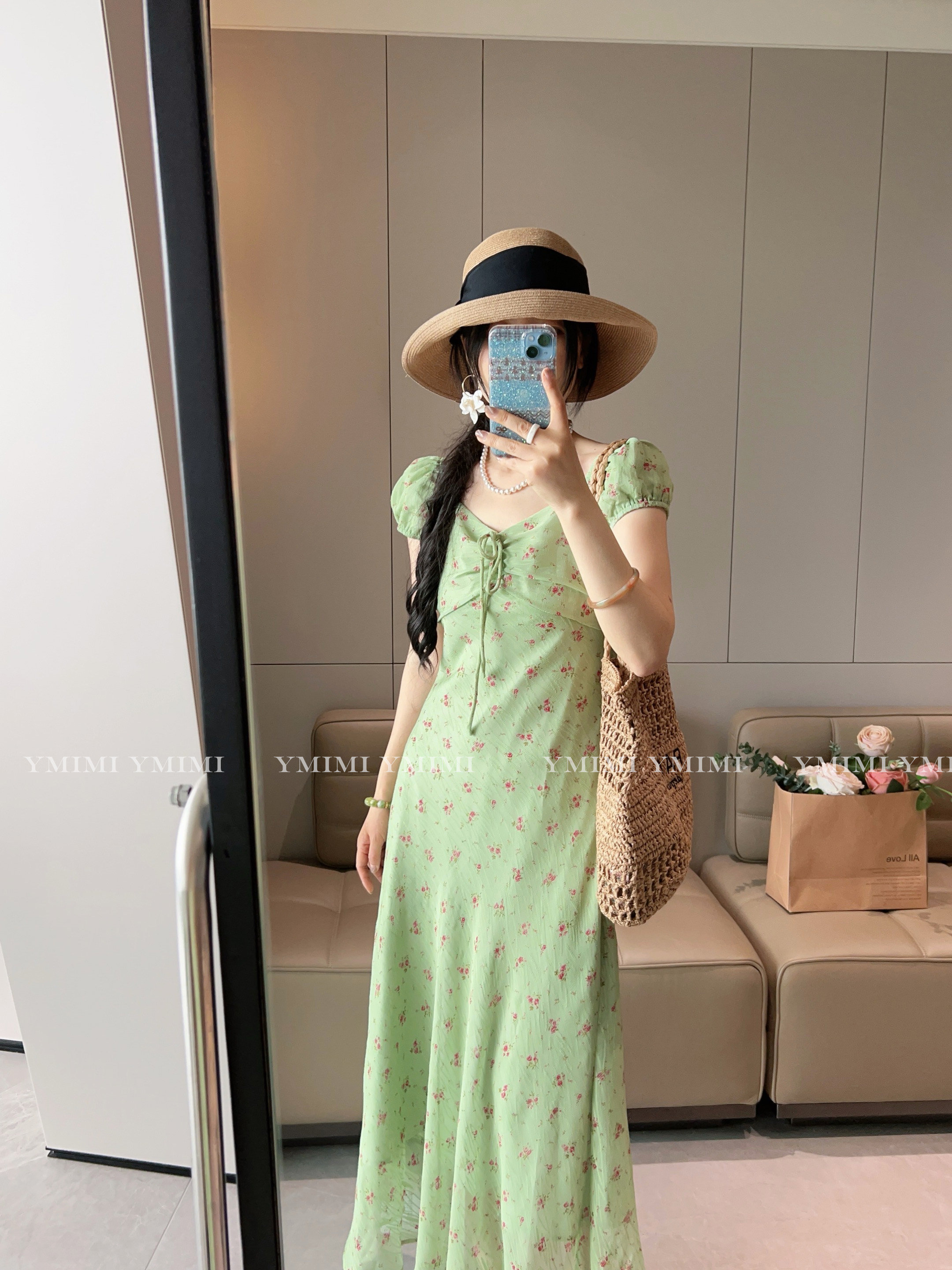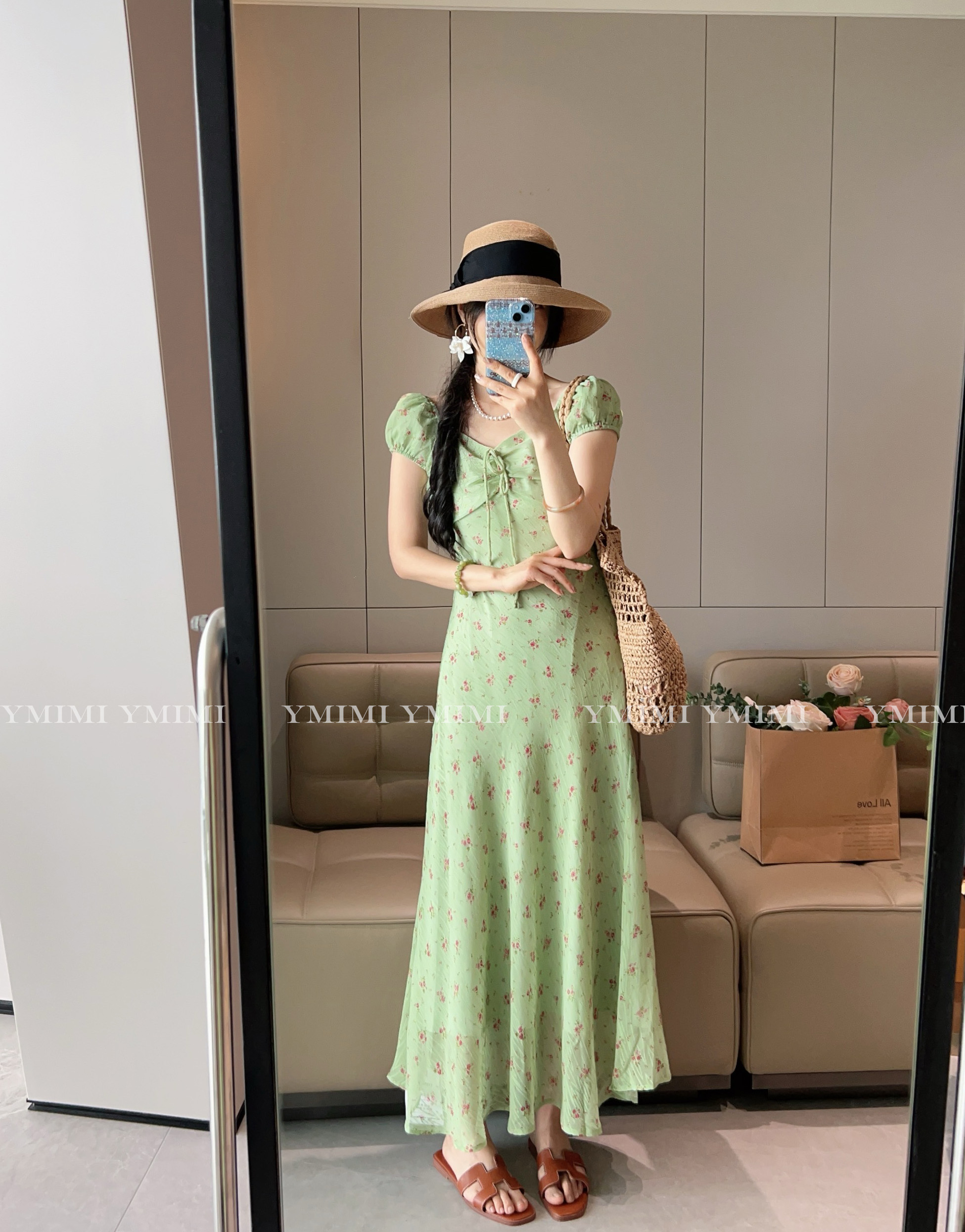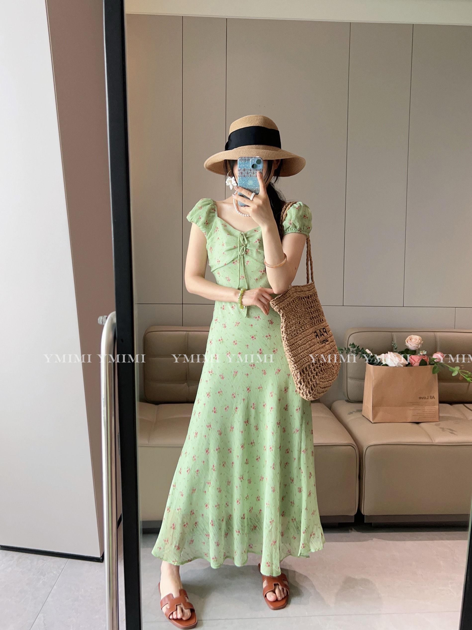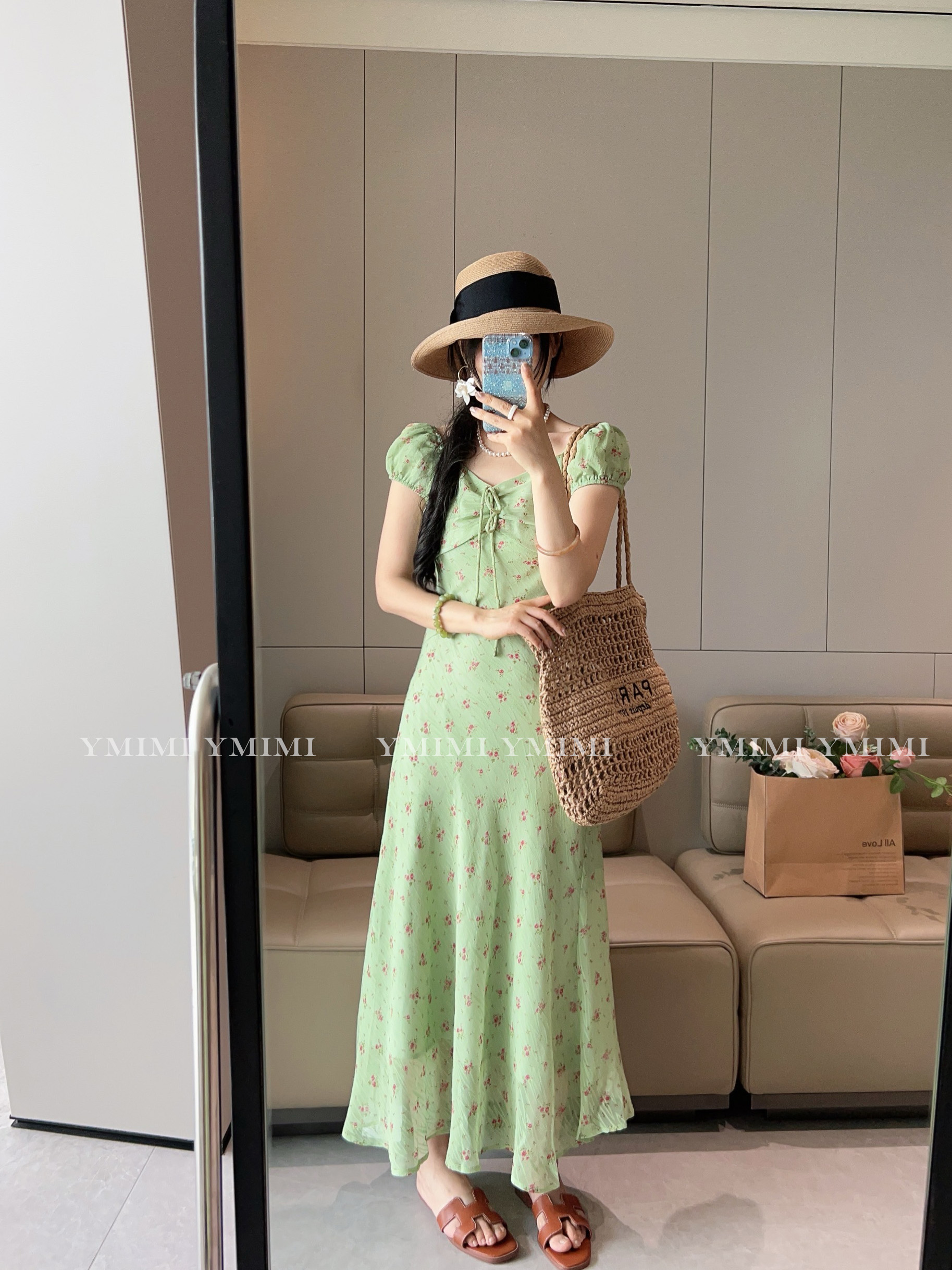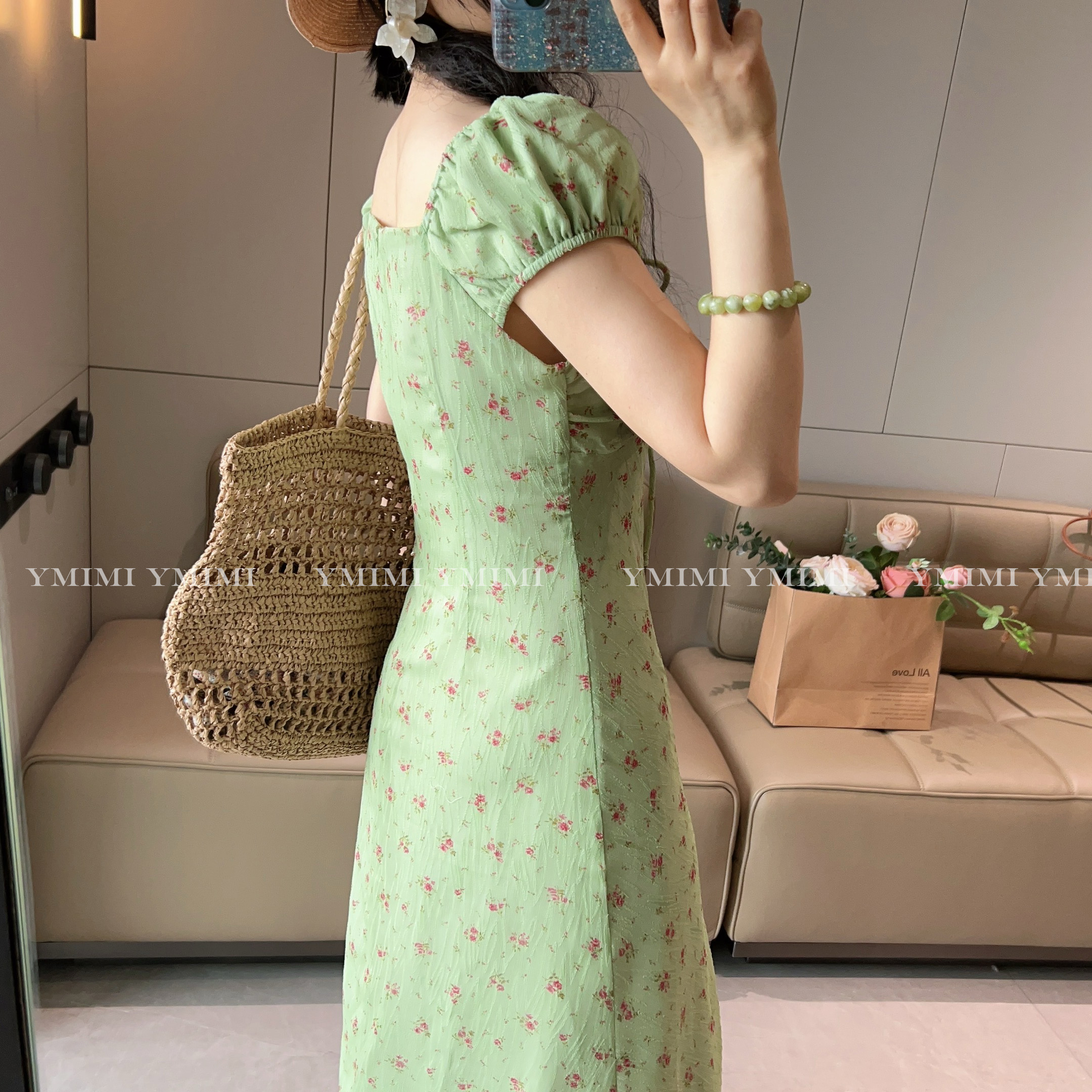 BY9179#法式复古方领绿色碎花短袖连衣裙女2025夏季新款收腰显瘦气质长裙
