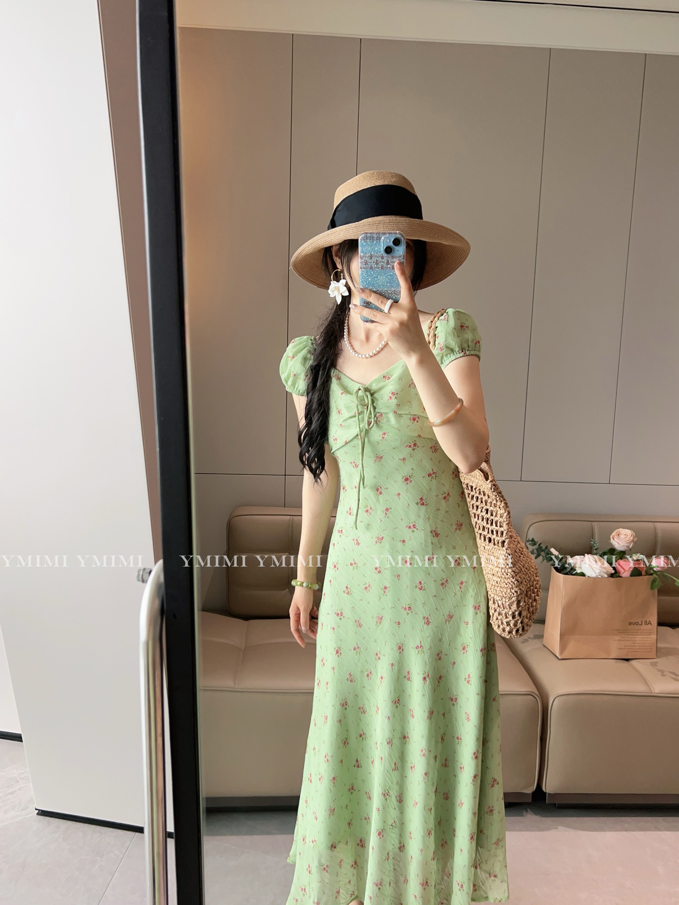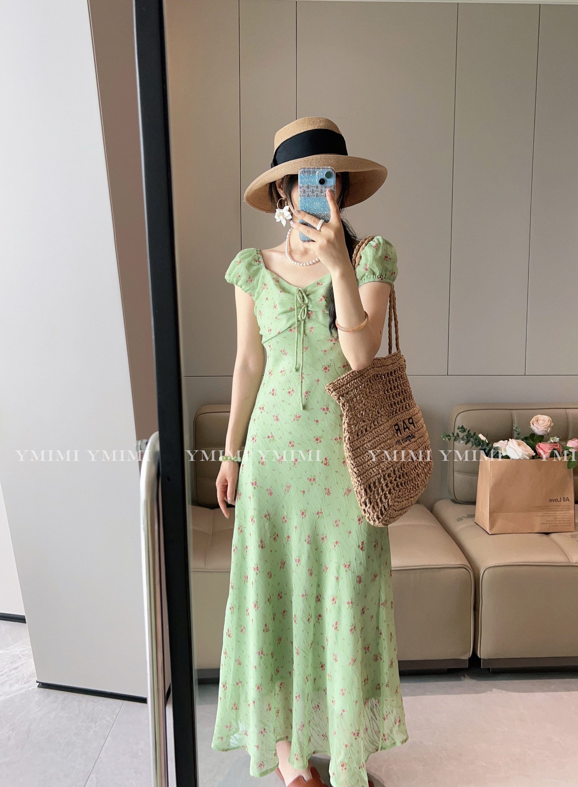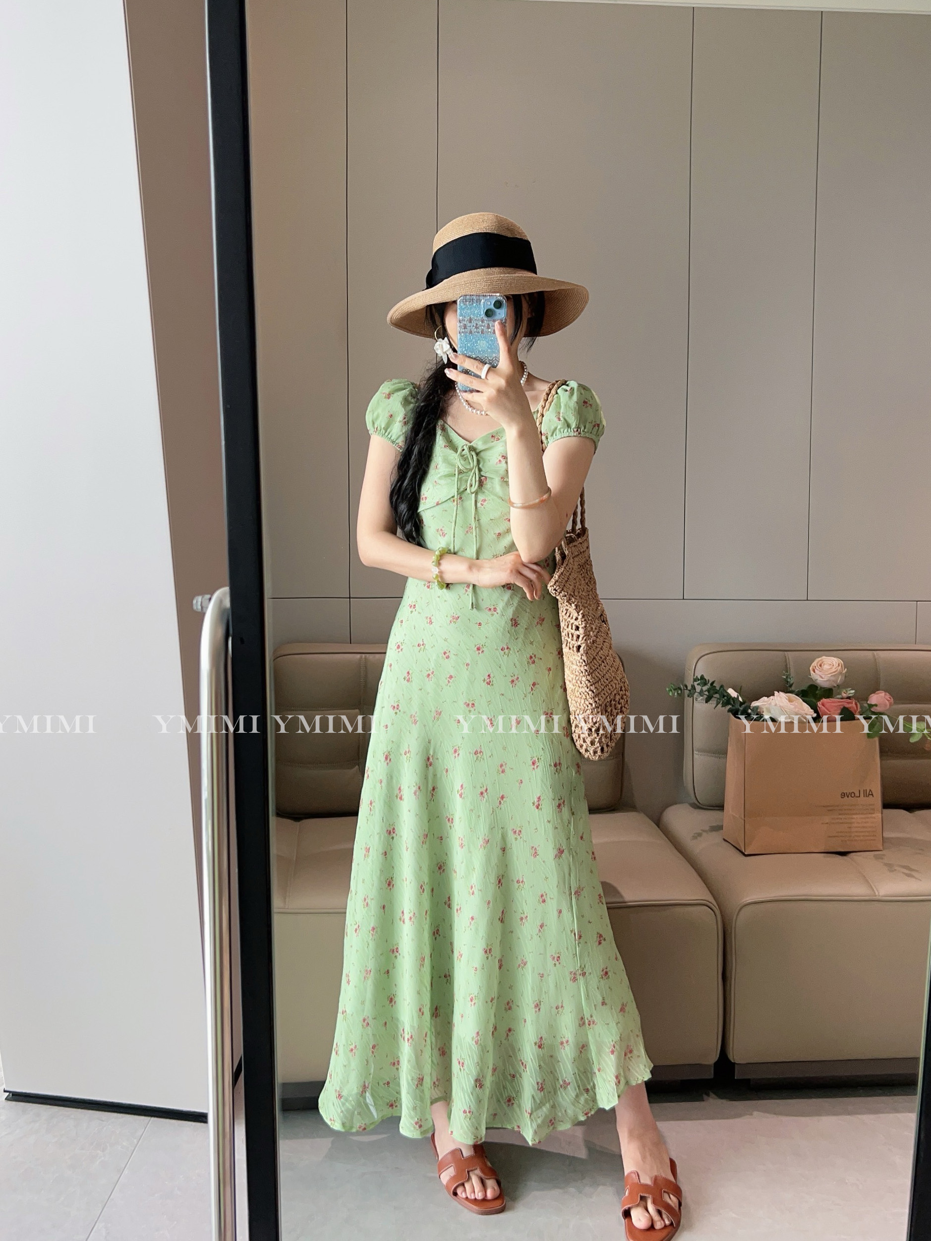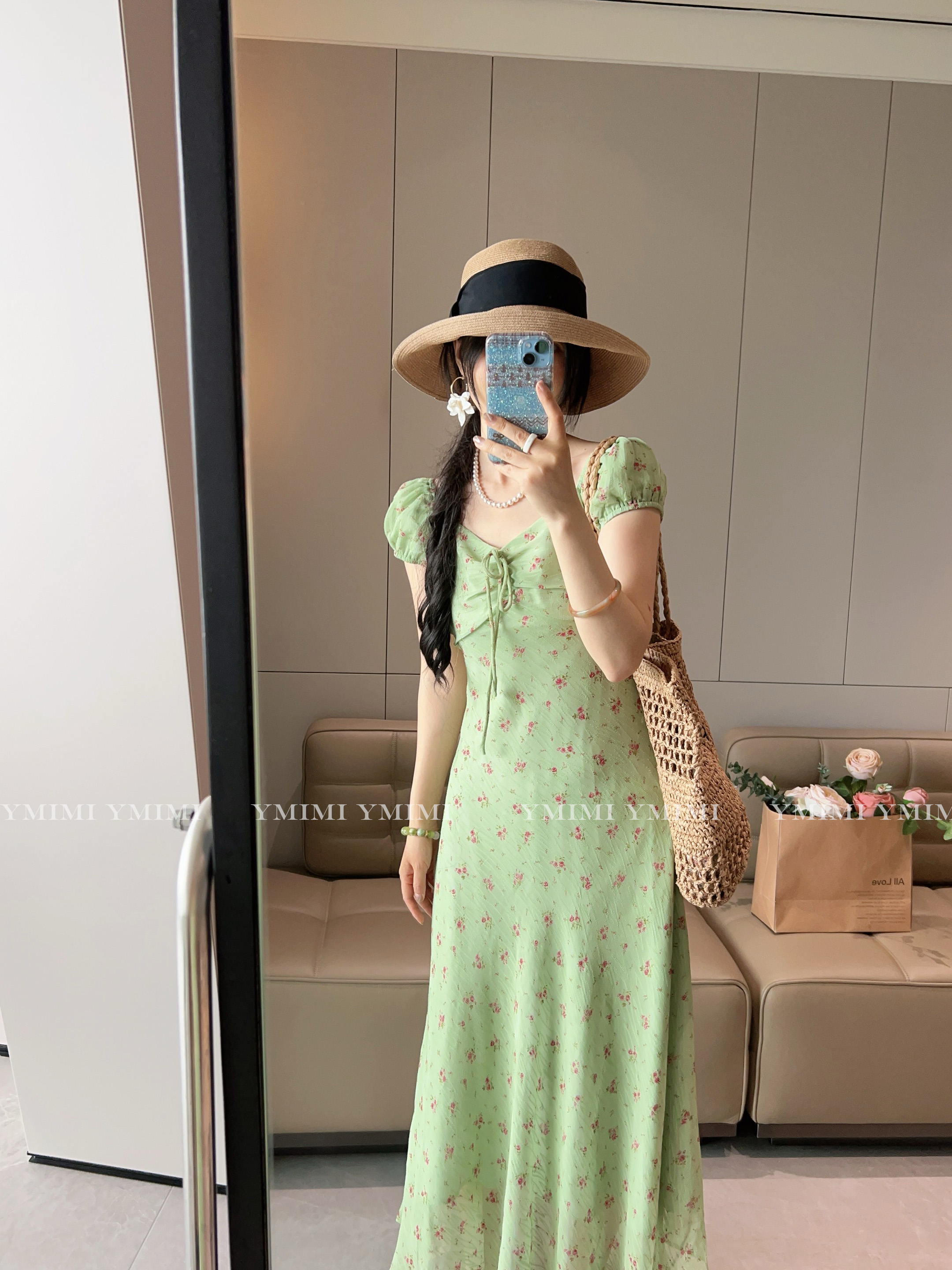 BY9179#法式复古方领绿色碎花短袖连衣裙女2025夏季新款收腰显瘦气质长裙