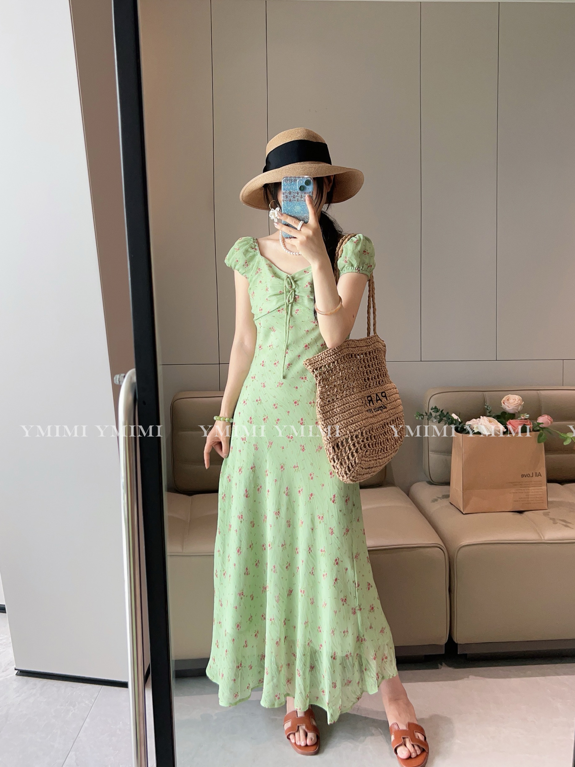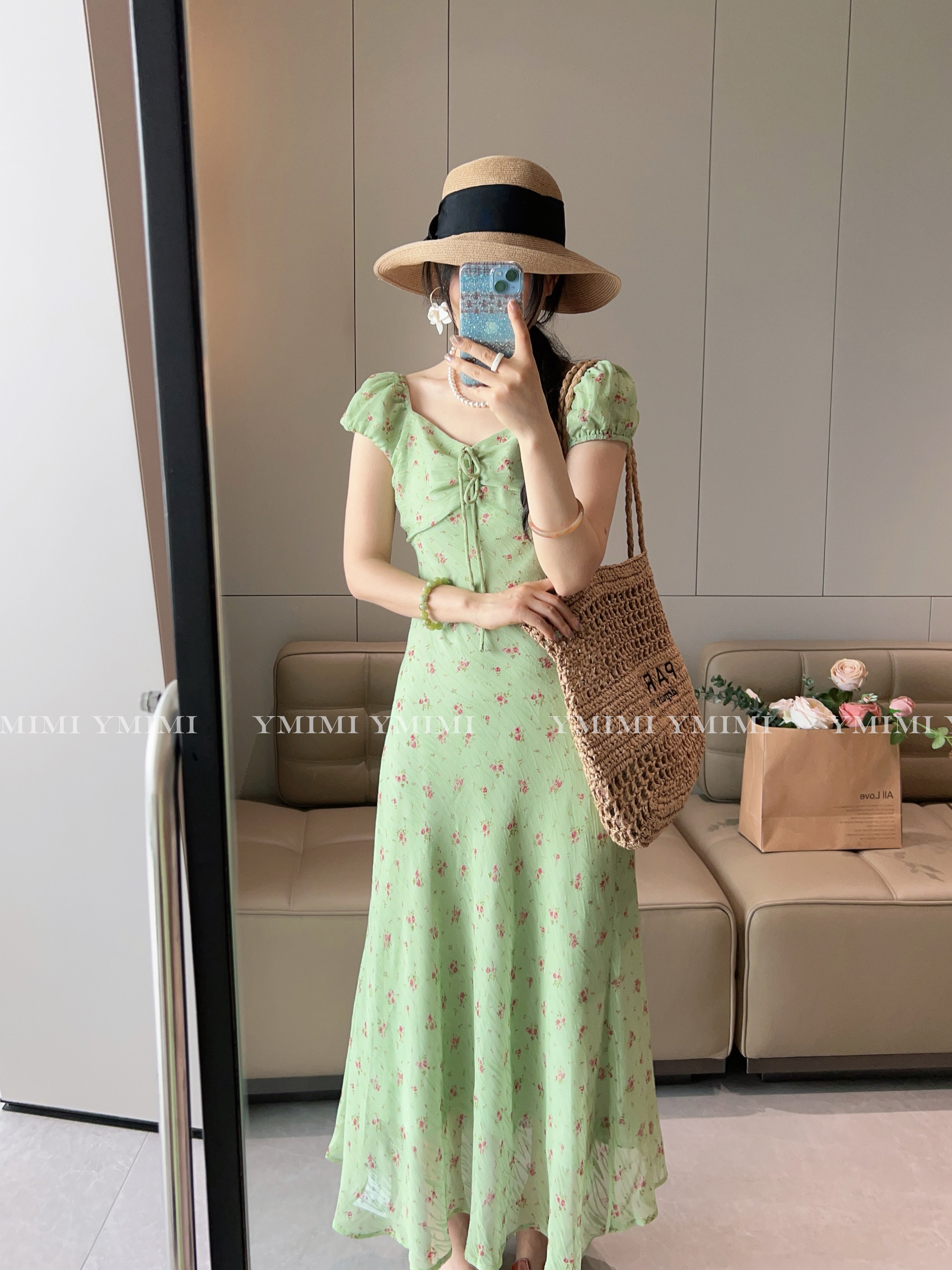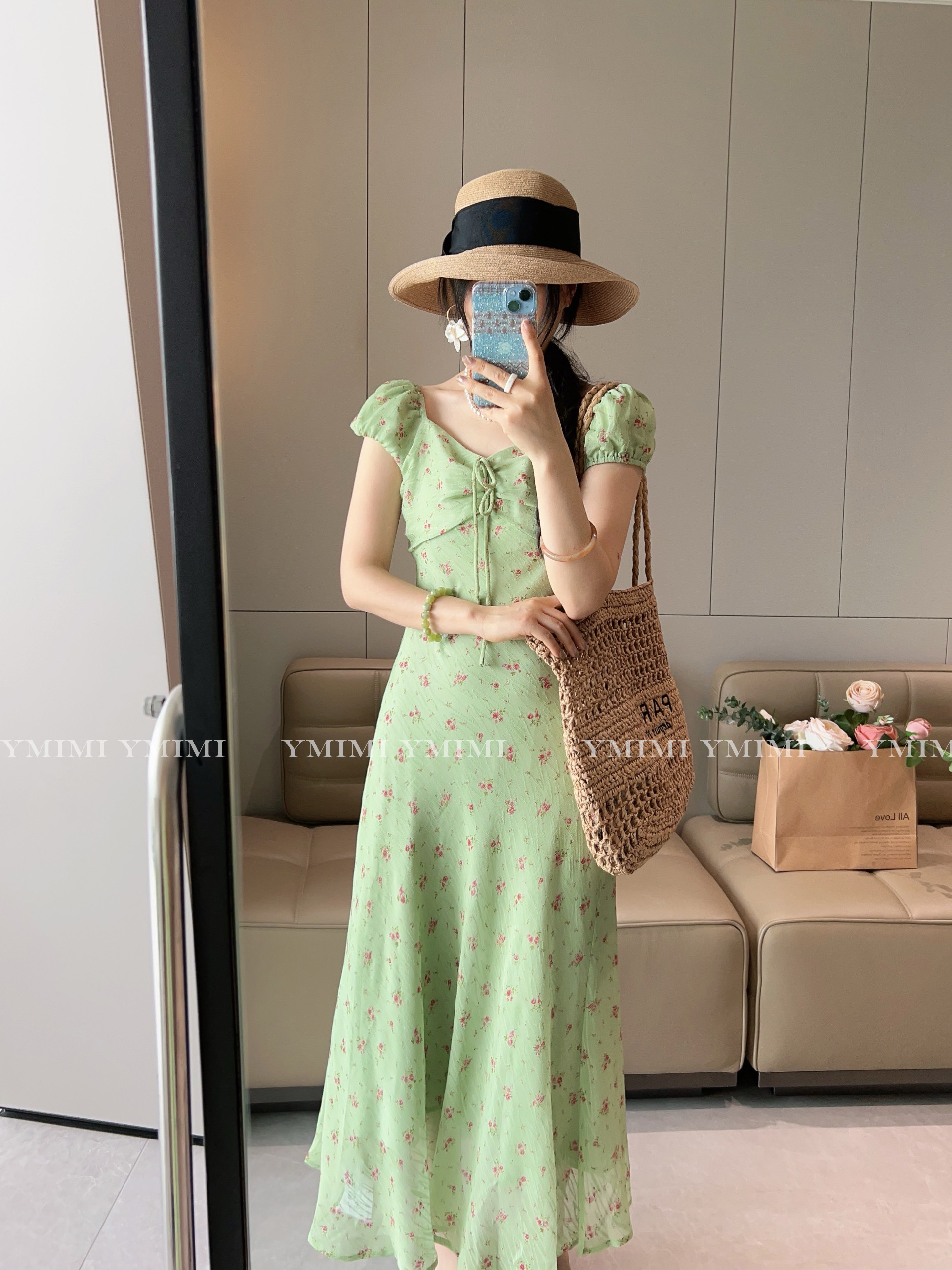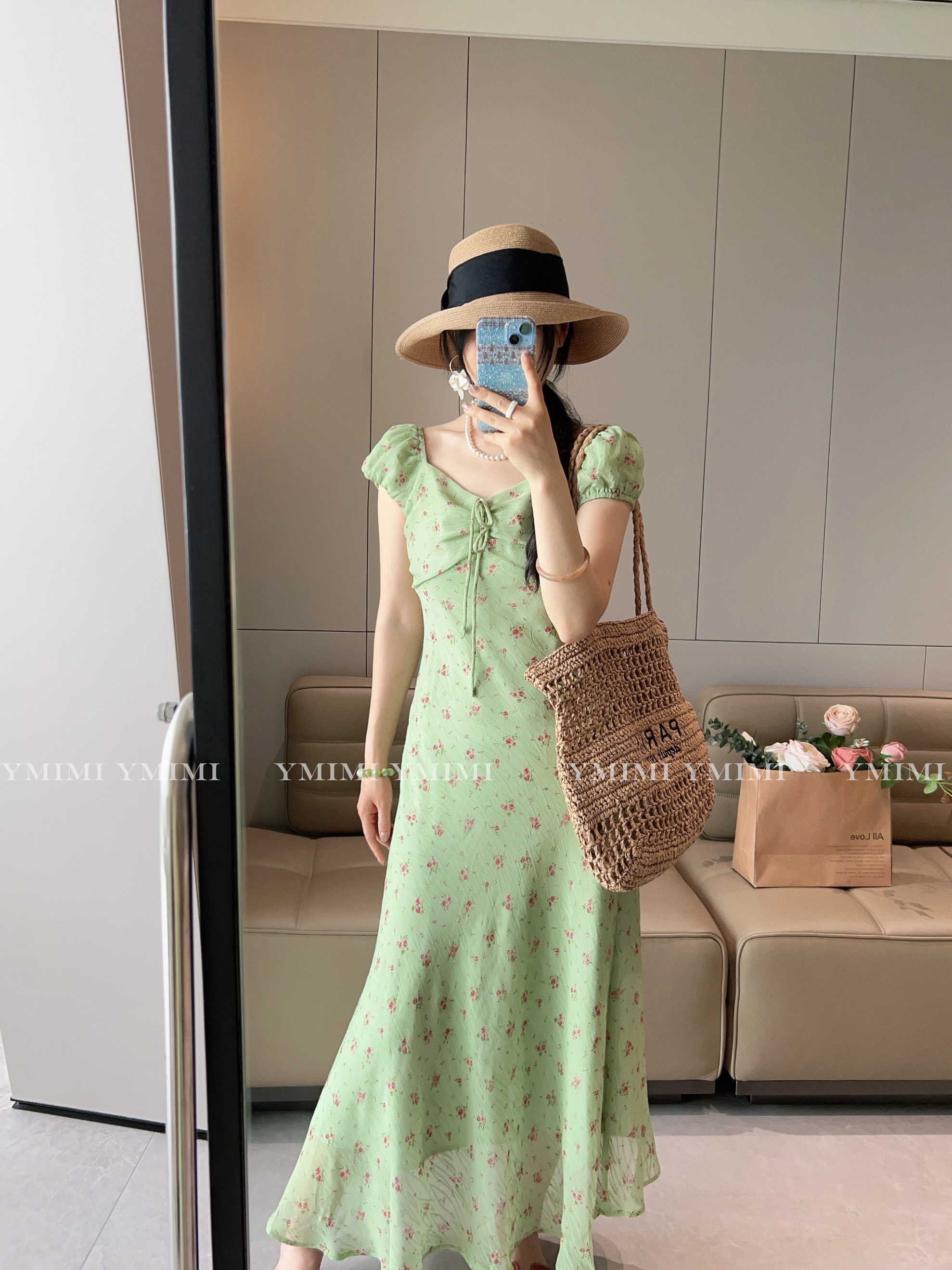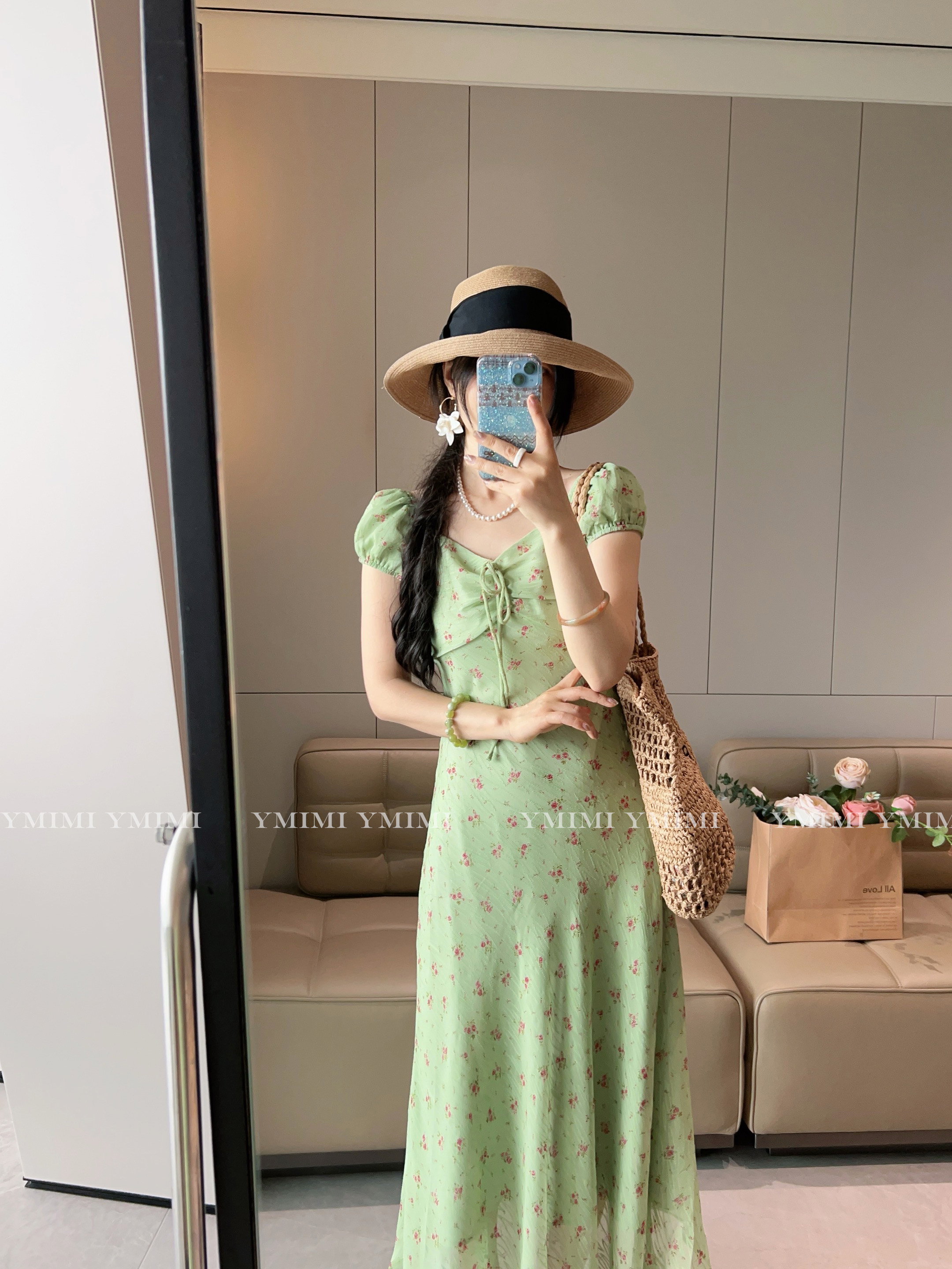 BY9179#法式复古方领绿色碎花短袖连衣裙女2025夏季新款收腰显瘦气质长裙
