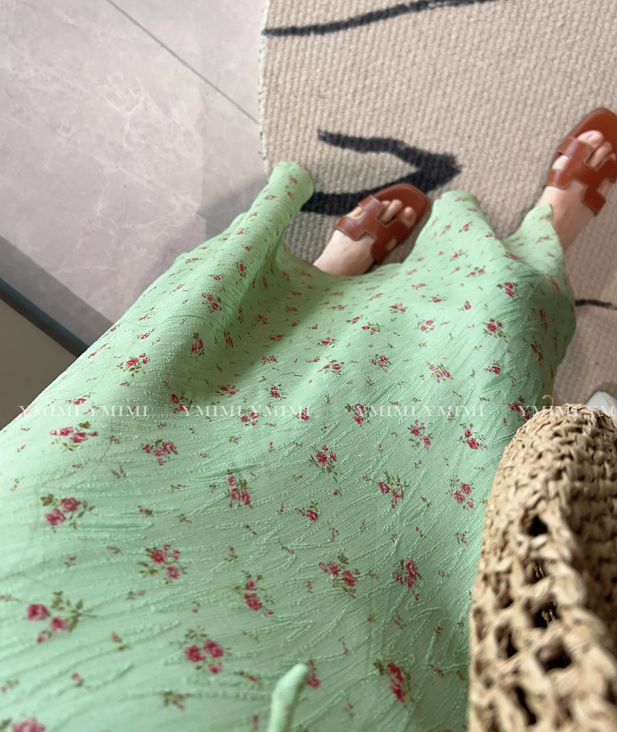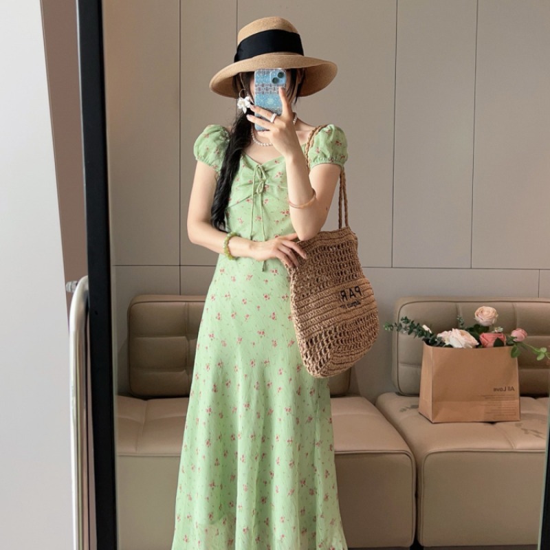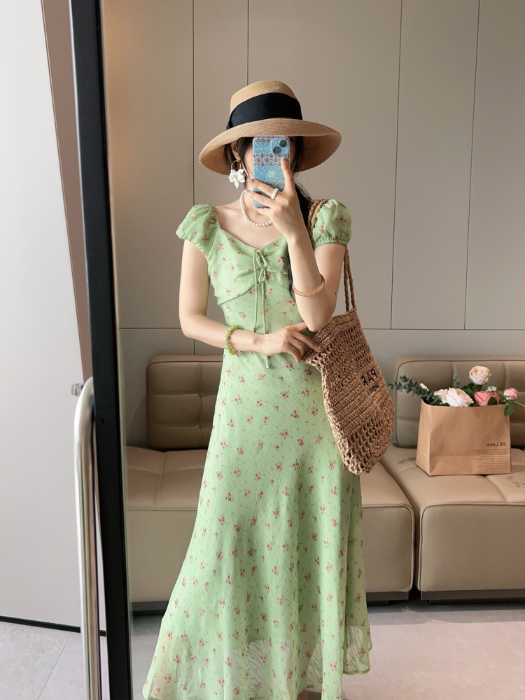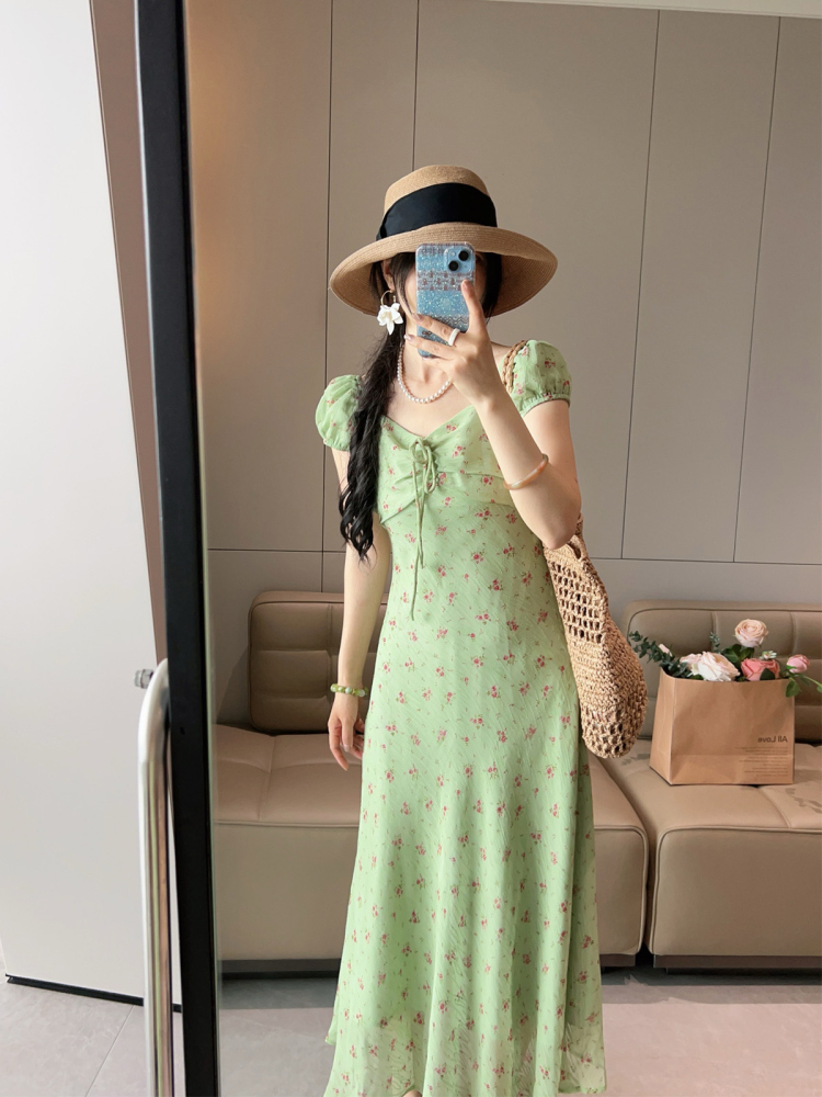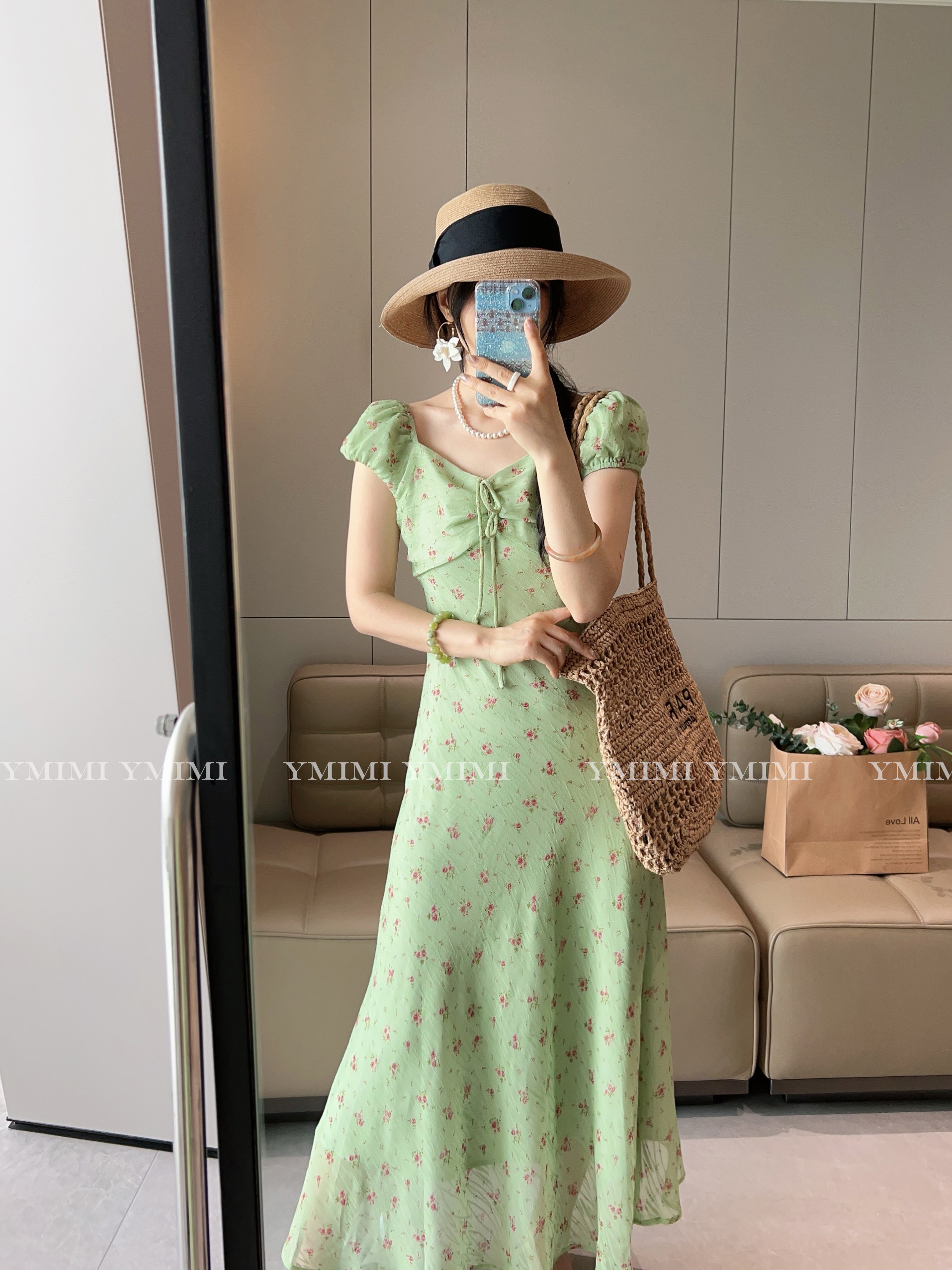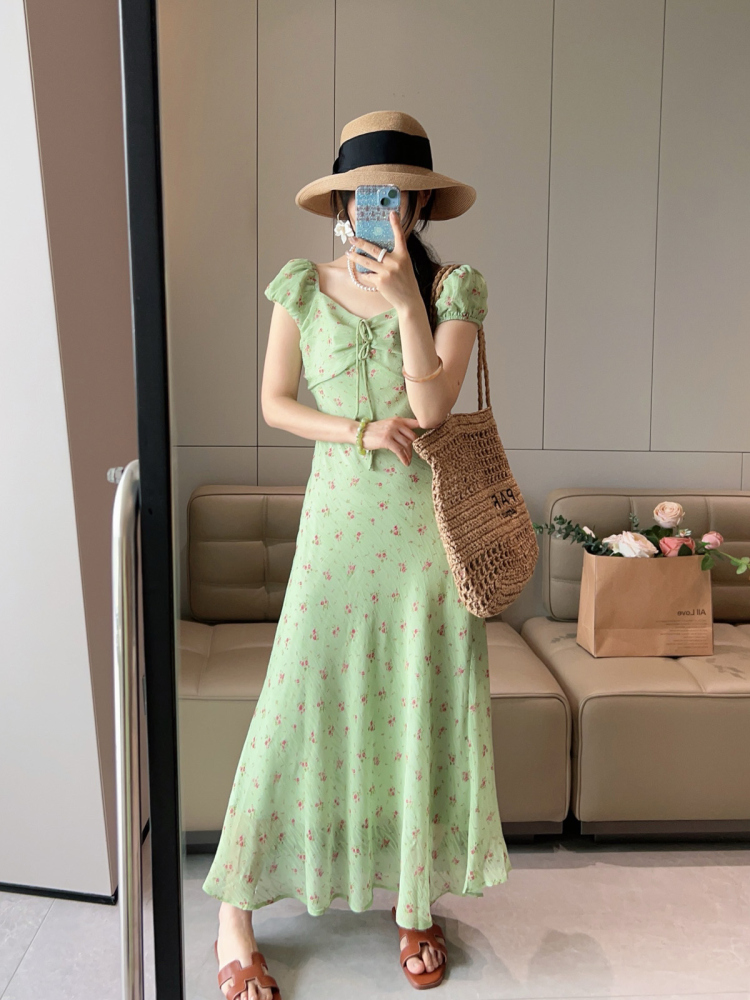 BY9179#法式复古方领绿色碎花短袖连衣裙女2025夏季新款收腰显瘦气质长裙