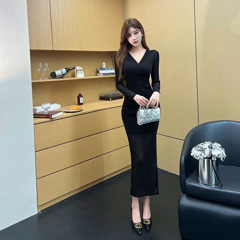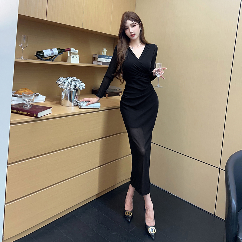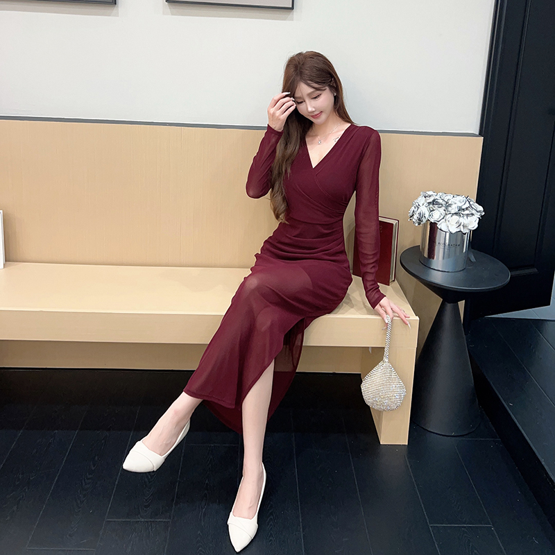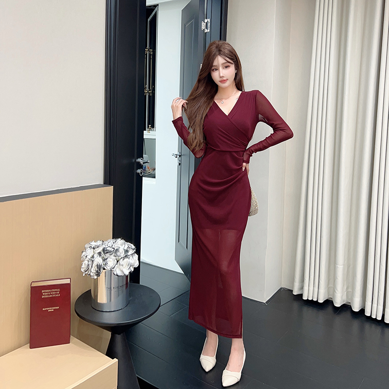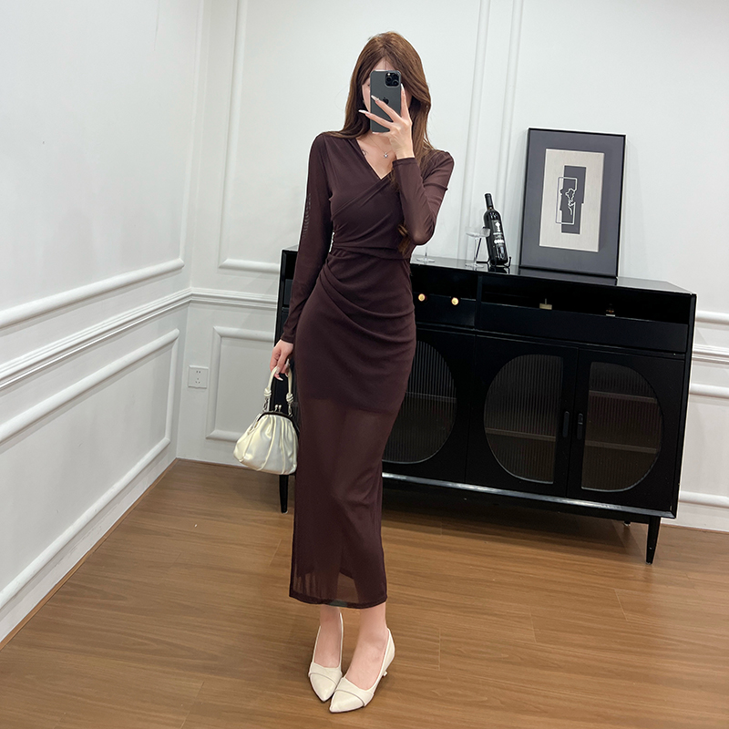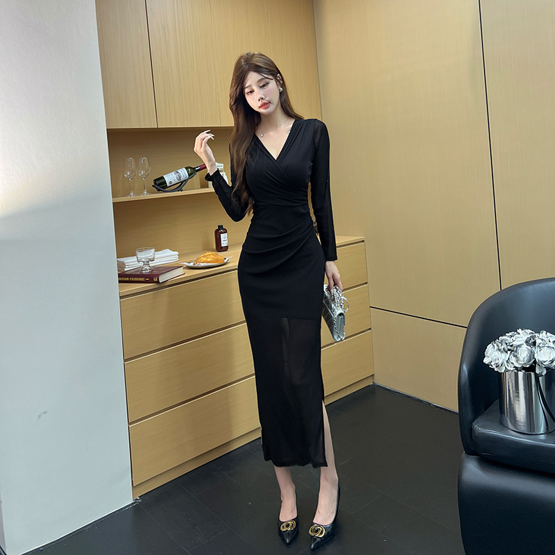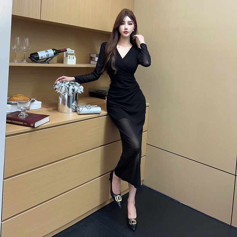 MY15245# 新款网纱长款裙子修身显瘦打底包臀长袖中长款开叉连衣裙女裝貨源服裝批發