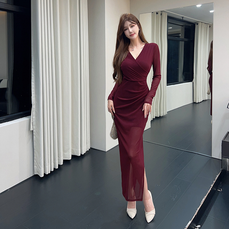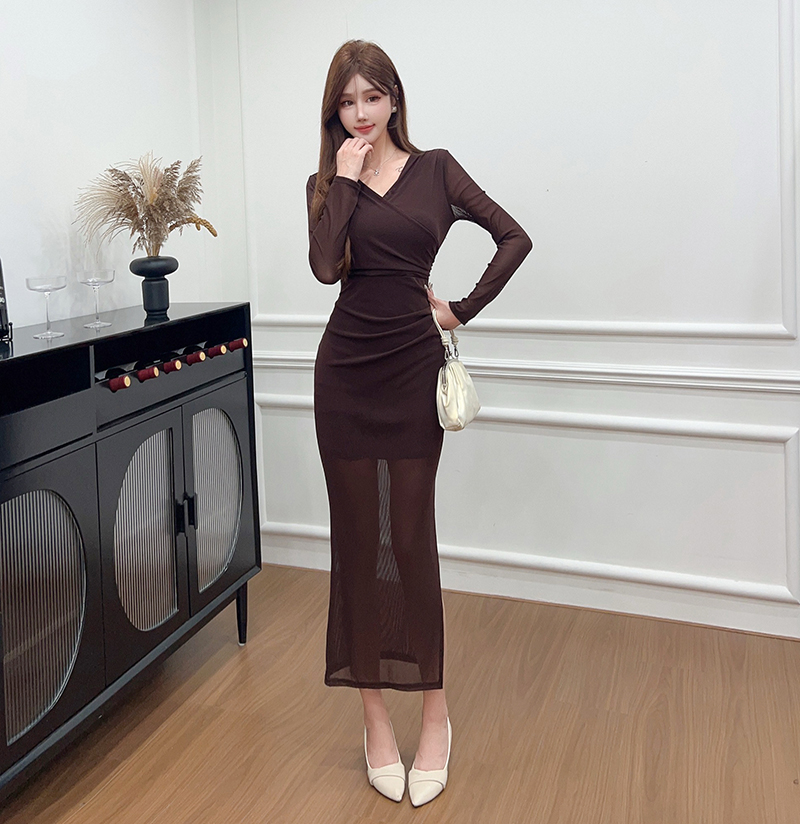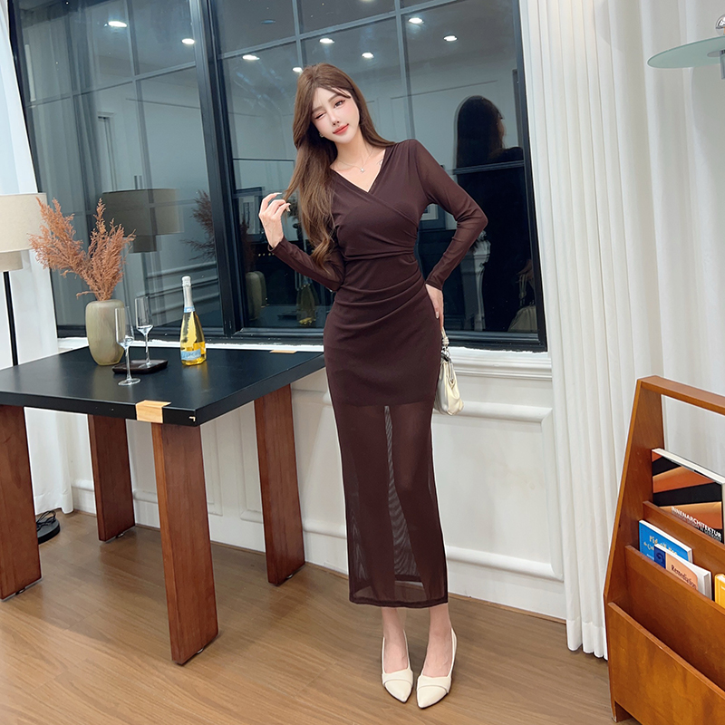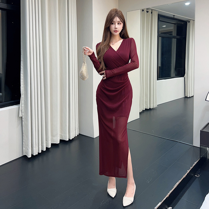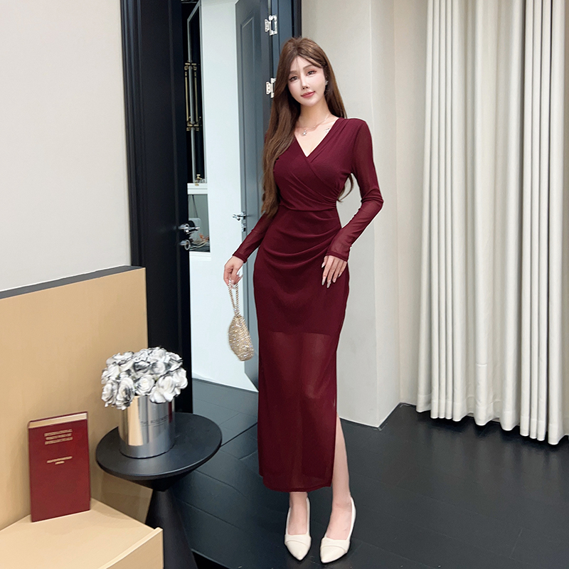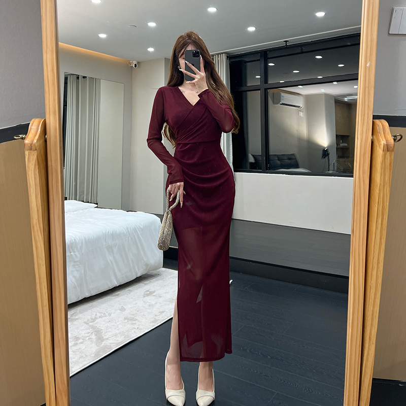 MY15245# 新款网纱长款裙子修身显瘦打底包臀长袖中长款开叉连衣裙女裝貨源服裝批發