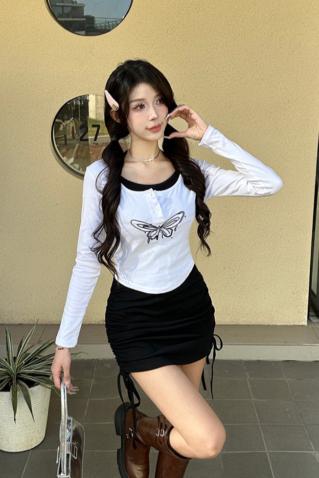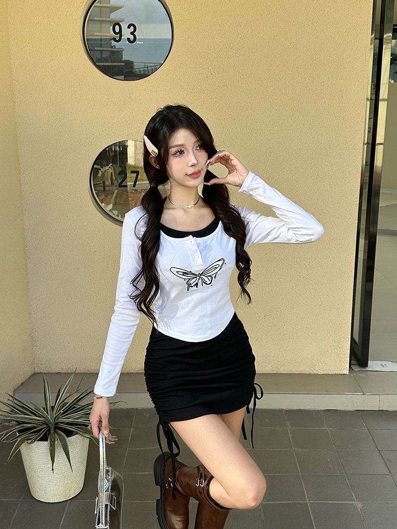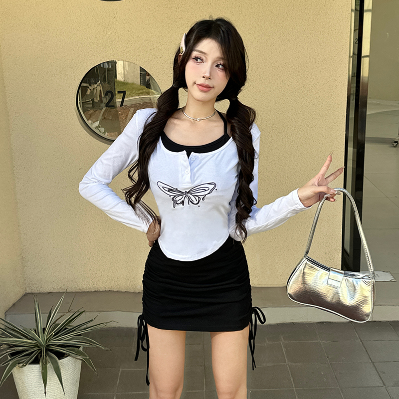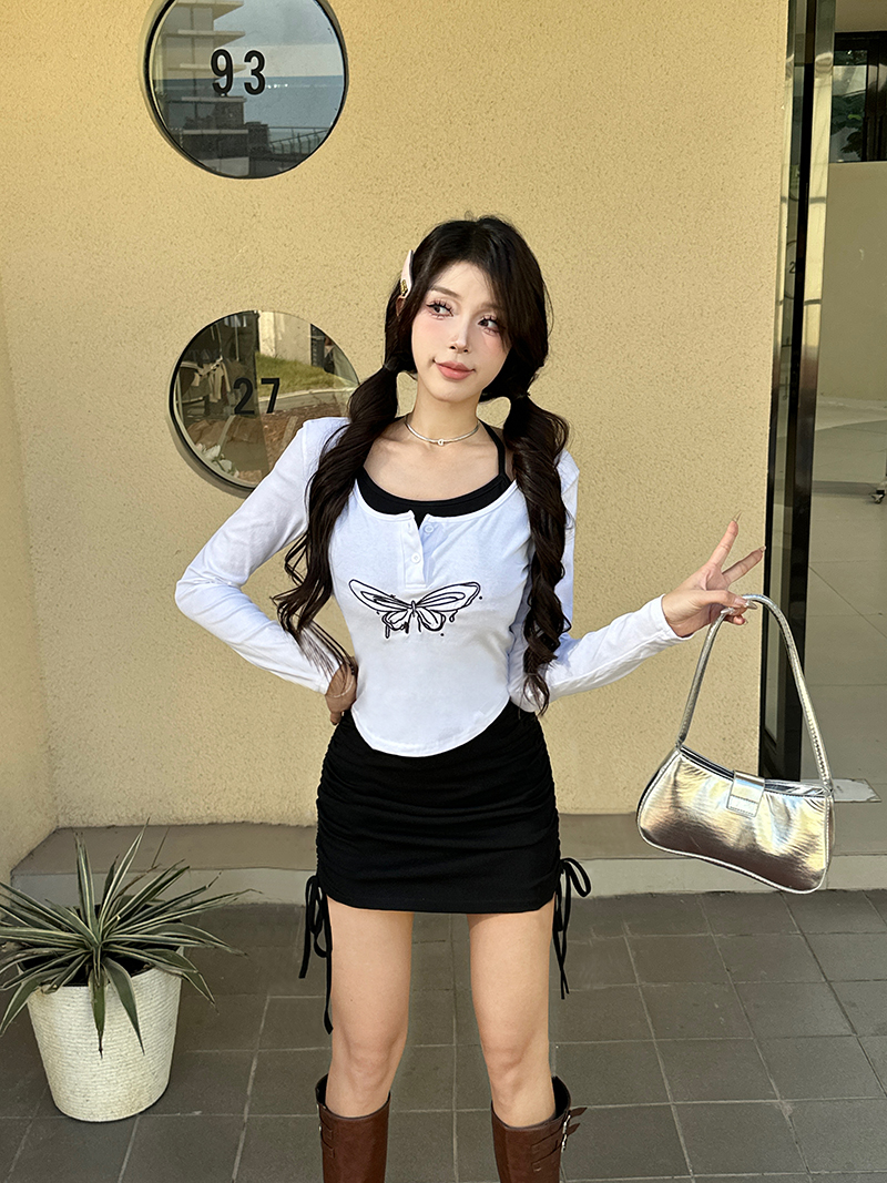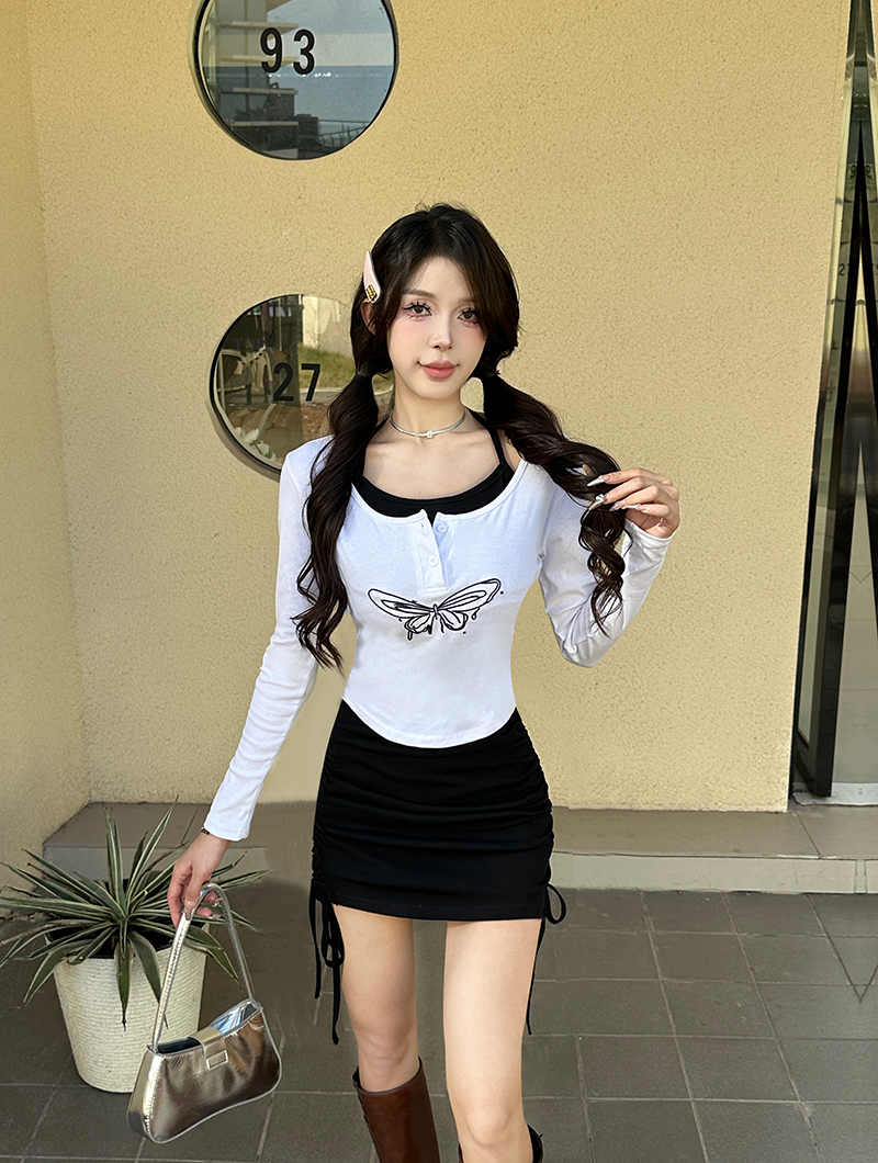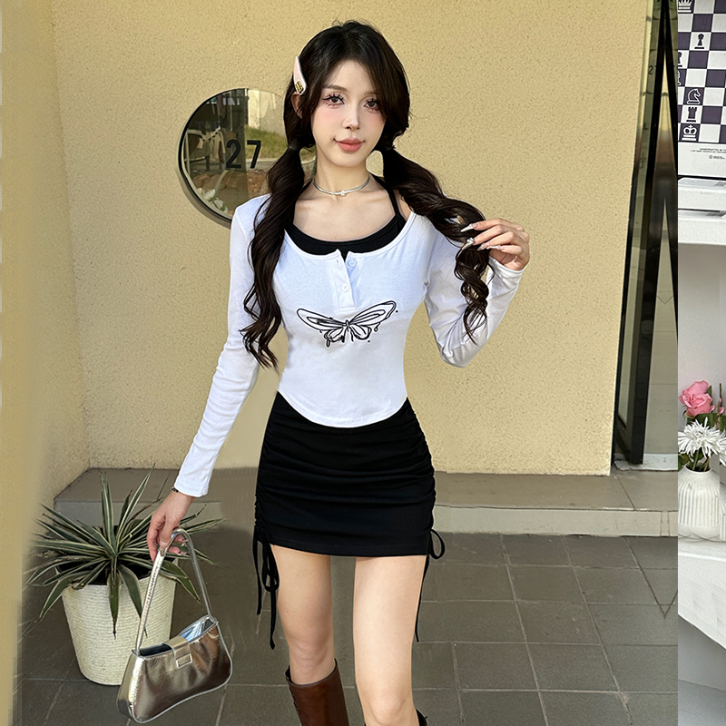 MY15246# 新款长袖T恤上衣+性感挂脖无袖包臀连衣裙套装女裝貨源服裝批發