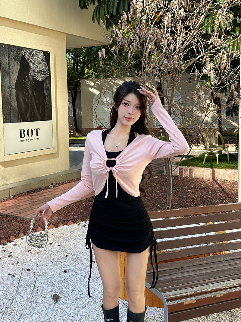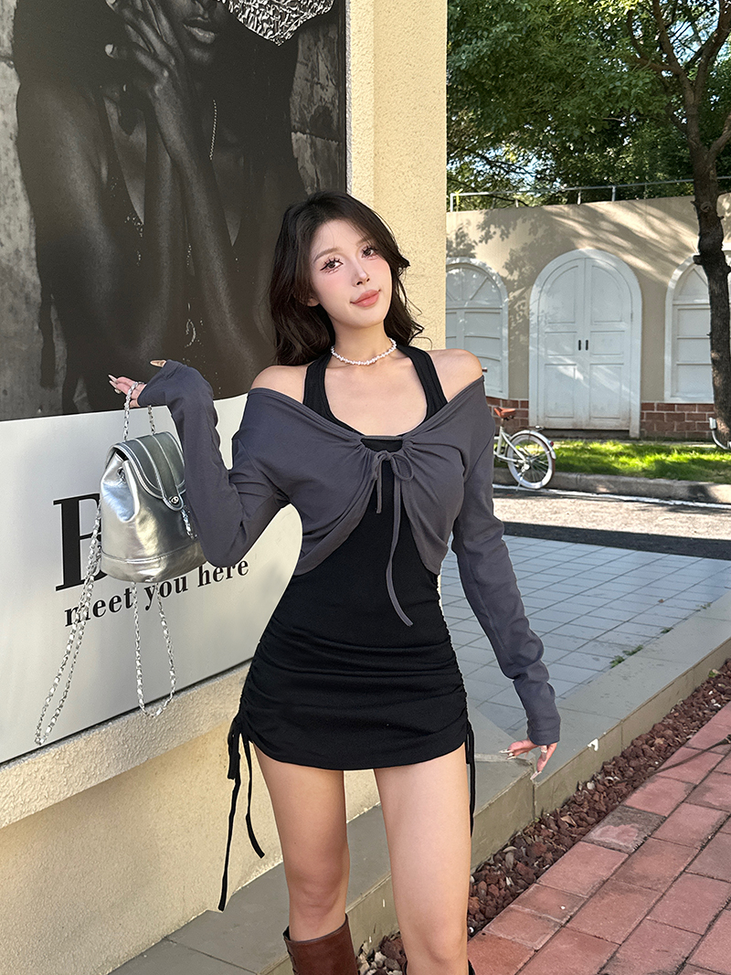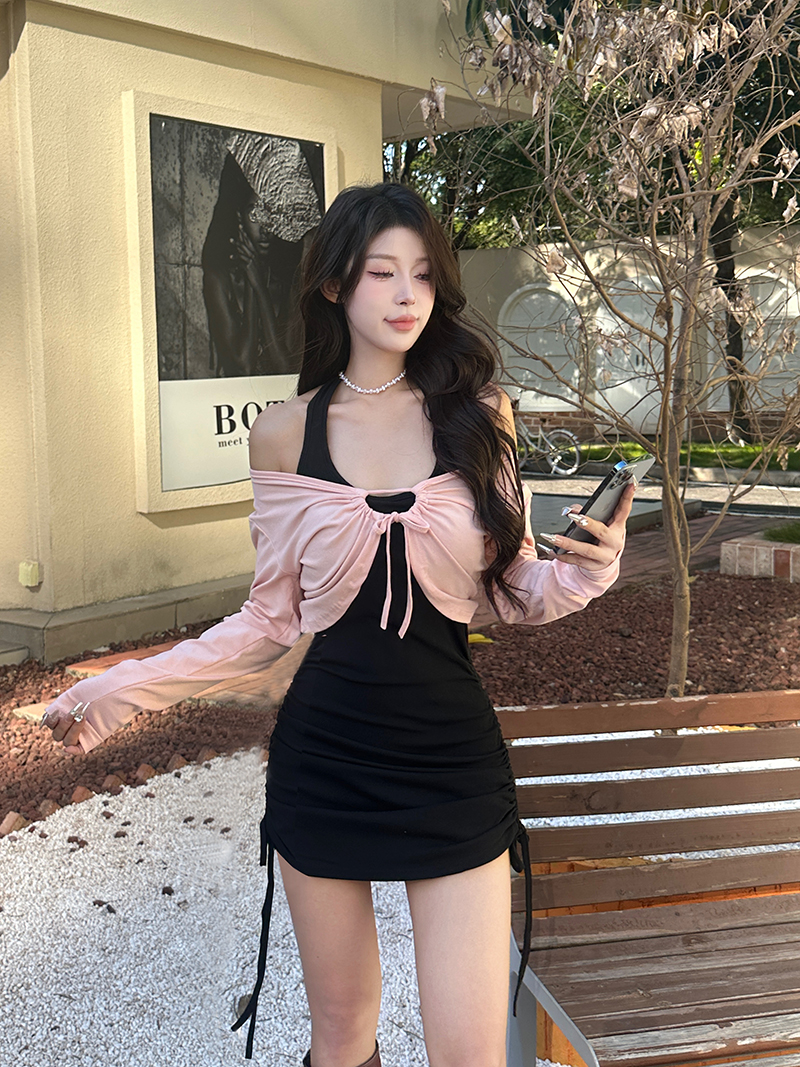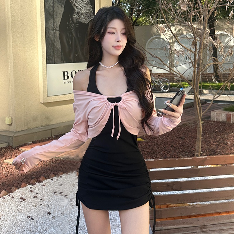 MY15247# 新款休闲开衫外套+气质挂脖无袖背心连衣裙套装女裝貨源服裝批發