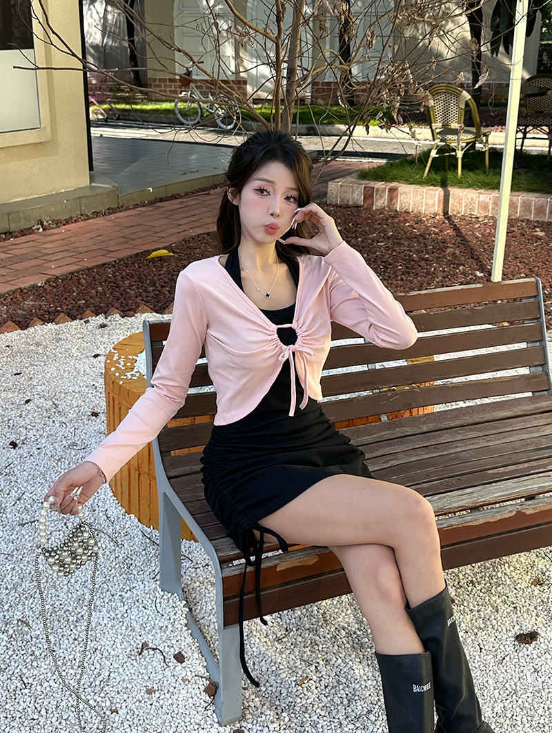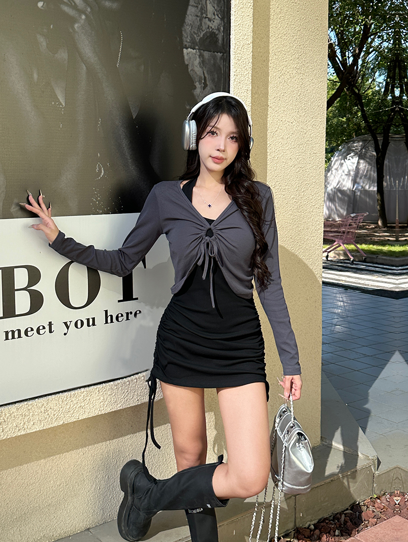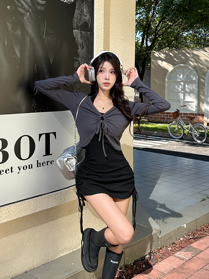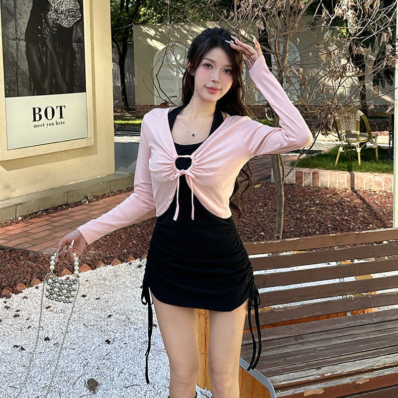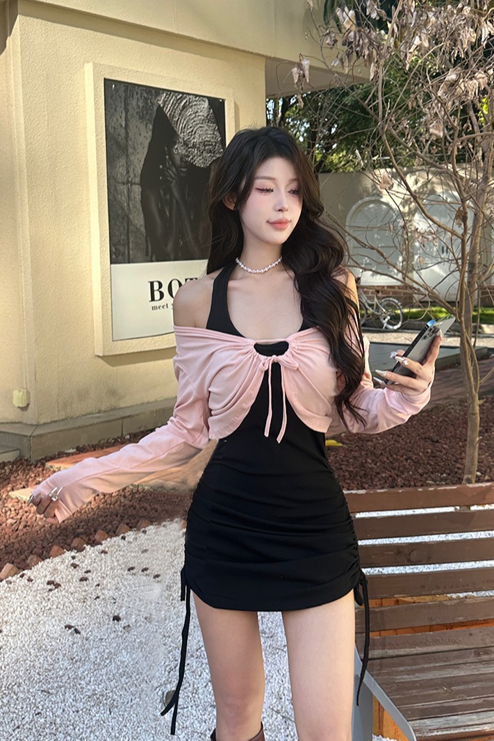 MY15247# 新款休闲开衫外套+气质挂脖无袖背心连衣裙套装女裝貨源服裝批發
