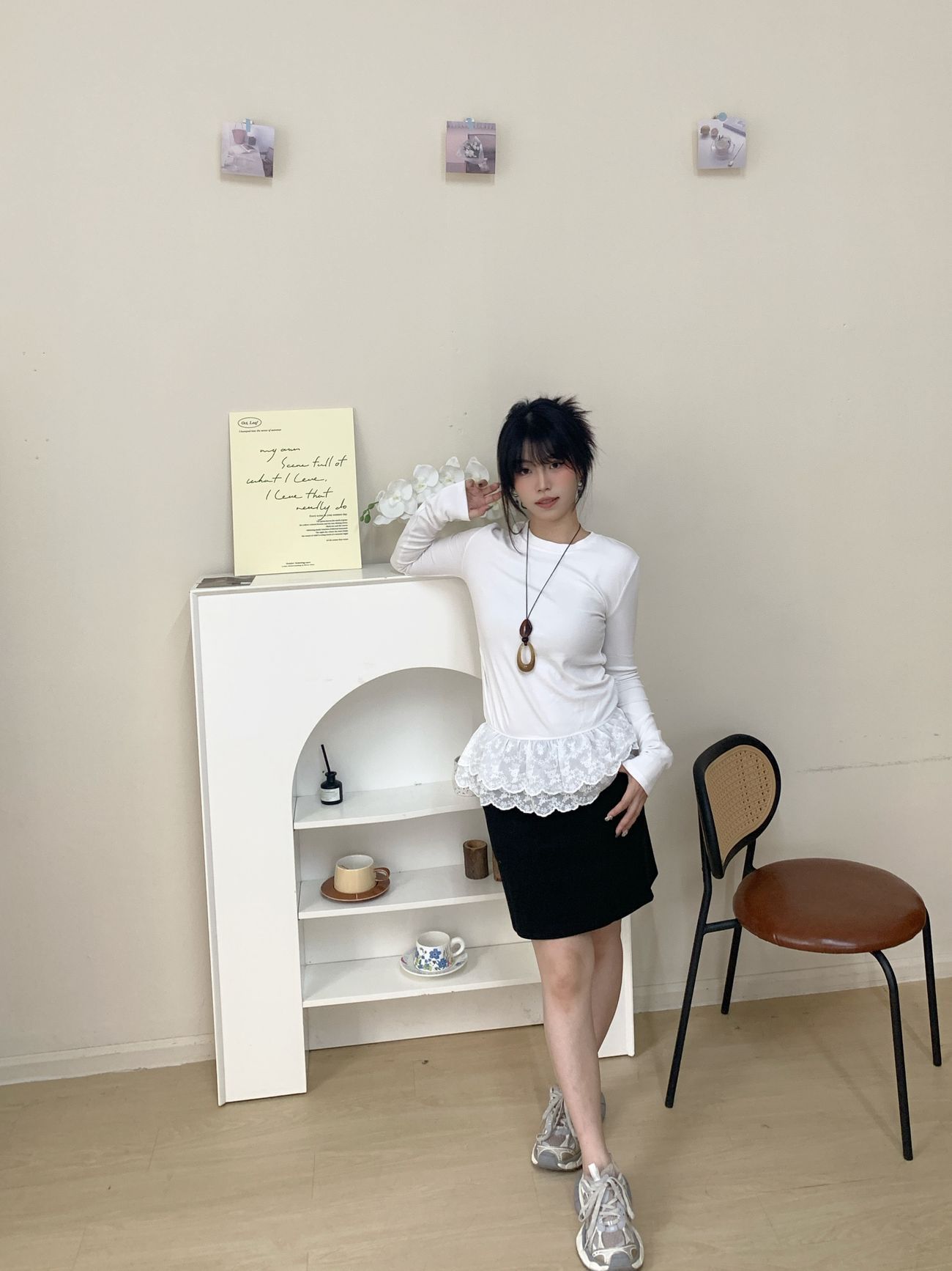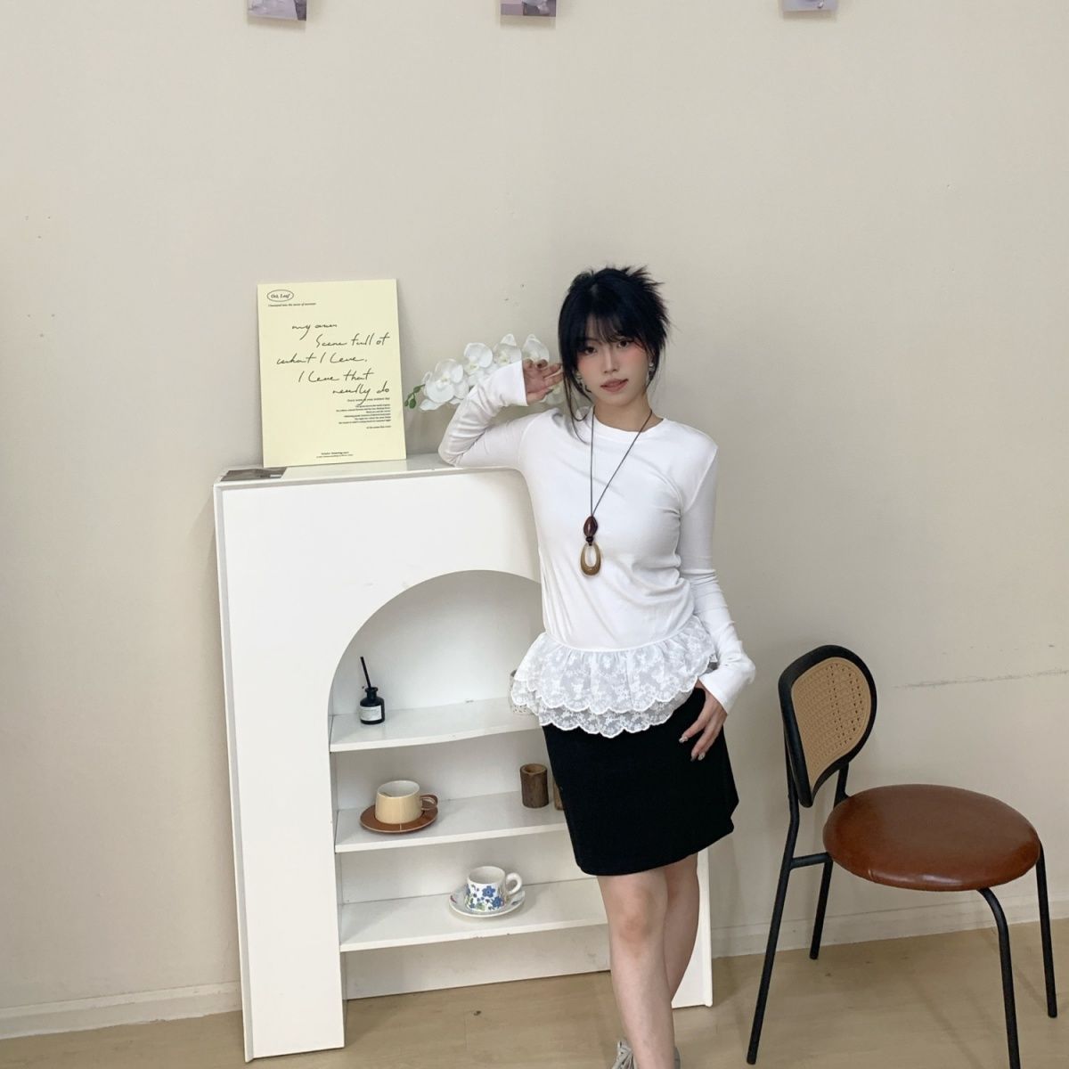 MY15255# 法式设计感小众韩系蕾丝花边拼接修身内搭叠穿打底衫白色上衣t恤女裝貨源服裝批發