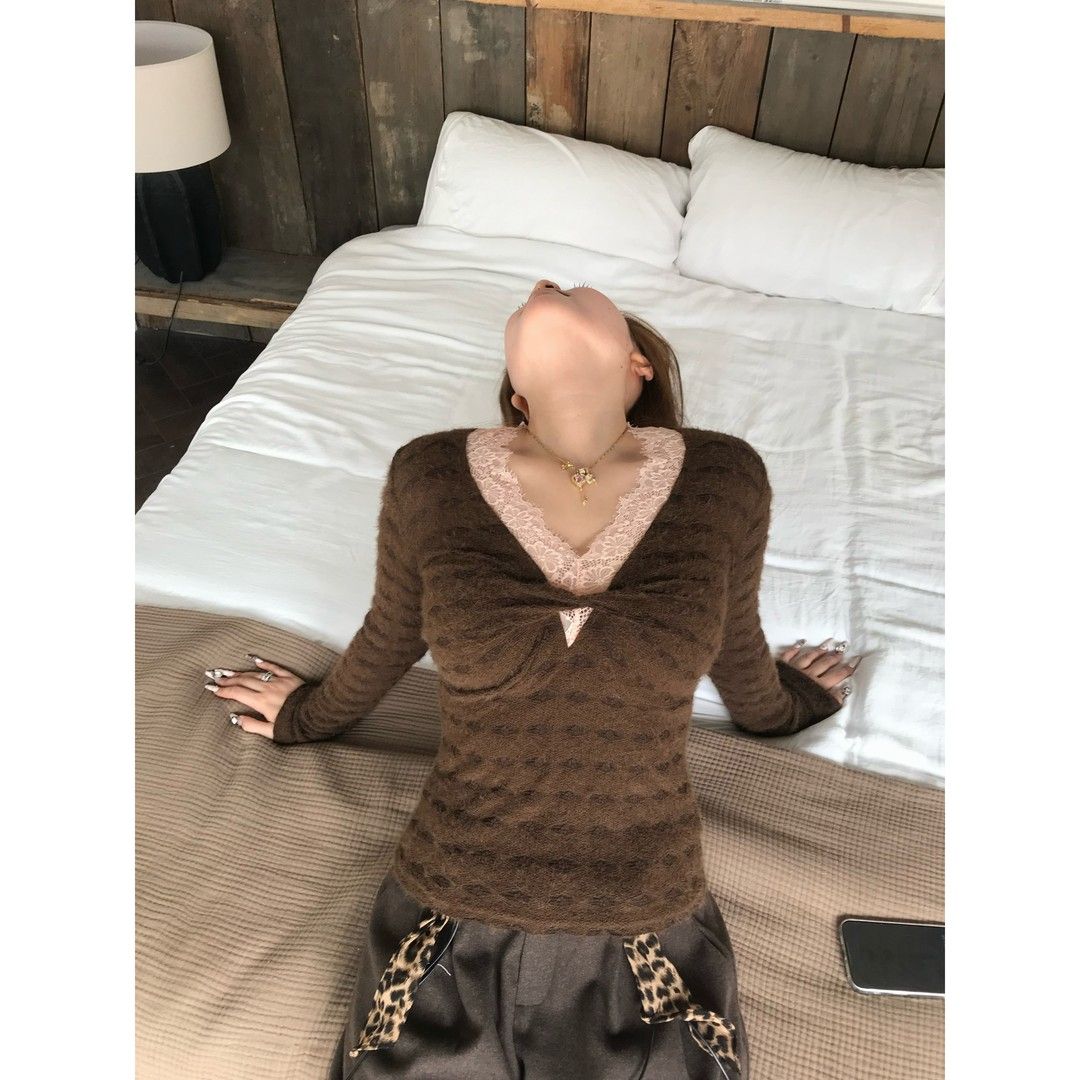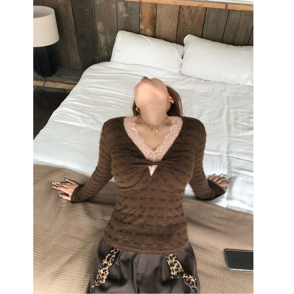 MY15258# 蕾丝v领假两件长袖t恤设计感拼接打底上衣女裝貨源服裝批發