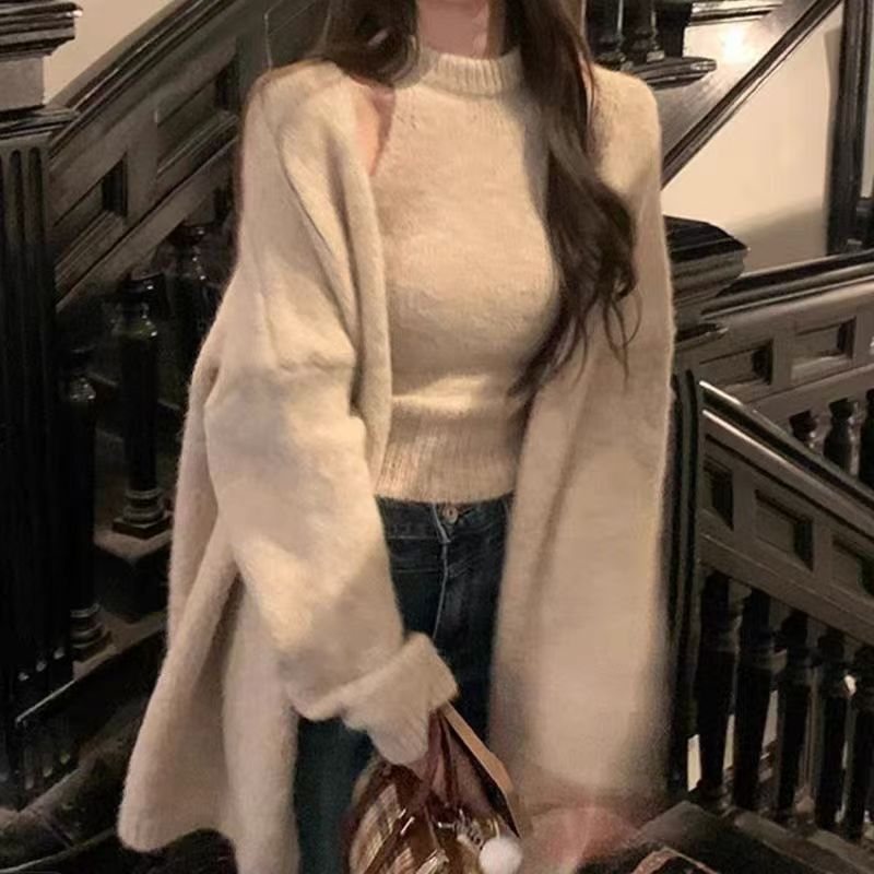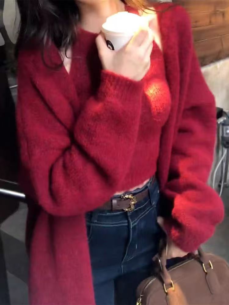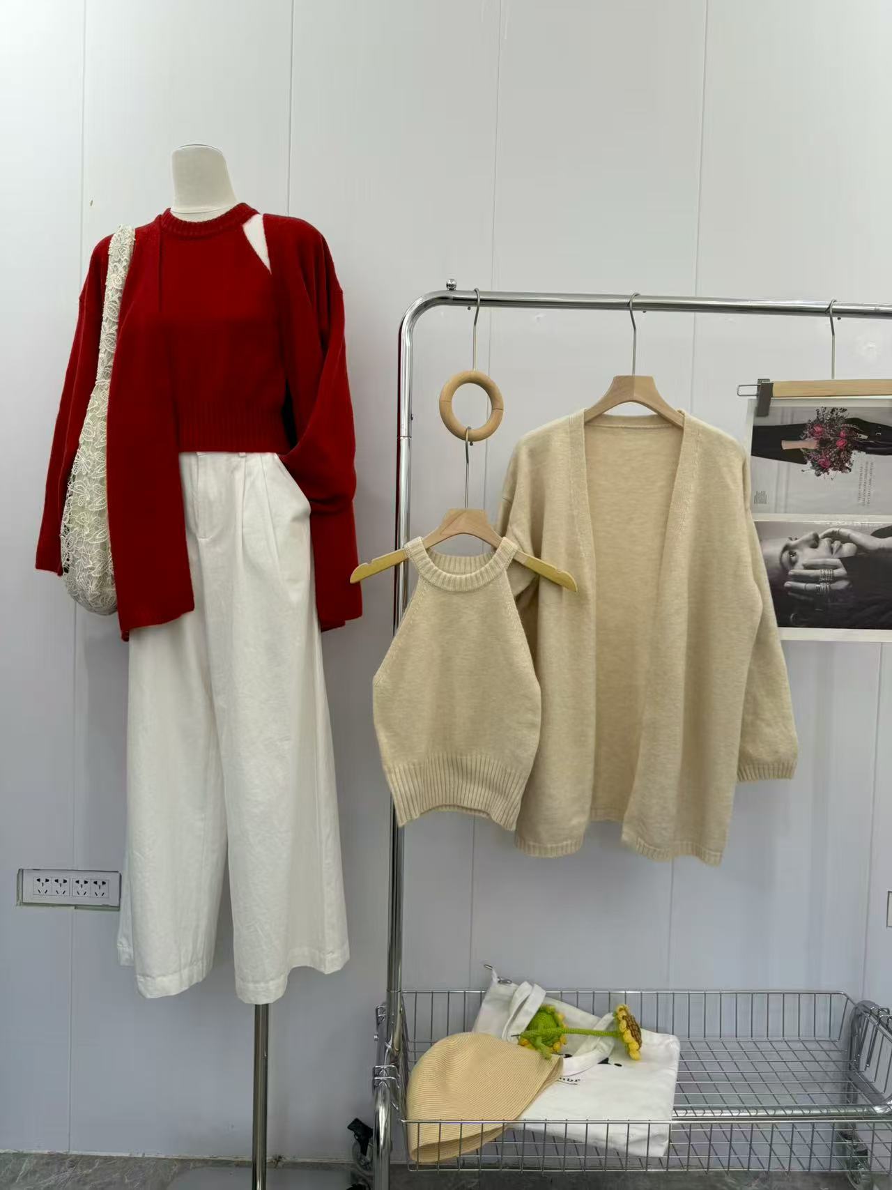 MY15260# 慵懒风圣诞红色毛衣开衫外套女秋冬内搭针织背心新款上衣套装女裝貨源服裝批發